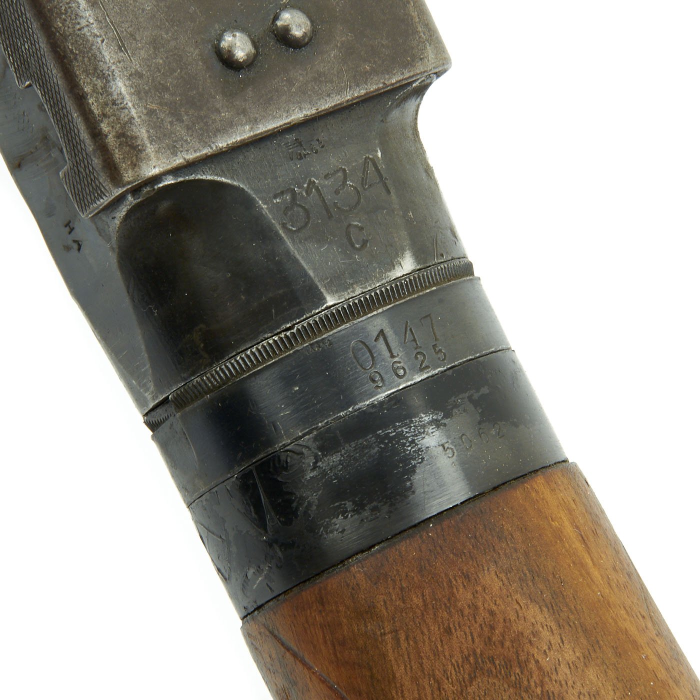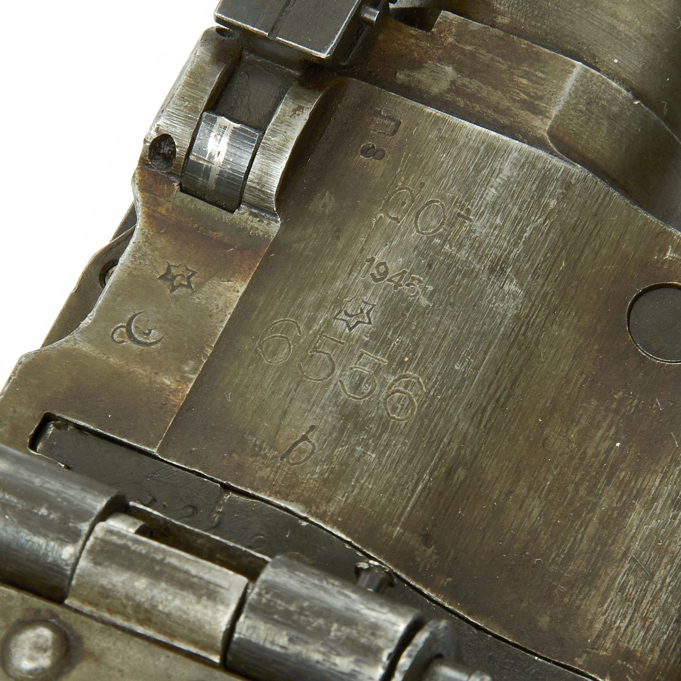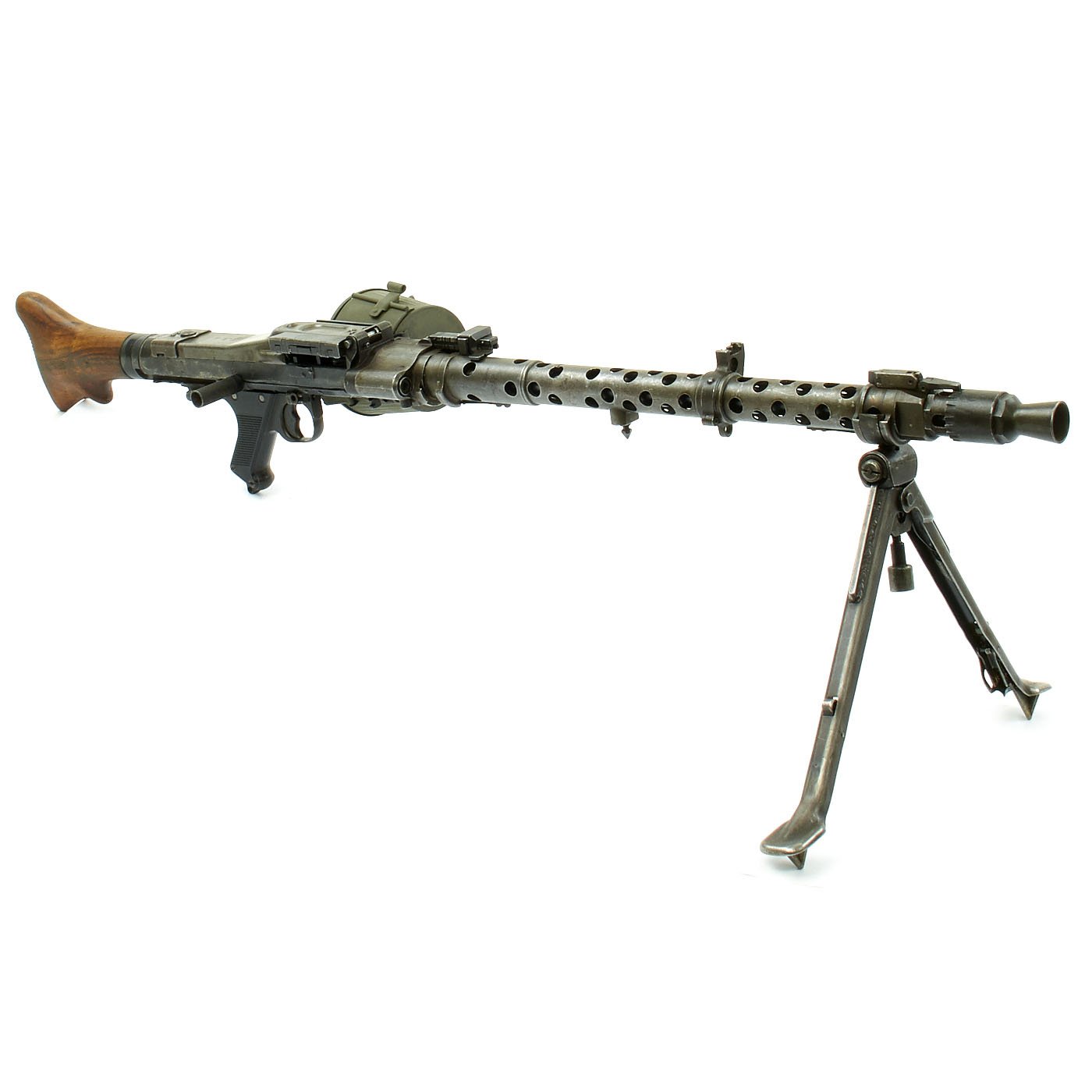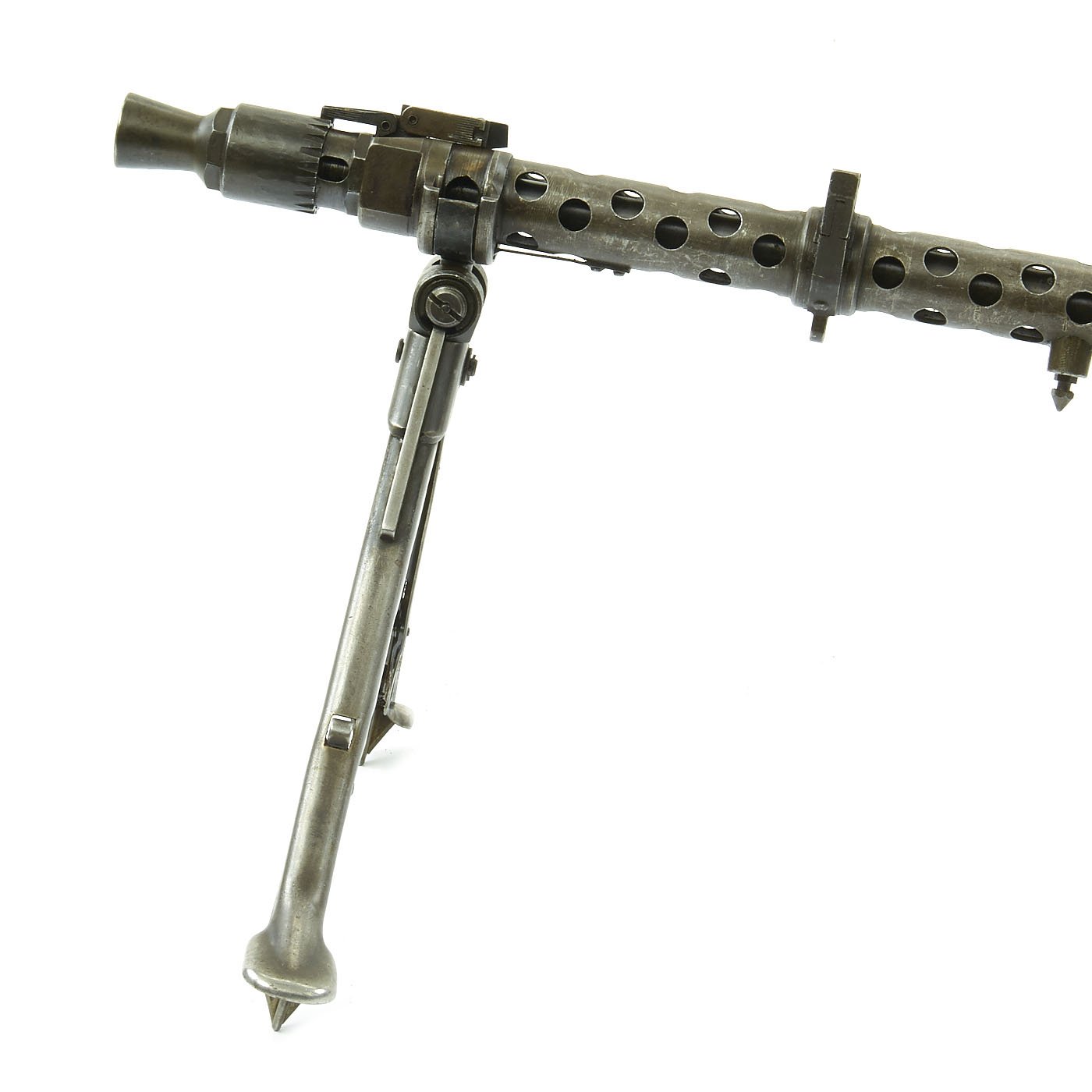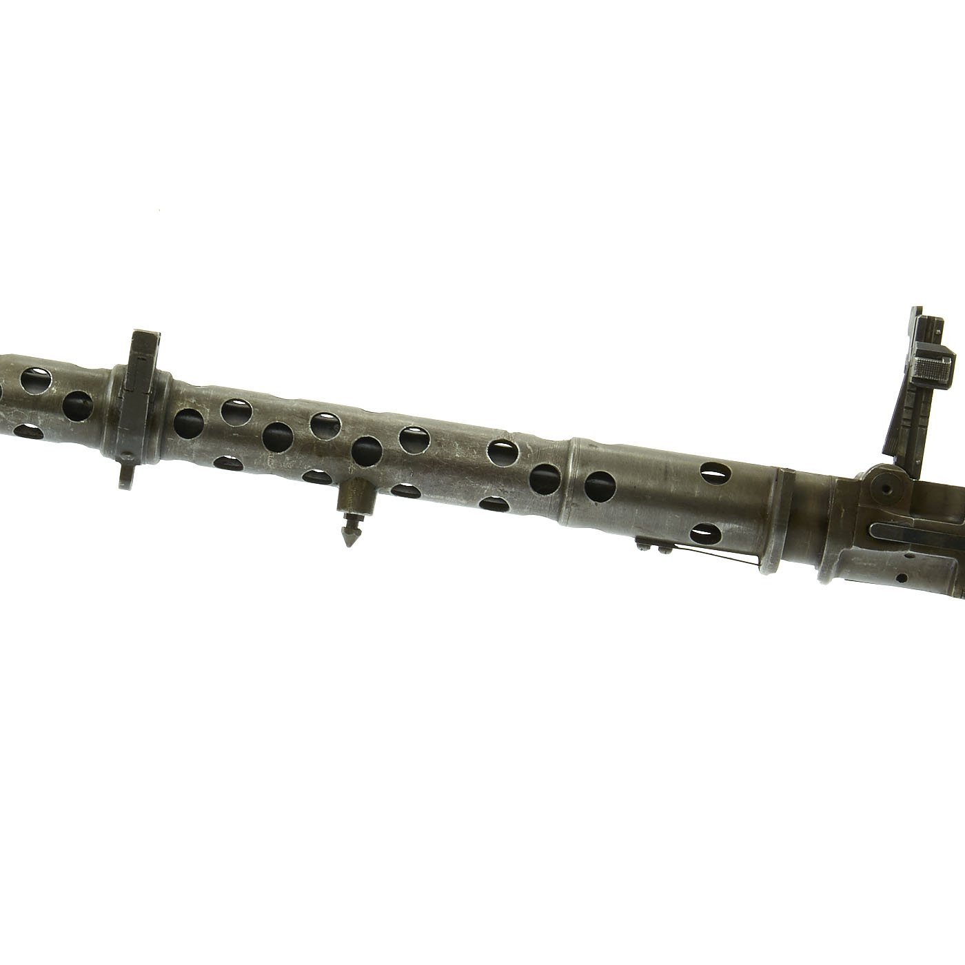 Original Item: Only One available! This is one of our original WWII issue MG34 display machine guns. It is coded along with multiple German wartime markings and has multiple waffen amts. It bears serial number 6556 / b on the barrel jacket, along with dot 1945 for the Brno factory in Czechoslovakia. The top cover bears serial number 494 / f along with maker code pem, a known subcontractor for MG-34 parts, which has never been identified. There are some great markings on this very fine example of the most prolific German issued Light Machine gun of WWII.