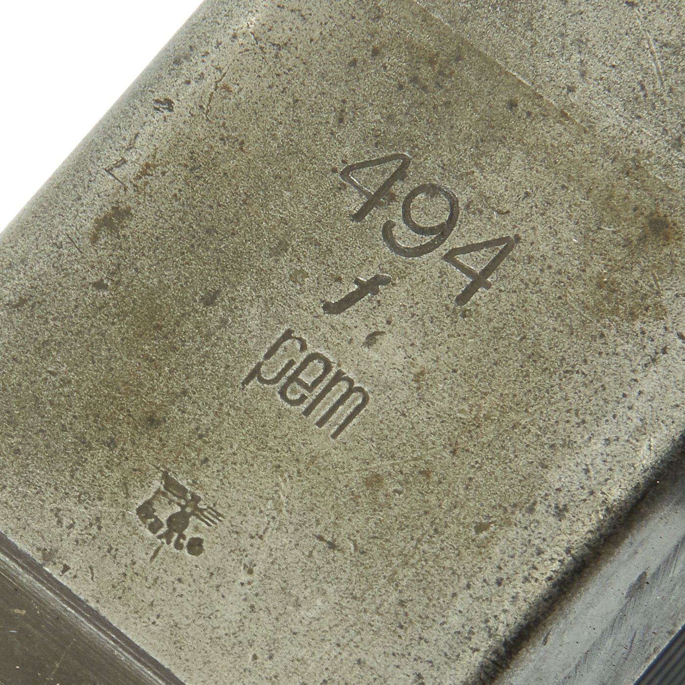 The bipod included is of the earlier war design, with a central height adjustment knob. It is marked 43 ?ec, for 1943 manufacture by a maker whose code is partly worn away. We looked at it with a 10x magnifier, and it is partly worn away, so we were unable to determine the maker. Feed tray is marked with what appears to be cof for Carl Eickhorn, Solingen, a prolific manufacturer of edged weapons, and a known maker of feed trays. Thee are also multiple Waffenamt inspection proofs all over the display gun.