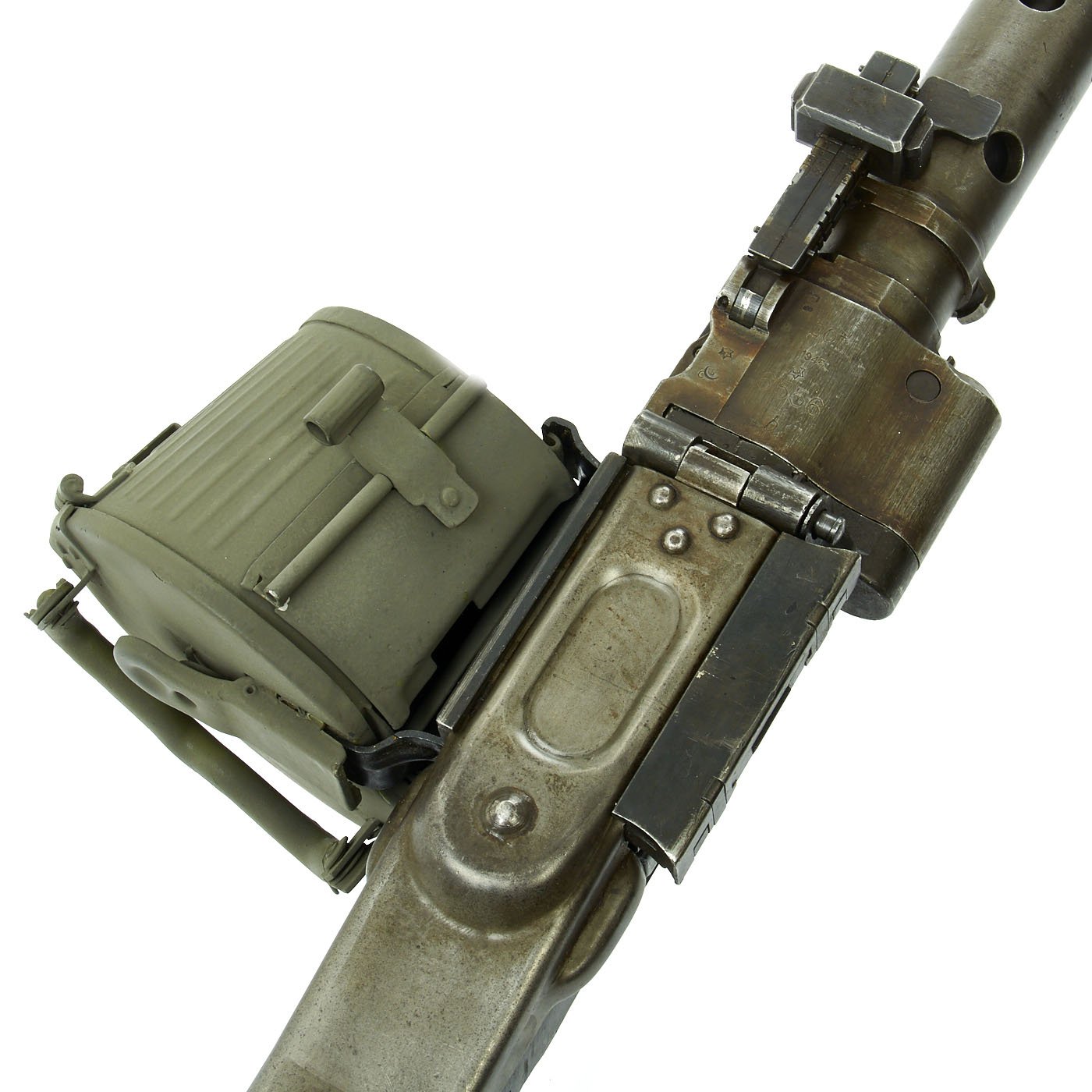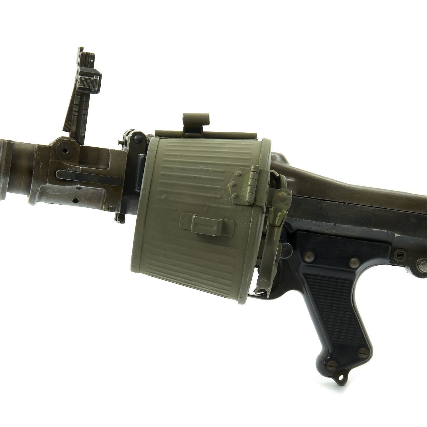 Comprised of nearly entirely original WWII parts, this display gun was reconstructed using a BATF approved receiver with 2 inches totally replaced with solid bar stock, making this an inert non-firing display gun. Comes complete with a post-war repainted basket belt drum. We have not had these available for years!