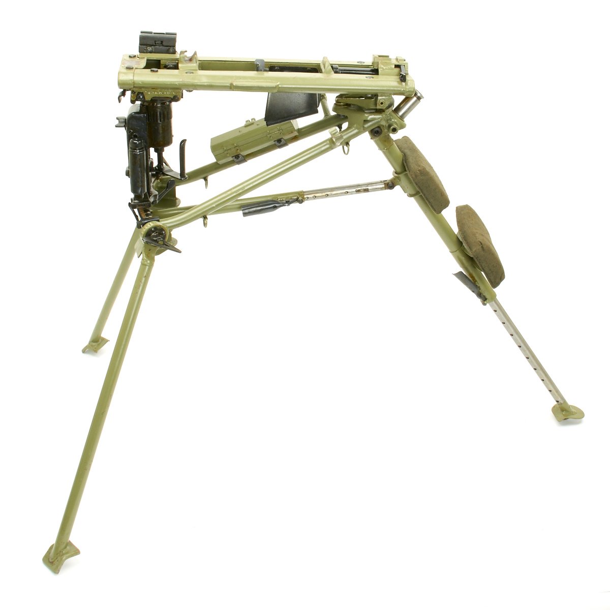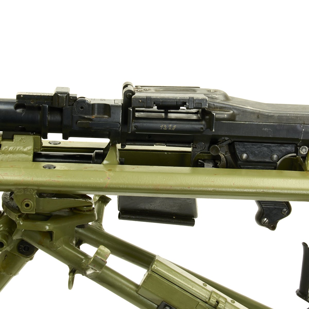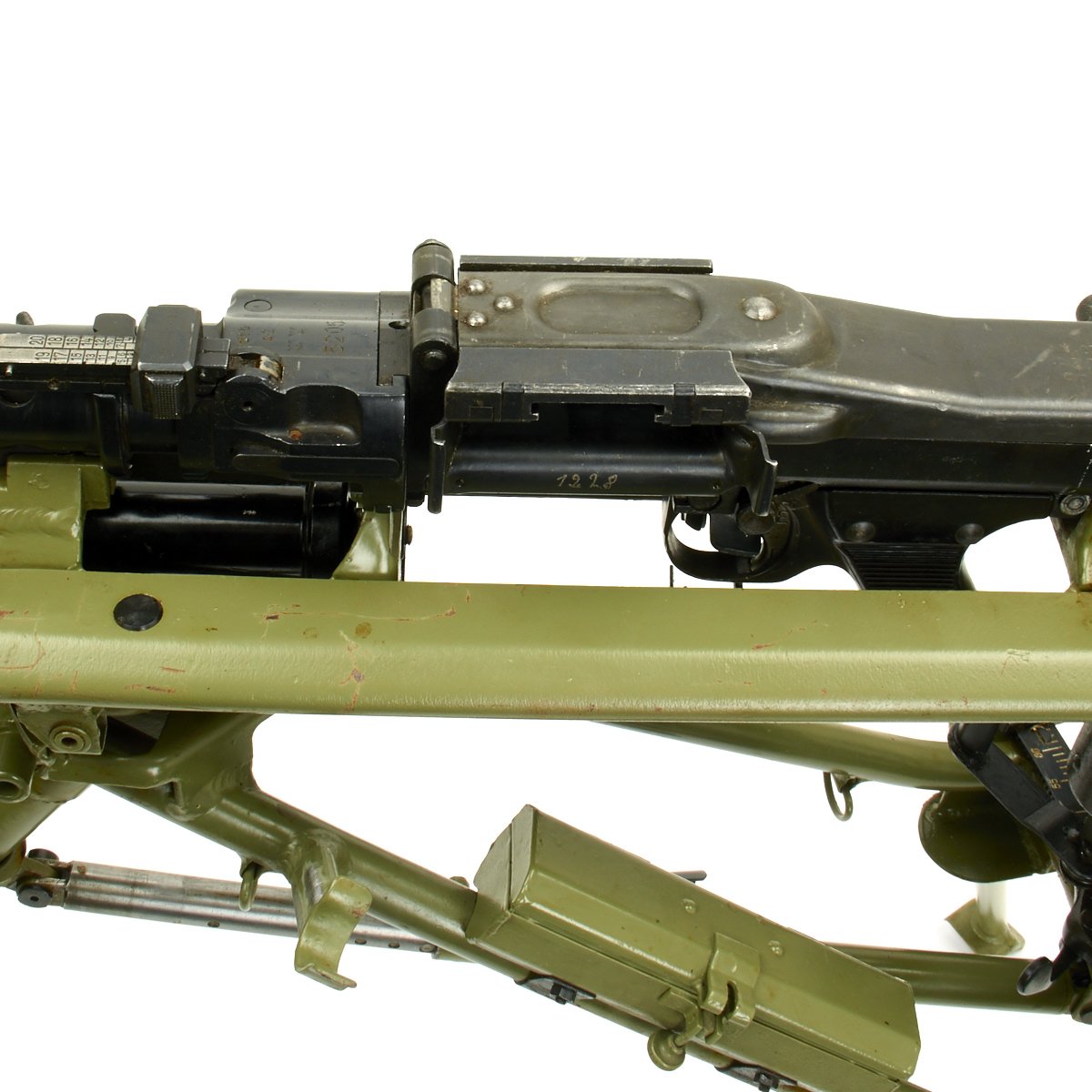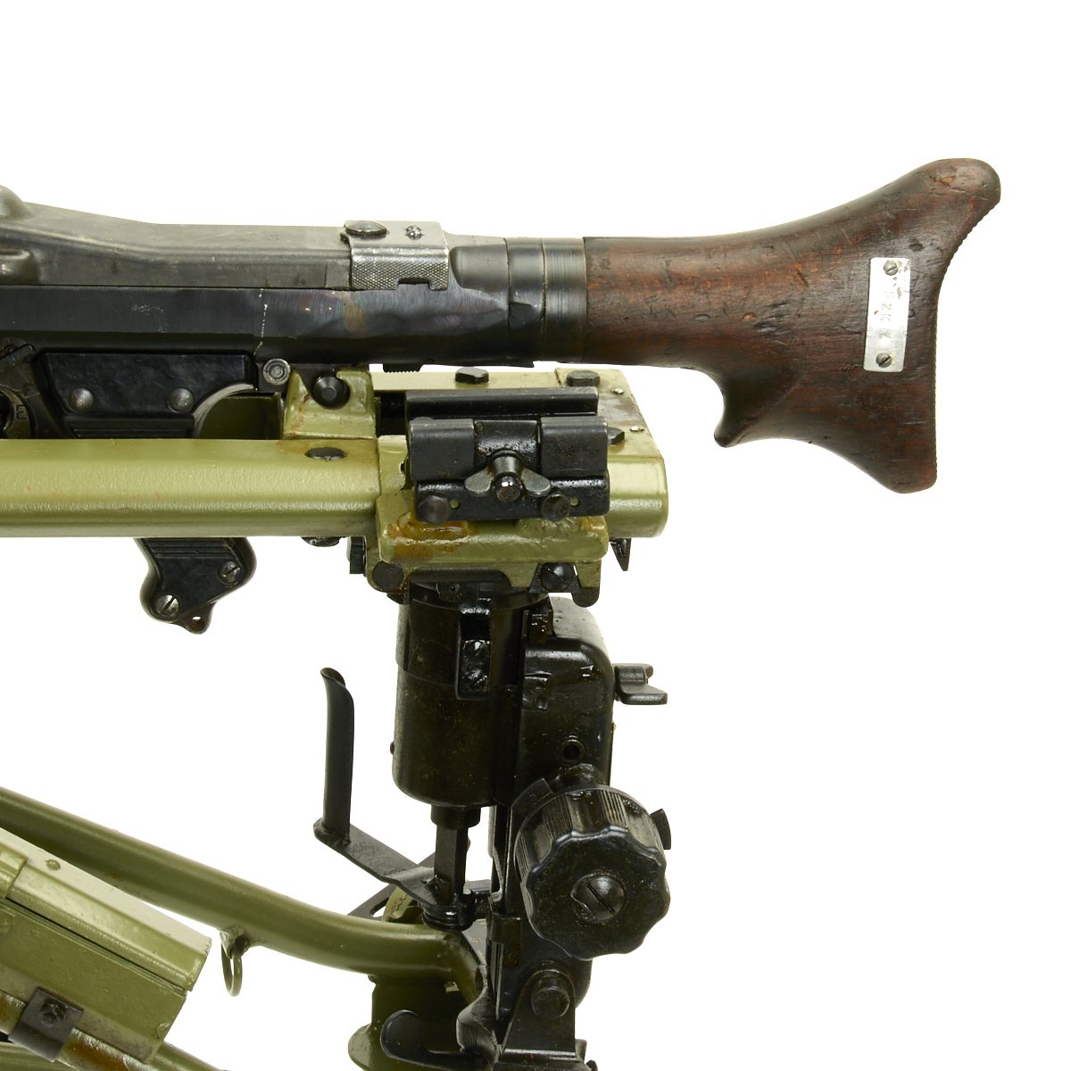 The Lafette included was made, possibly post war, for the MG42, and is in excellent condition. It is painted post war apple green, and does not have any wartime markings we could find, but they may have been removed post war. It attaches to the MG34 using an adapter plate that replaces the spring on the rear MG34 bipod mount. The original spring and screw are also included.