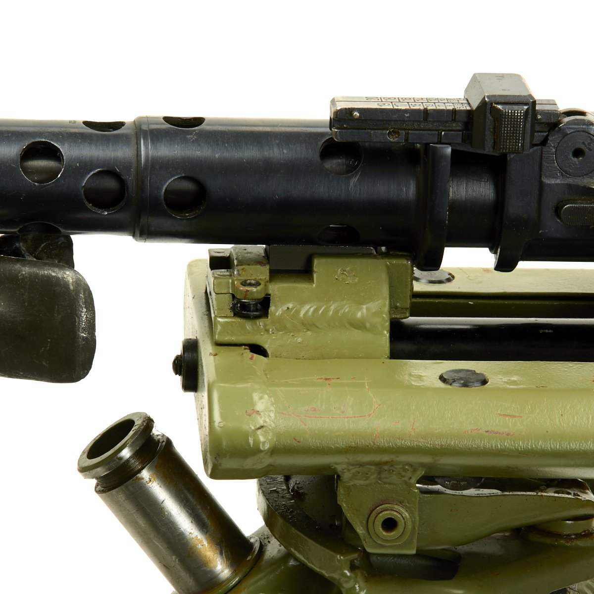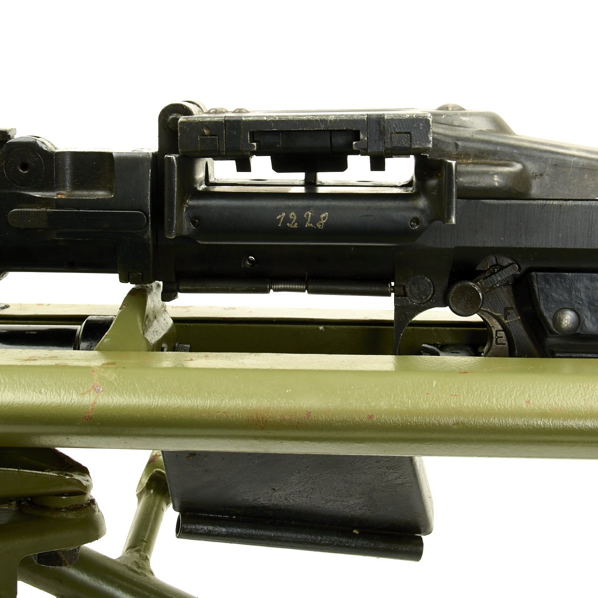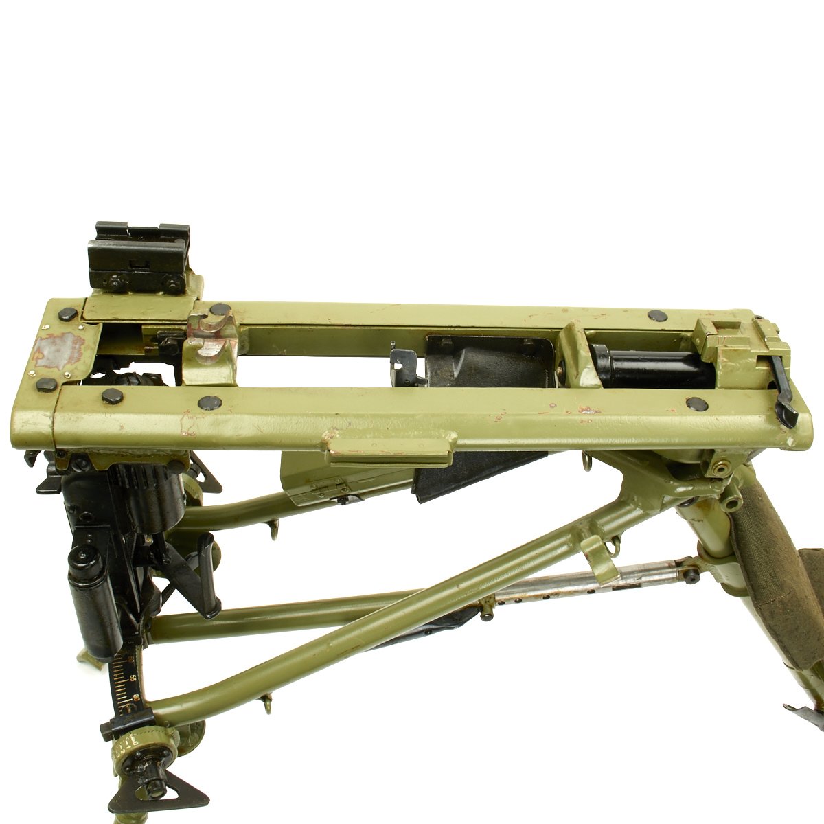 The Lafette included was made, possibly post war, for the MG42, and is in excellent condition. It is painted post war apple green, and does not have any wartime markings we could find, but they may have been removed post war. It attaches to the MG34 using an adapter plate that replaces the spring on the rear MG34 bipod mount. The original spring and screw are also included.
