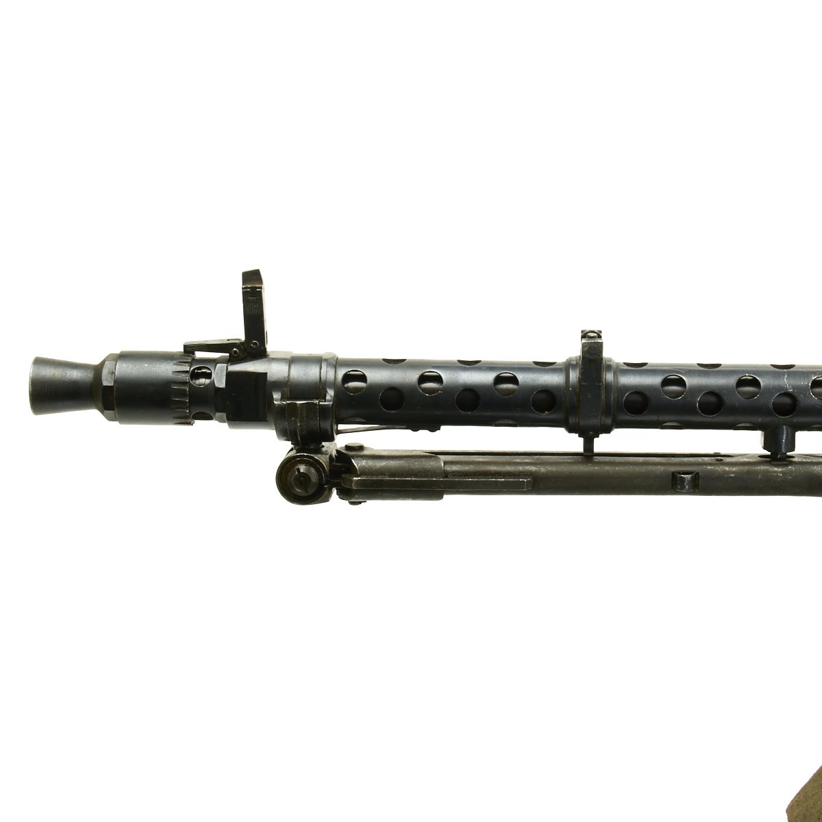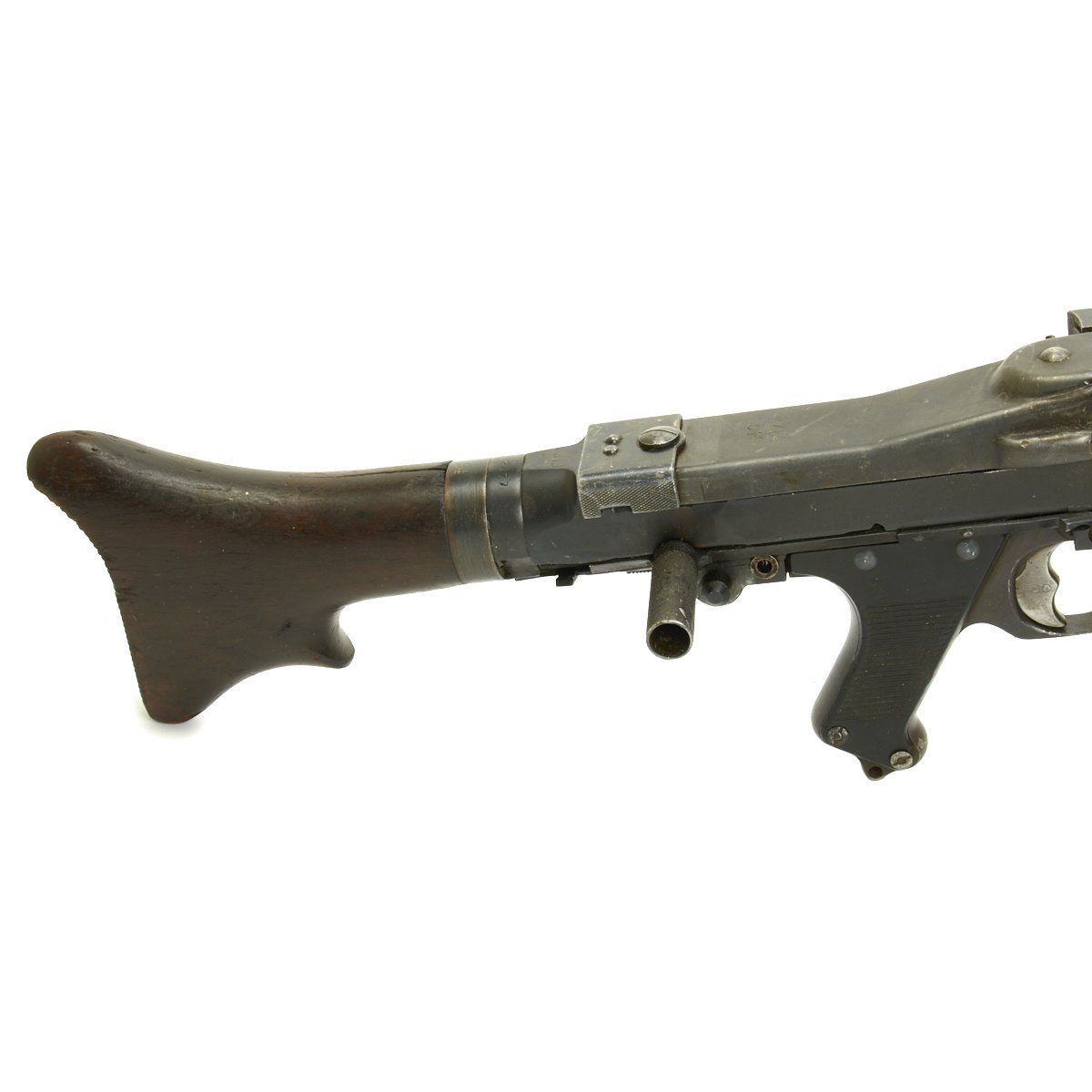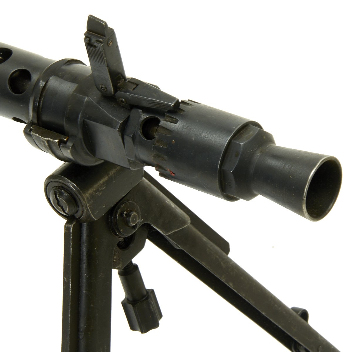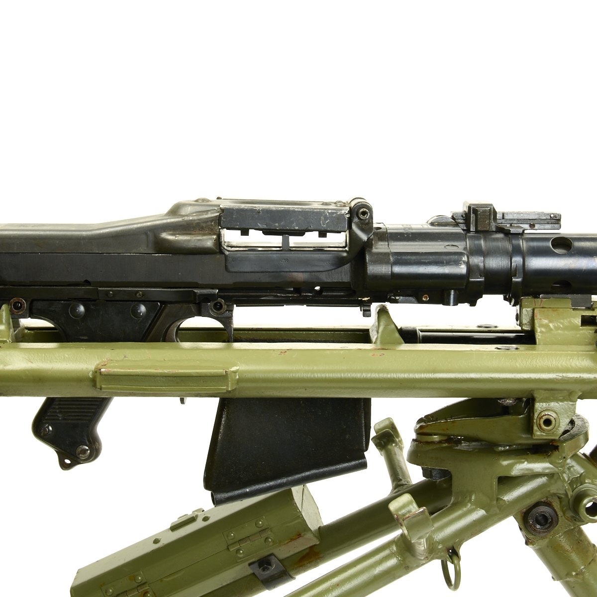 The Lafette included was made, possibly post war, for the MG42, and is in excellent condition. It is painted post war apple green, and does not have any wartime markings we could find, but they may have been removed post war. It attaches to the MG34 using an adapter plate that replaces the spring on the rear MG34 bipod mount. The original spring and screw are also included.
