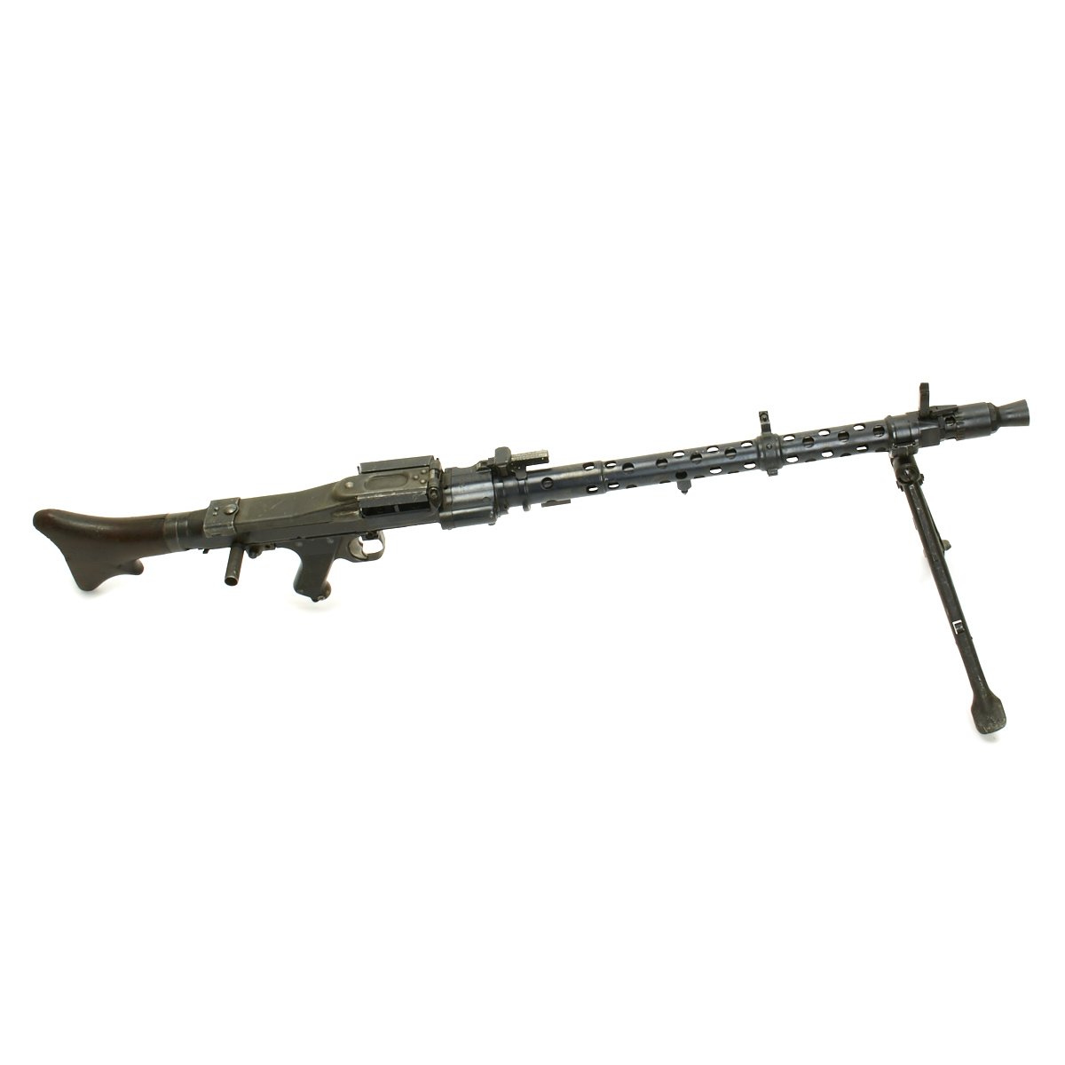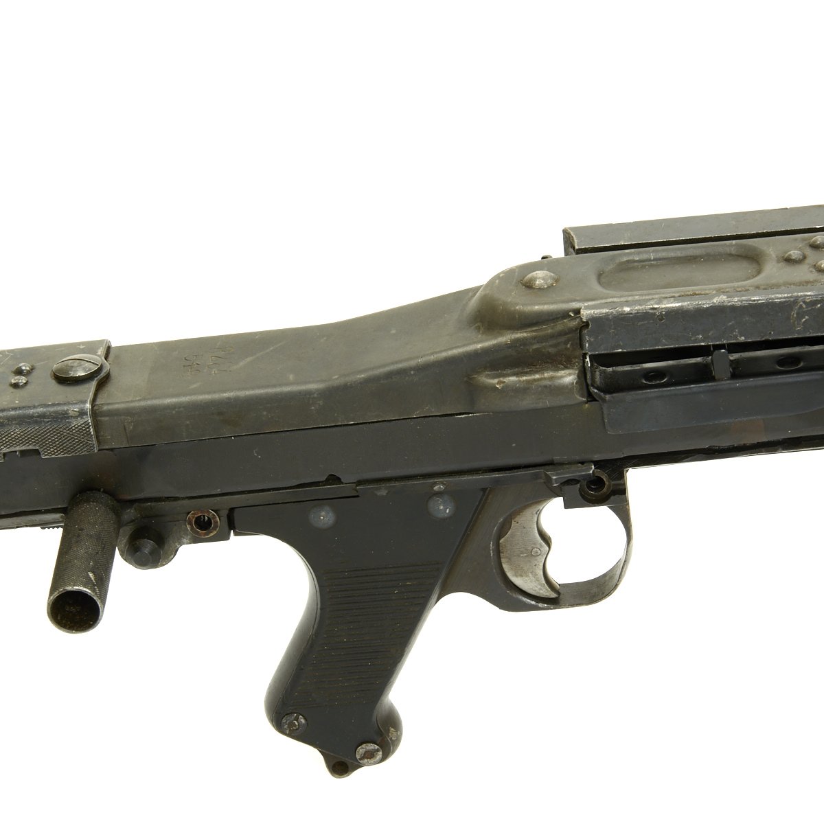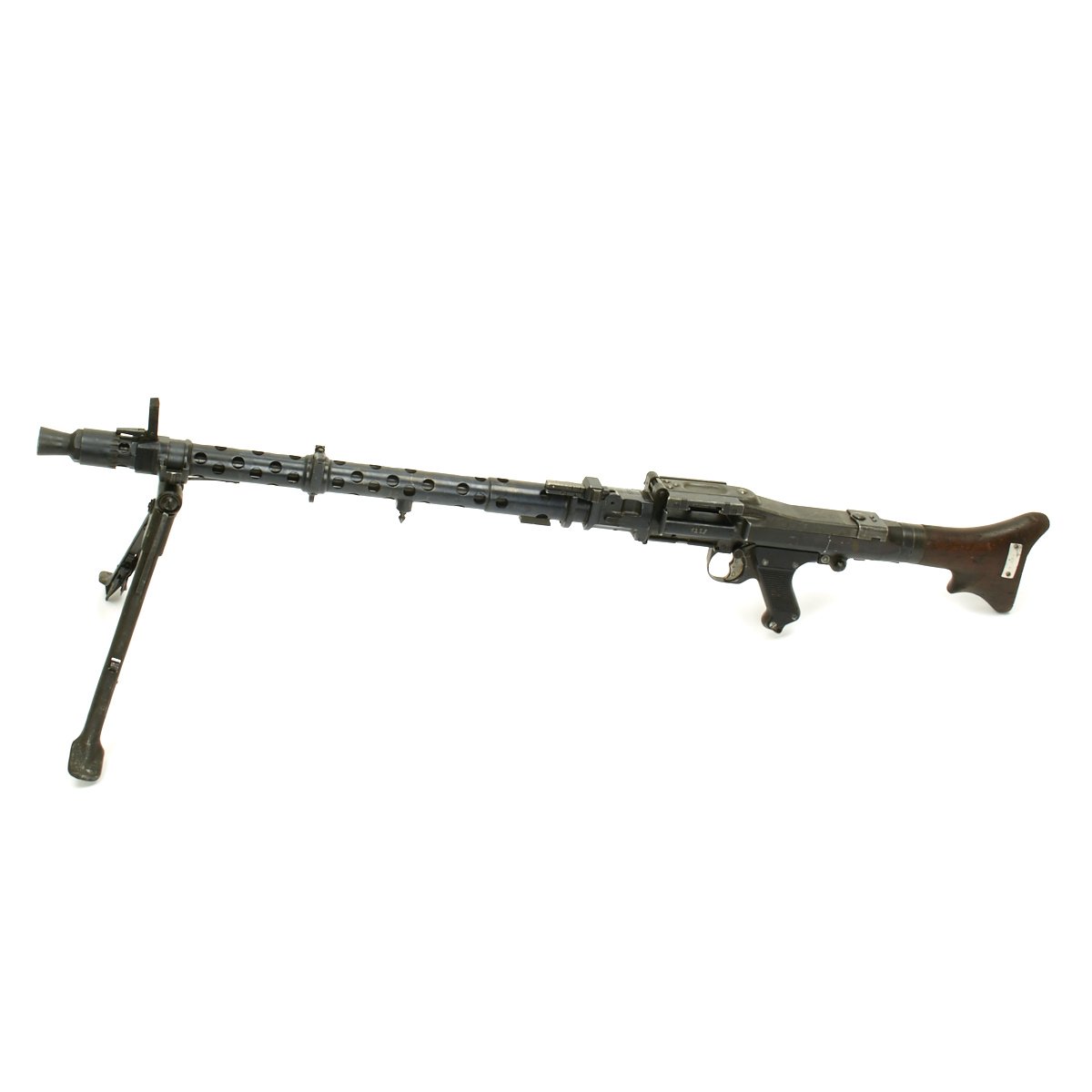 Original Item: Only One available! This is one of our original WWII issue MG34 display machine guns, mounted on an original MG42 Lafette Tripod using an adapter plate that attaches to the rear bipod mount spring location.. It is coded along with multiple German wartime markings and has multiple waffen amts. It bears serial number 5205 on the barrel jacket, along with dfb 42 for the Gustloff-Werke, Waffenwekr Suhl. The top cover bears serial number 8284 on this very fine example of the most prolific German issued Light Machine gun of WW2.
