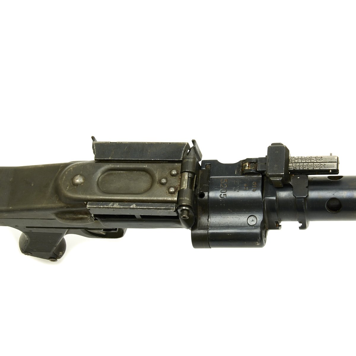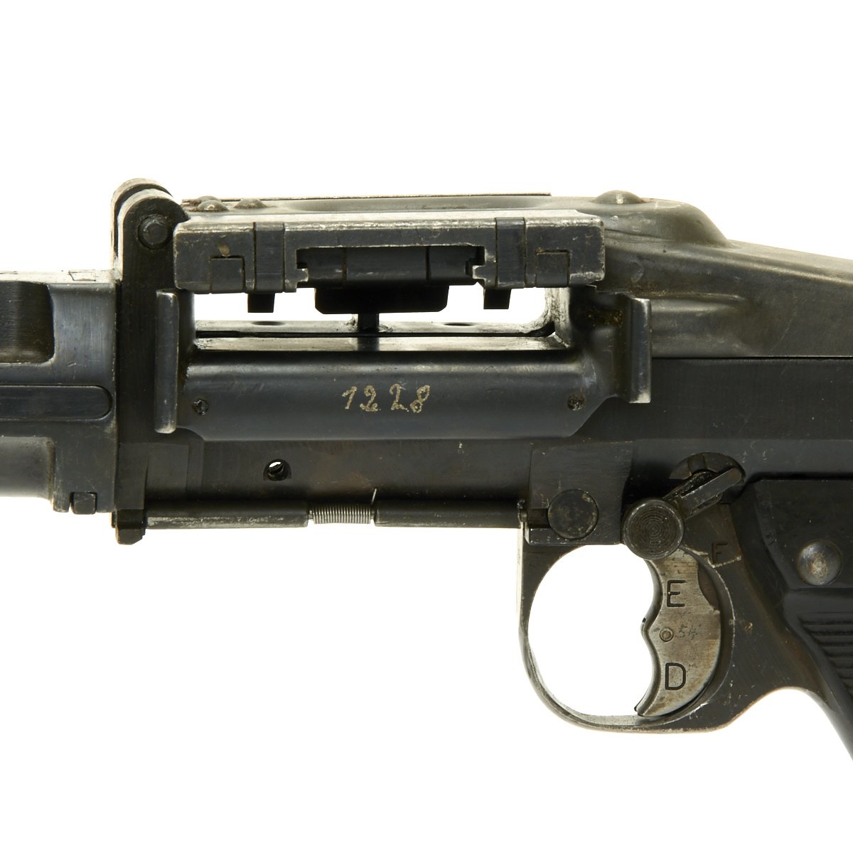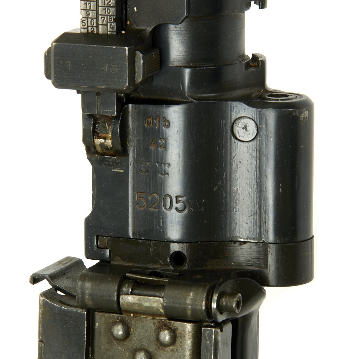 The bipod included is of the early design, with a central height adjustment knob, and is in excellent condition. It bears Waffenampt proofs, and is dated 43 with maker code kur, for Steyr-Daimler-Puch AG, Werk Graz, Fuhrhofsgasse 44. Additionally, the feed tray is marked 963 for Johannes Grossfuss, Döbeln/Sachsen, a metalworking business that produced parts for many guns, and also was known by 3 letter code bpr.