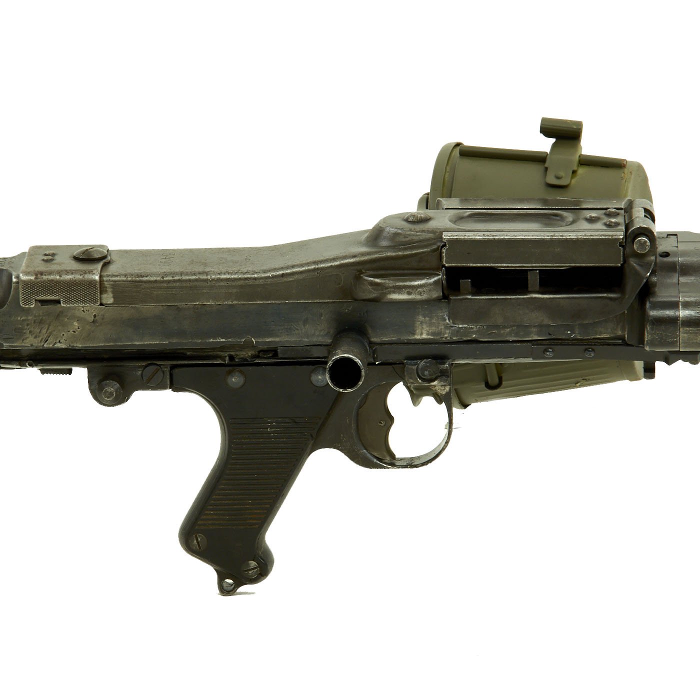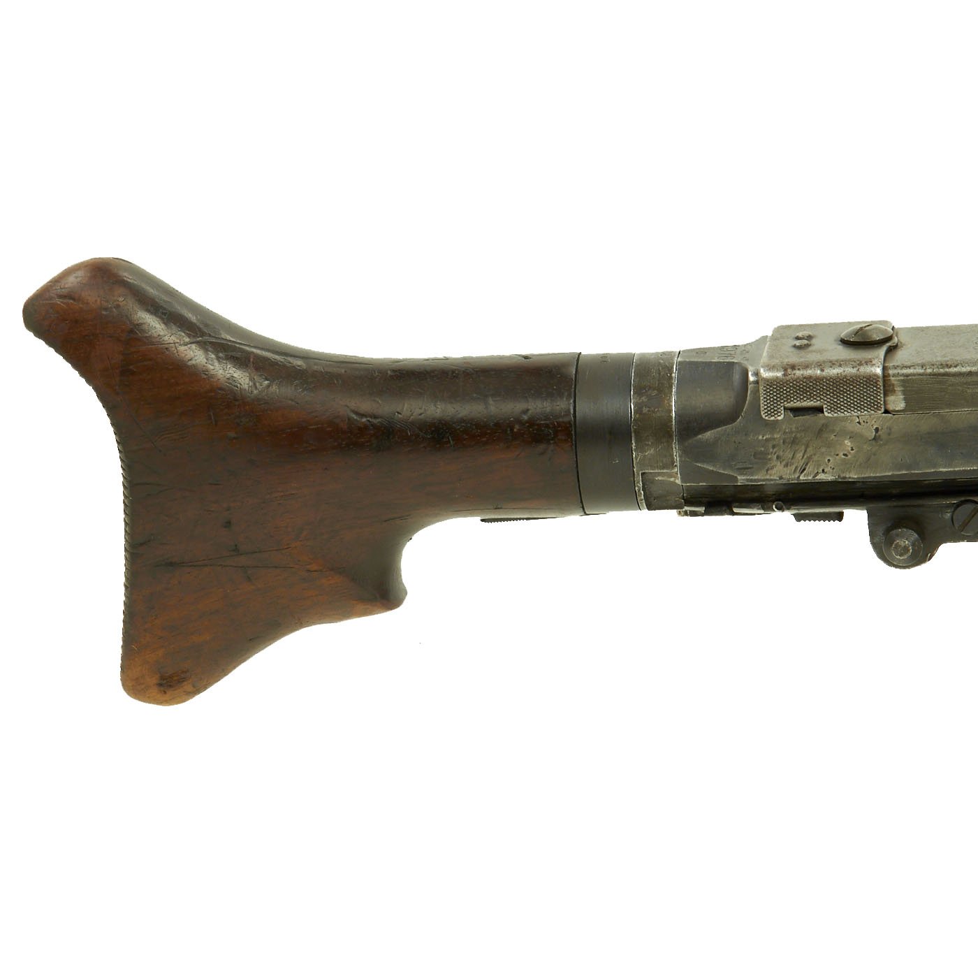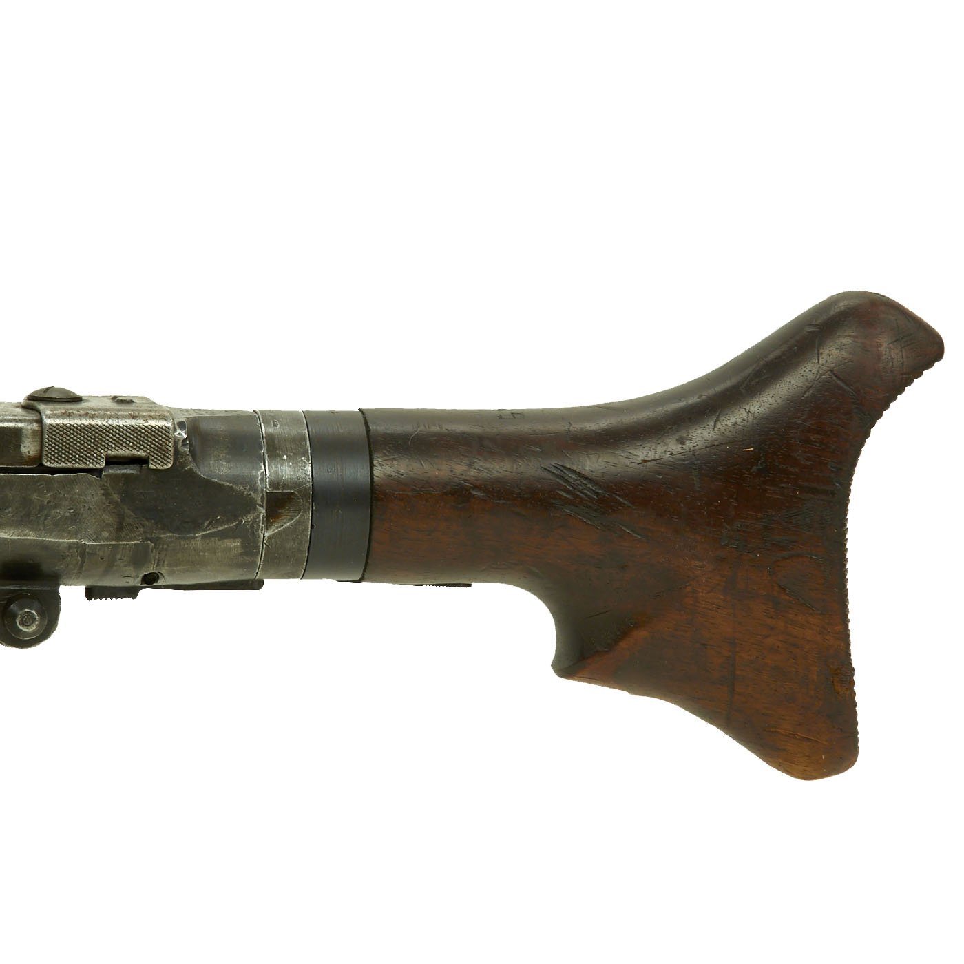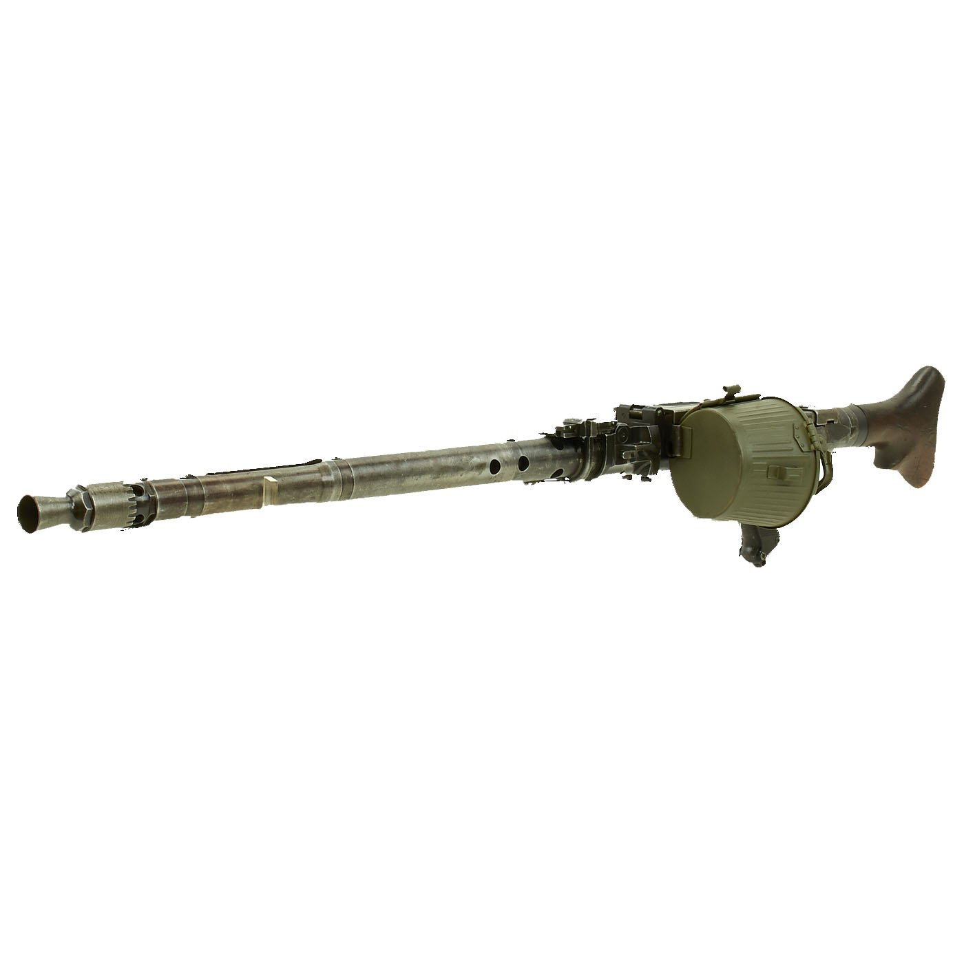 Original Item: Only One available. This is an excellent original WWII issue German MG34 Tanker Issue Panzerlauf (tank barrel) display machine gun. It is coded along with multiple German wartime markings and has multiple Waffenamt markings. Comprised of nearly entirely original WWII parts, this display gun was reconstructed using a BATF approved receiver with 2 inches totally replaced with solid bar stock, making this a totally legal inert non-firing display gun. Comes complete with a post-war repainted basket belt drum and original leather sling.