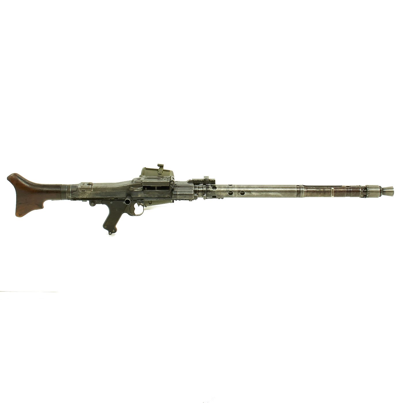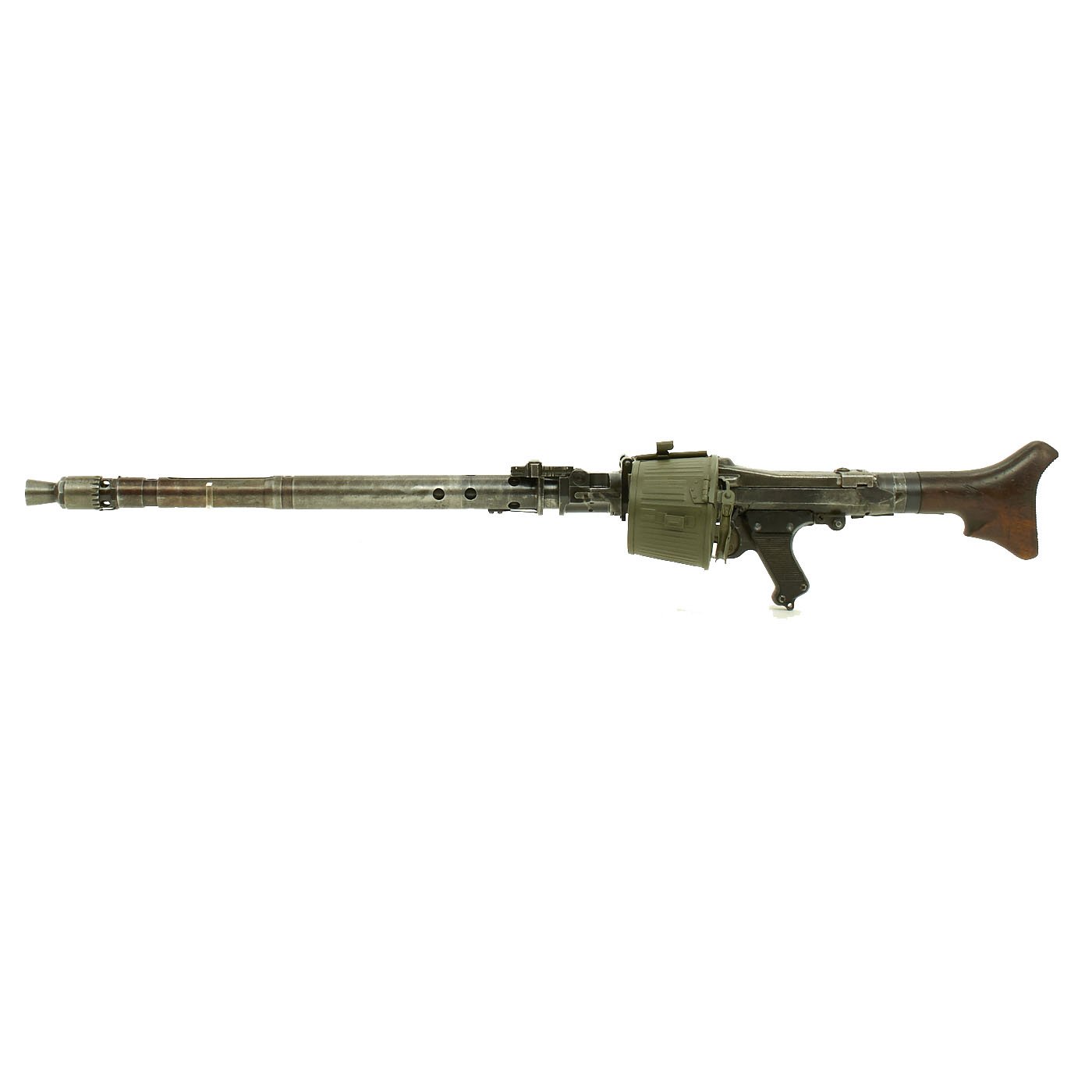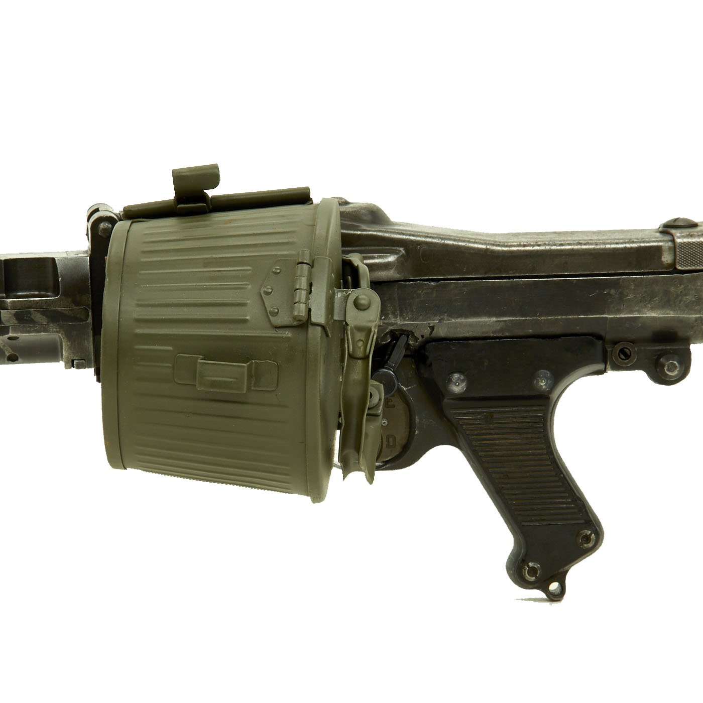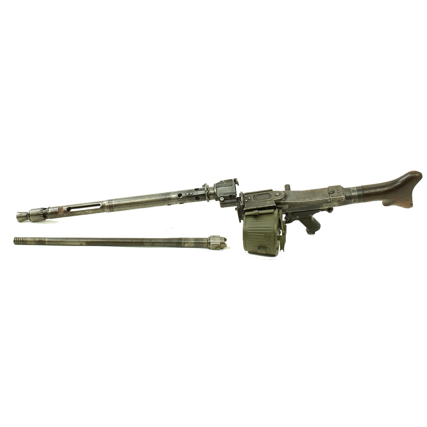 Original Item: Only One available. This is an excellent original WWII issue German MG34 Tanker Issue Panzerlauf (tank barrel) display machine gun. It is coded along with multiple German wartime markings and has multiple Waffenamt markings. Comprised of nearly entirely original WWII parts, this display gun was reconstructed using a BATF approved receiver with 2 inches totally replaced with solid bar stock, making this a totally legal inert non-firing display gun. Comes complete with a post-war repainted basket belt drum and original leather sling.