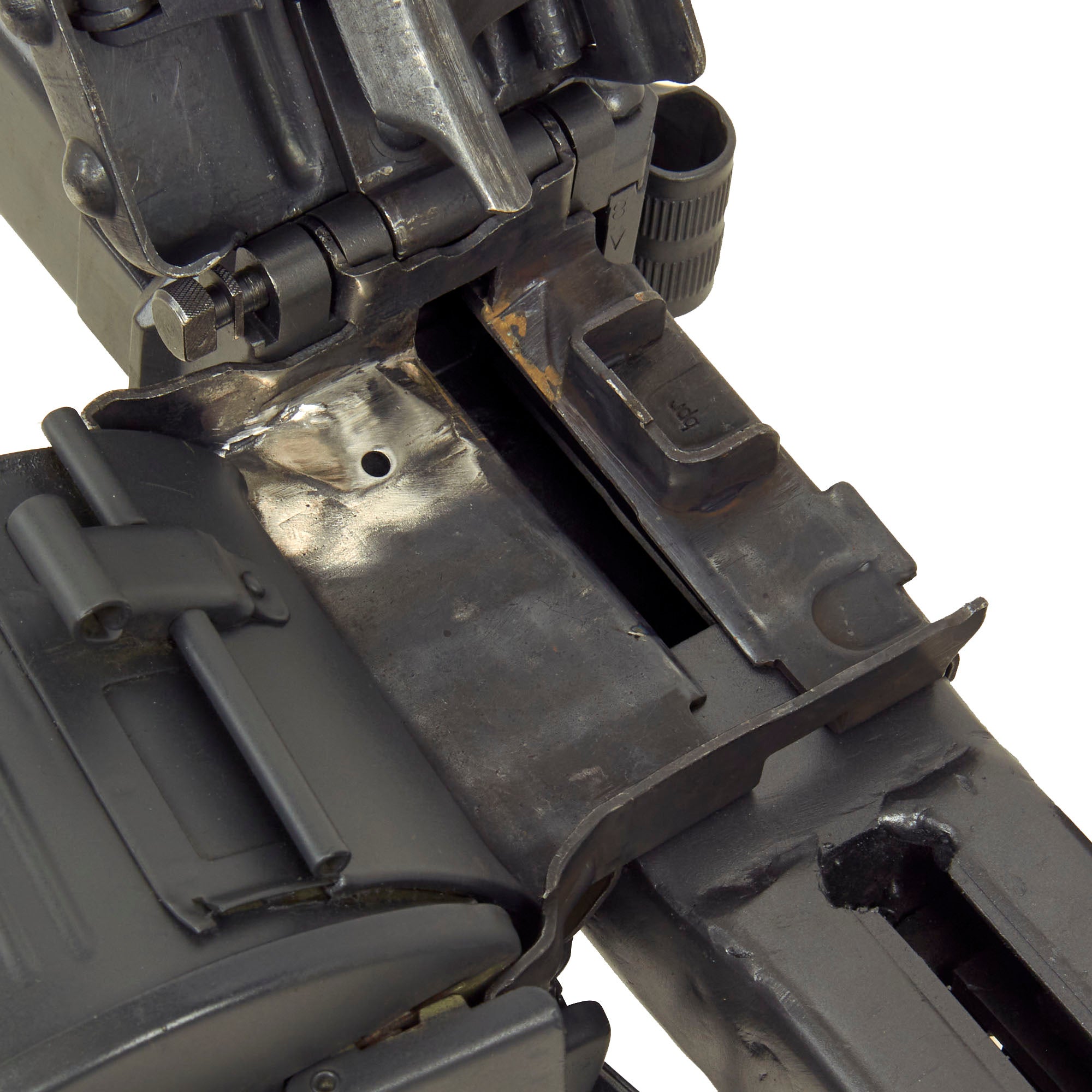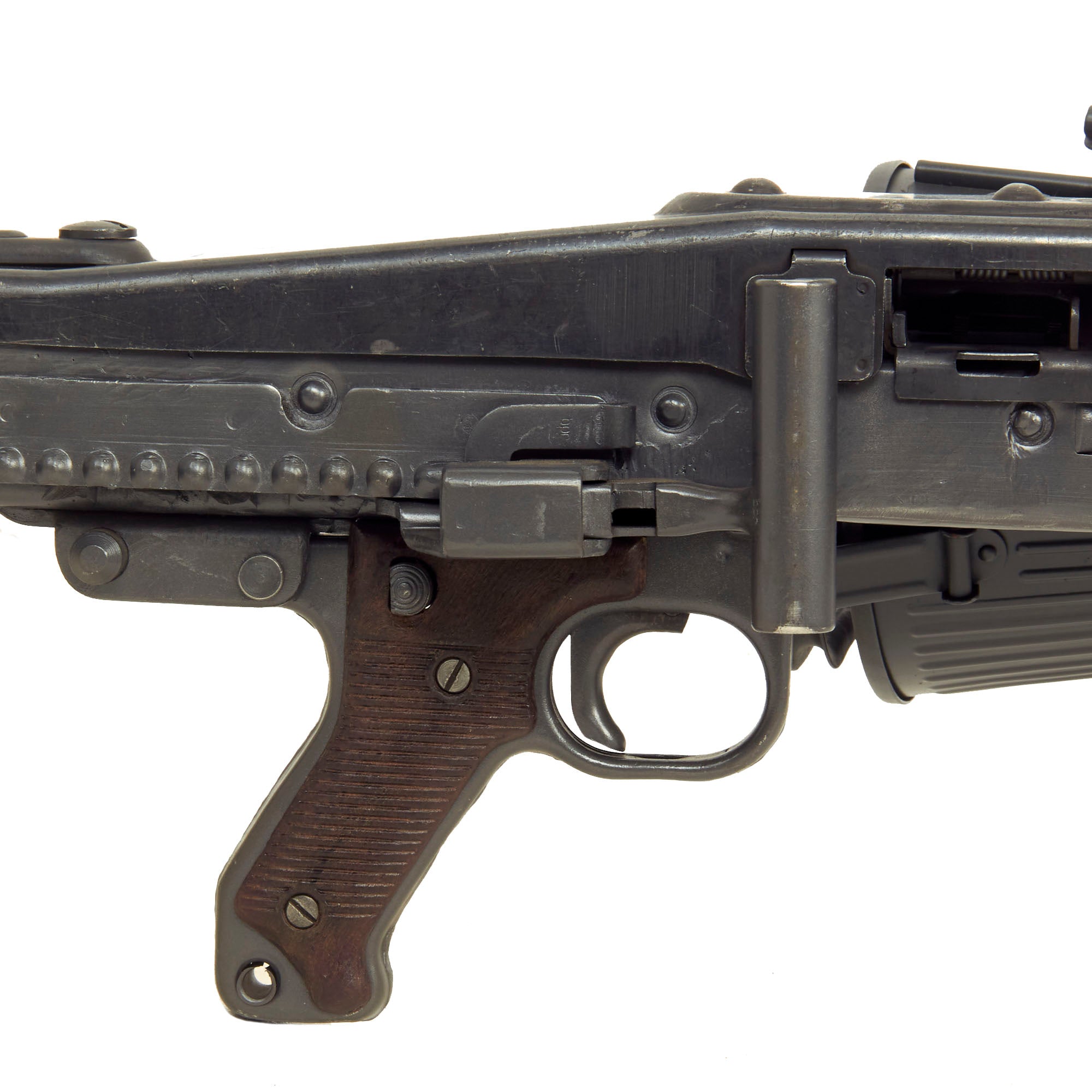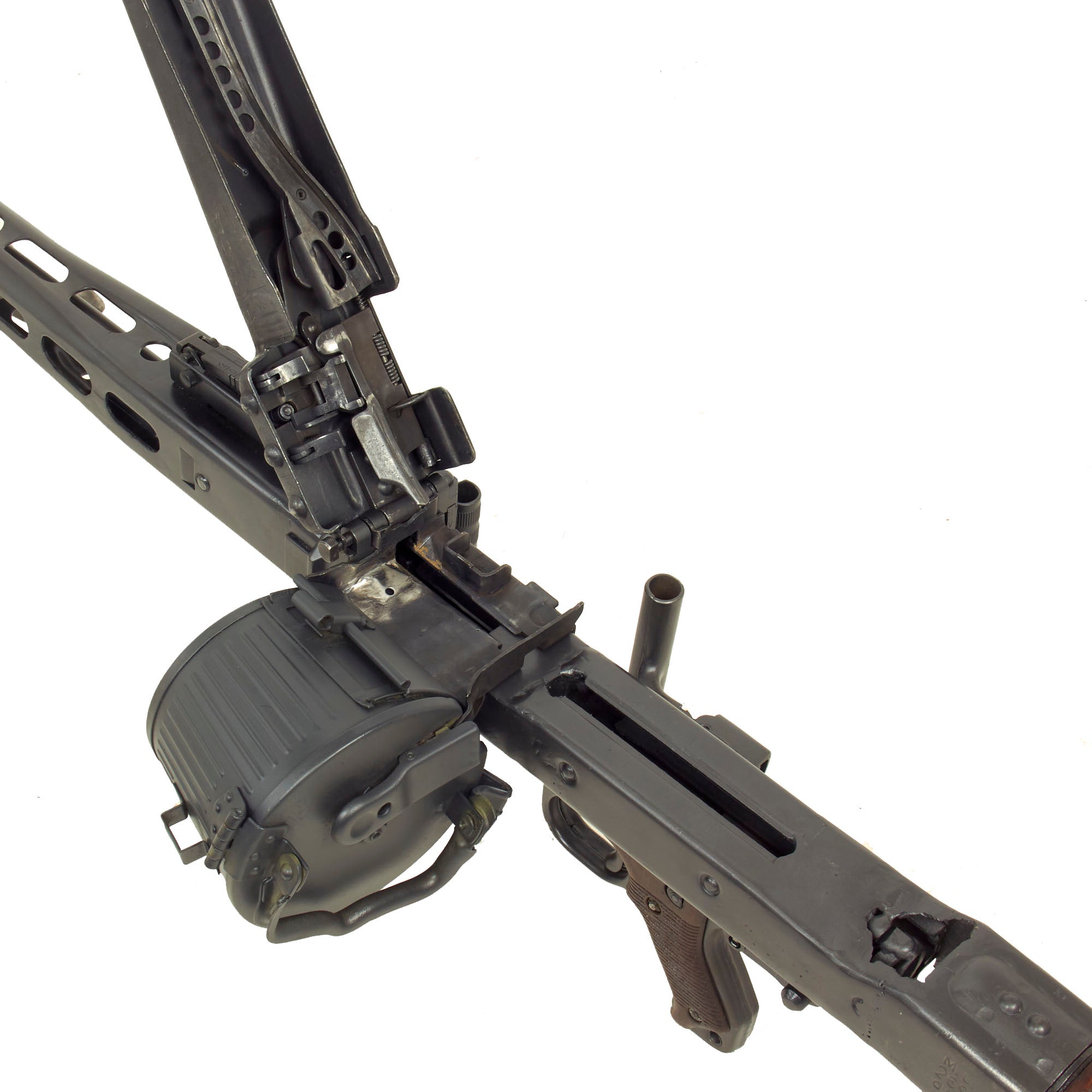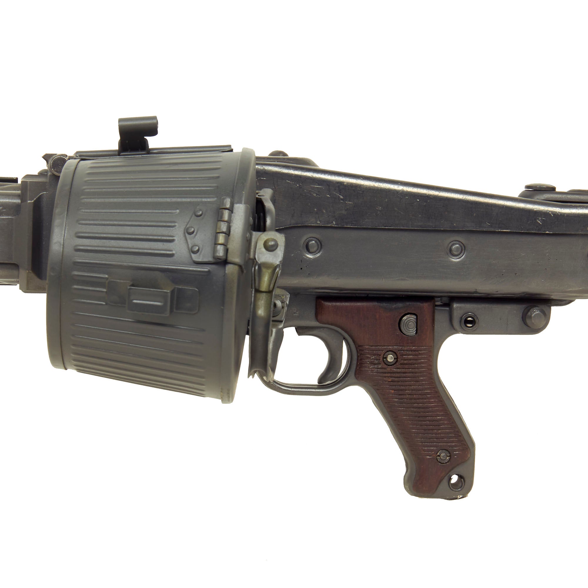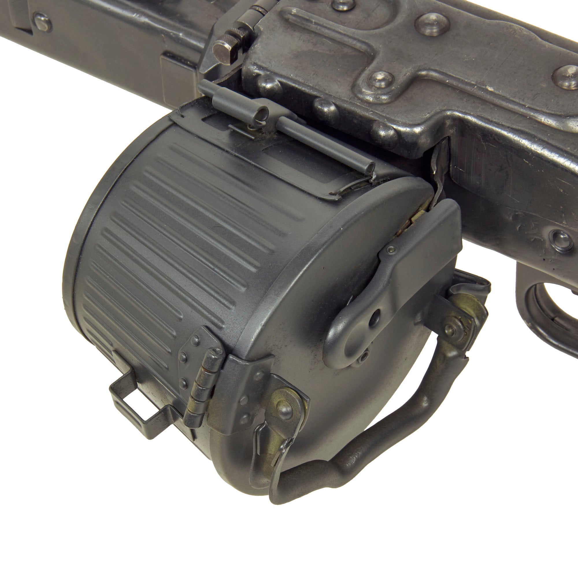 Comprised mostly of original WWII parts, this display gun was reconstructed using a BATF approved receiver with 2 inches totally replaced with solid bar stock, making this an inert non-firing display gun. Comes complete with German WWII issue parts including a wooden butt-stock, bipod, and a post-war repainted drum belt carrier which has been repainted with our panzergrau spray paint. This example even has a fully functioning barrel change assembly! Please note that the barrel must be in the forward position for it to open.