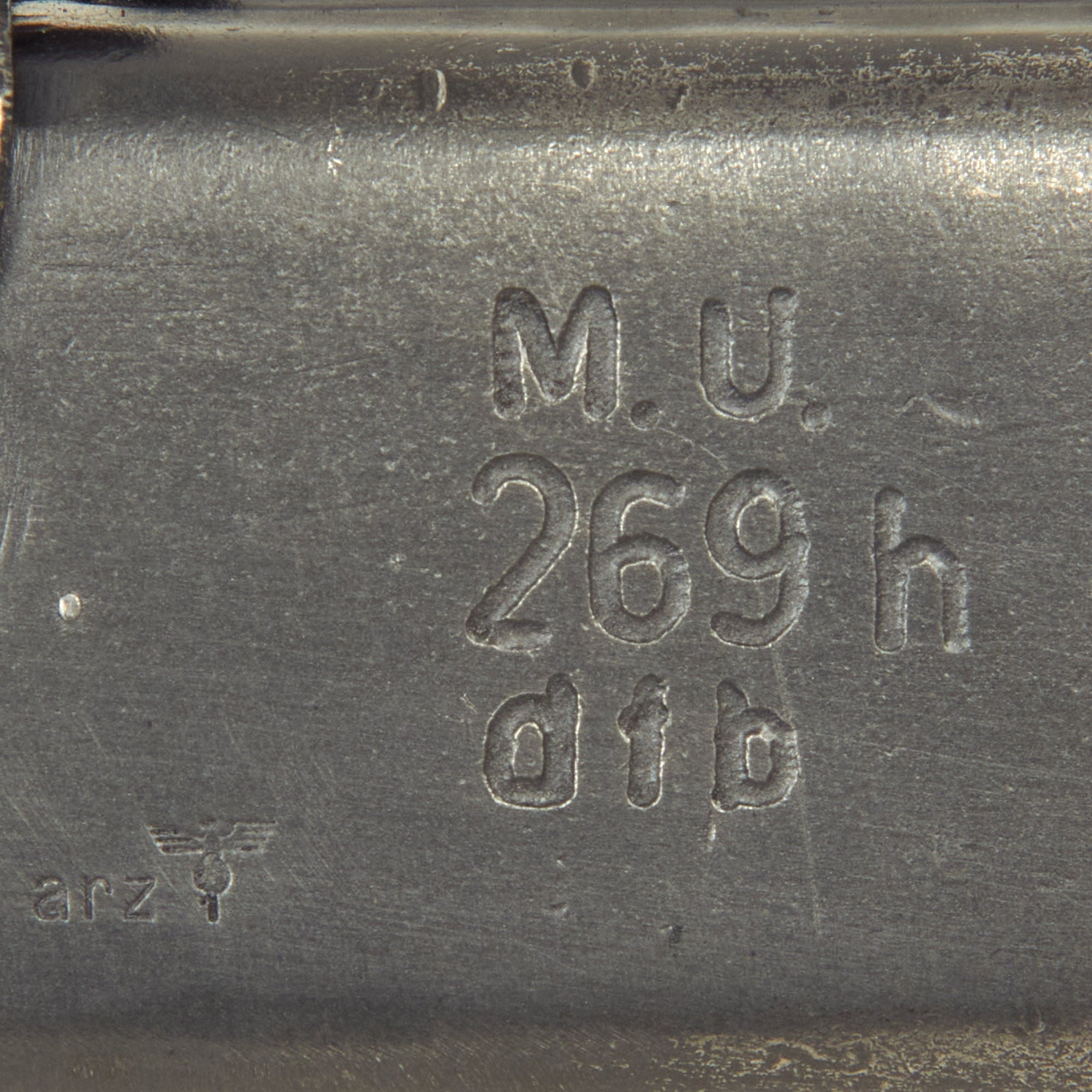 The date code M.U. with this maker mark indicates 1944 production, in the middle of MG 42 production. The top of the rear receiver is marked with three Waffenamt WaA4 markings, the correct inspector marking for this maker. There is also arz next to an Eagle / 1 proof, indicating that the receiver was made by subcontractor Deutsche Kühl- und Kraftmaschinen GmbH, who supplied the receivers to Gustloff-Werke, Mauser, and others.