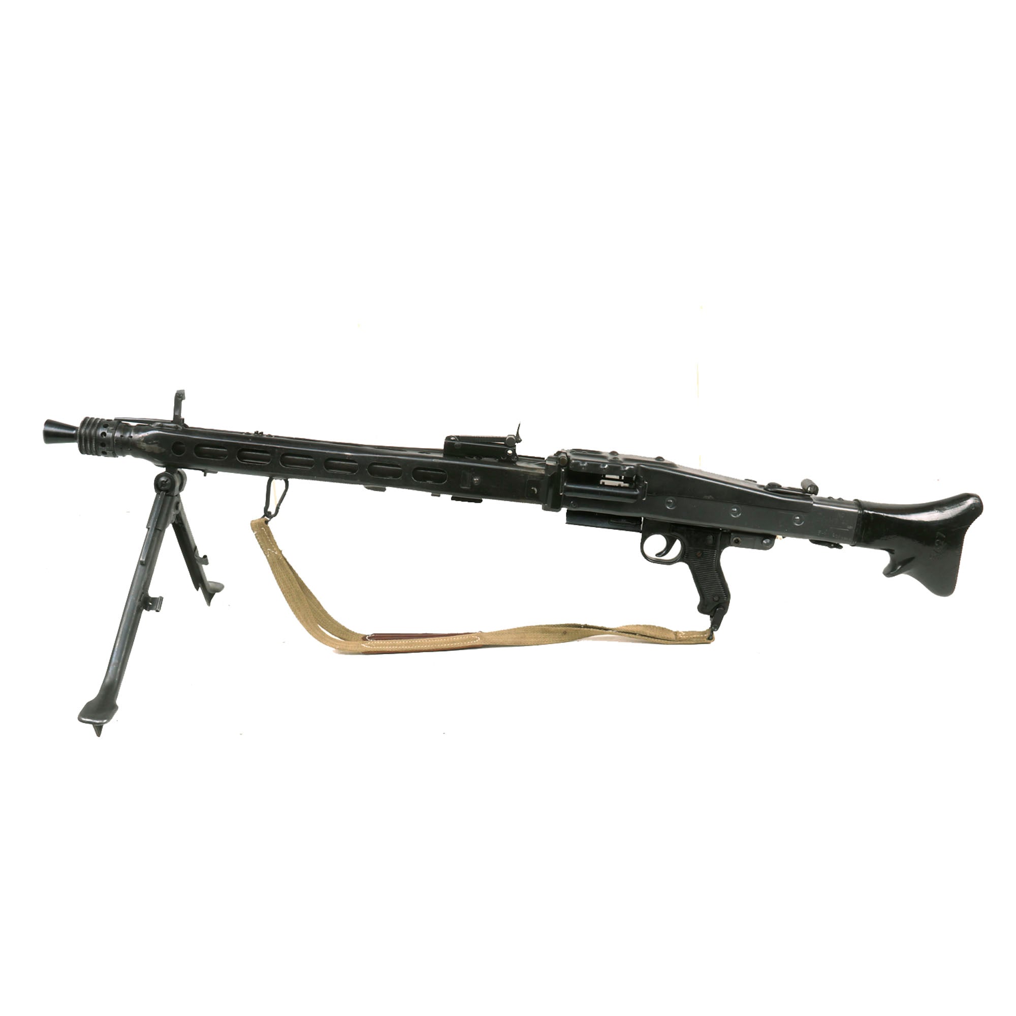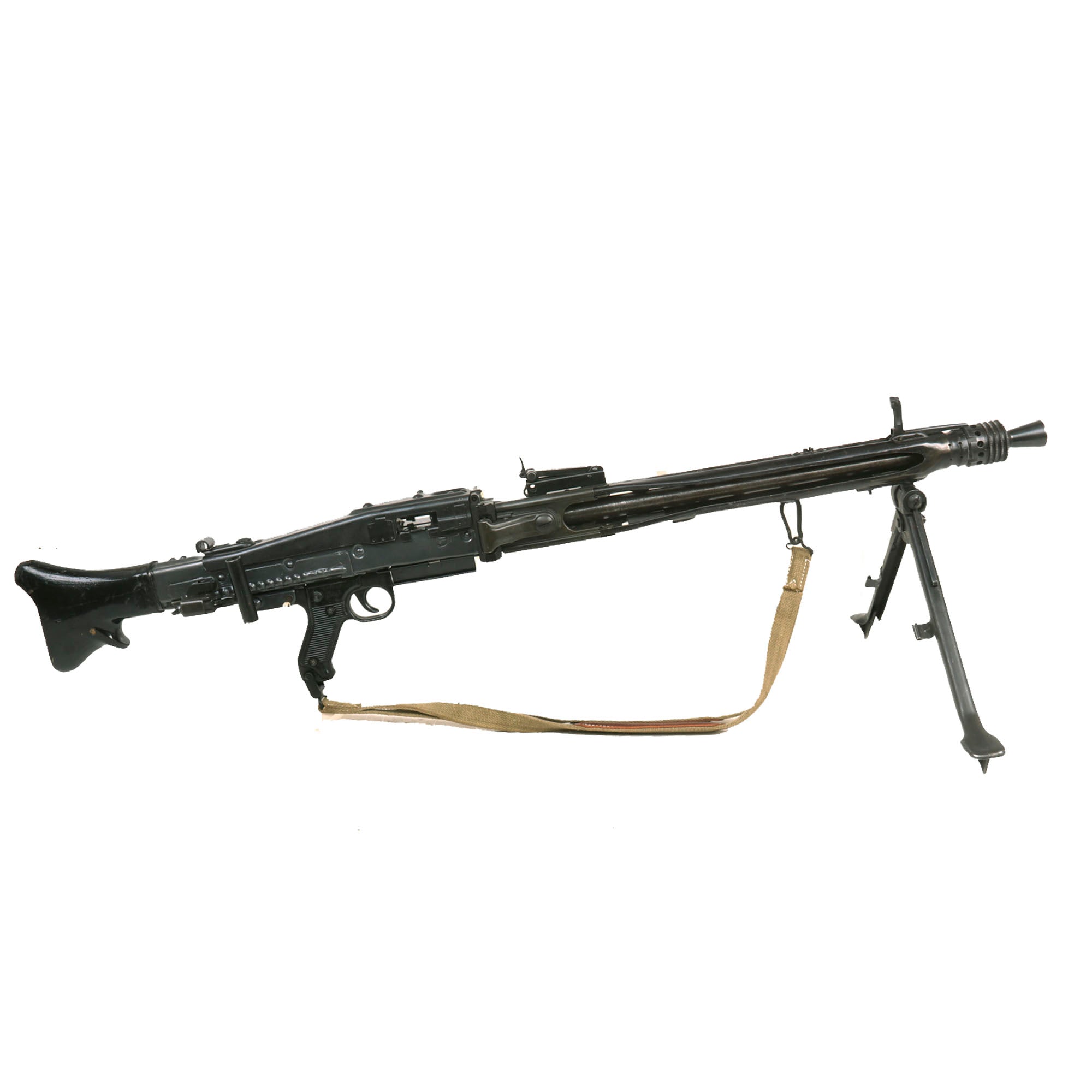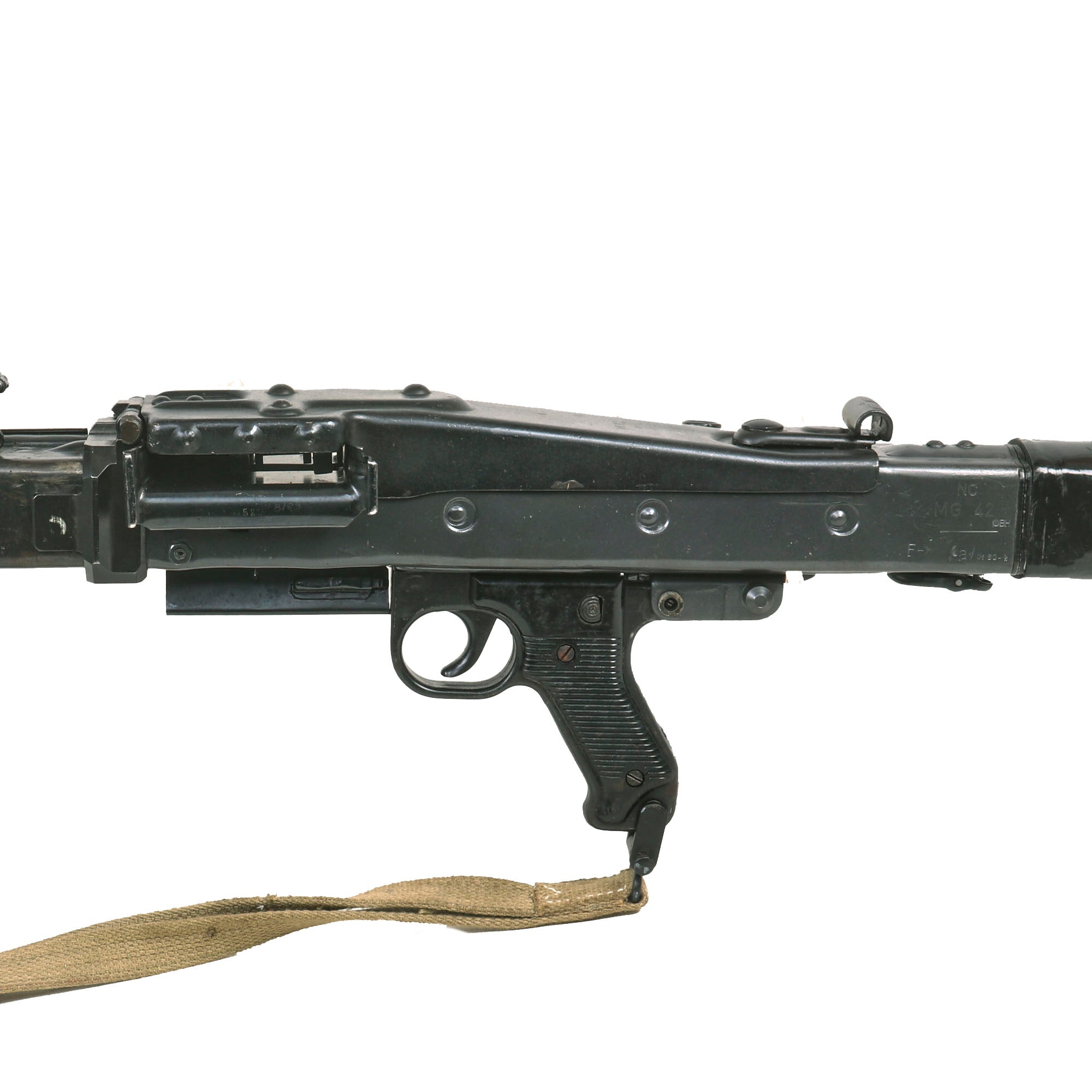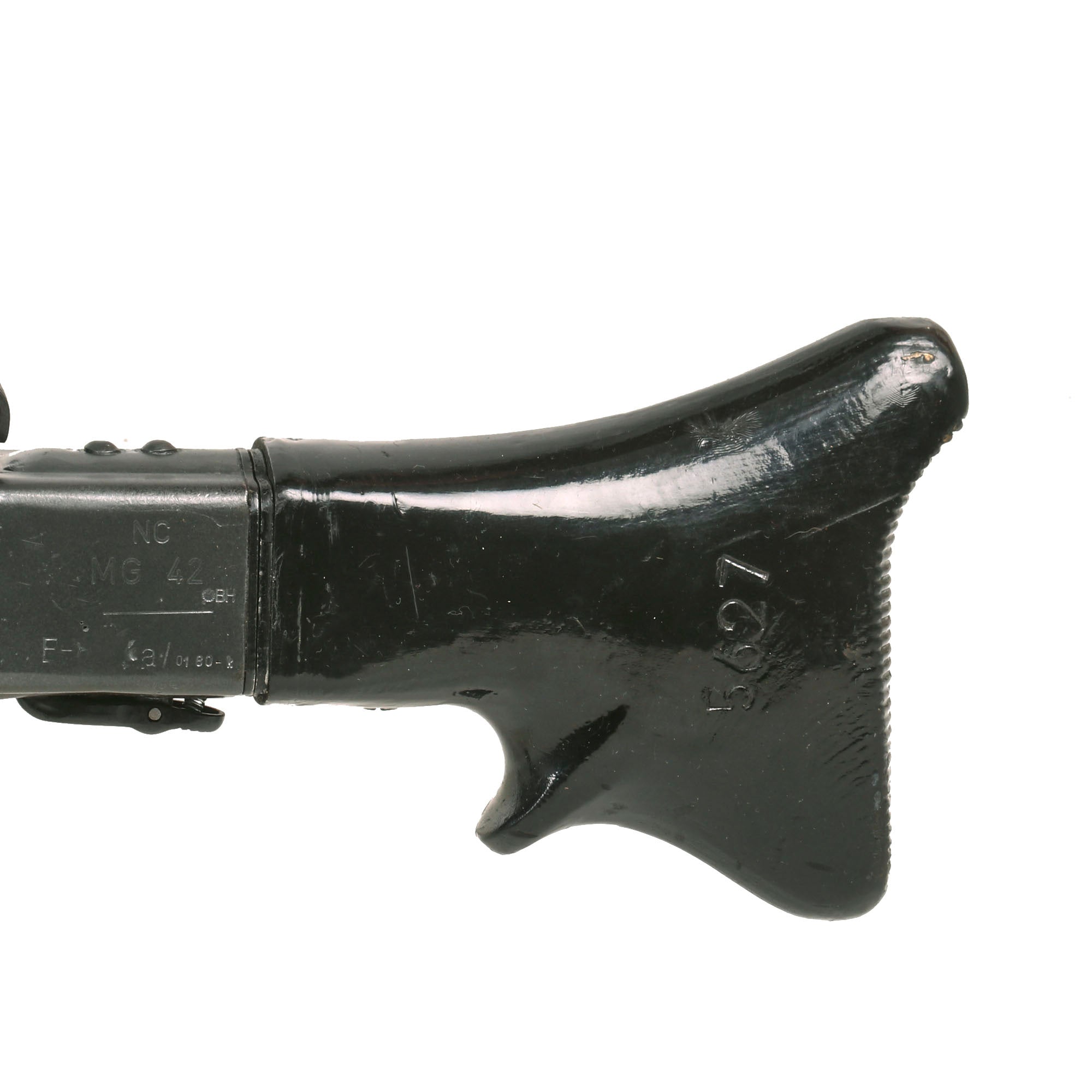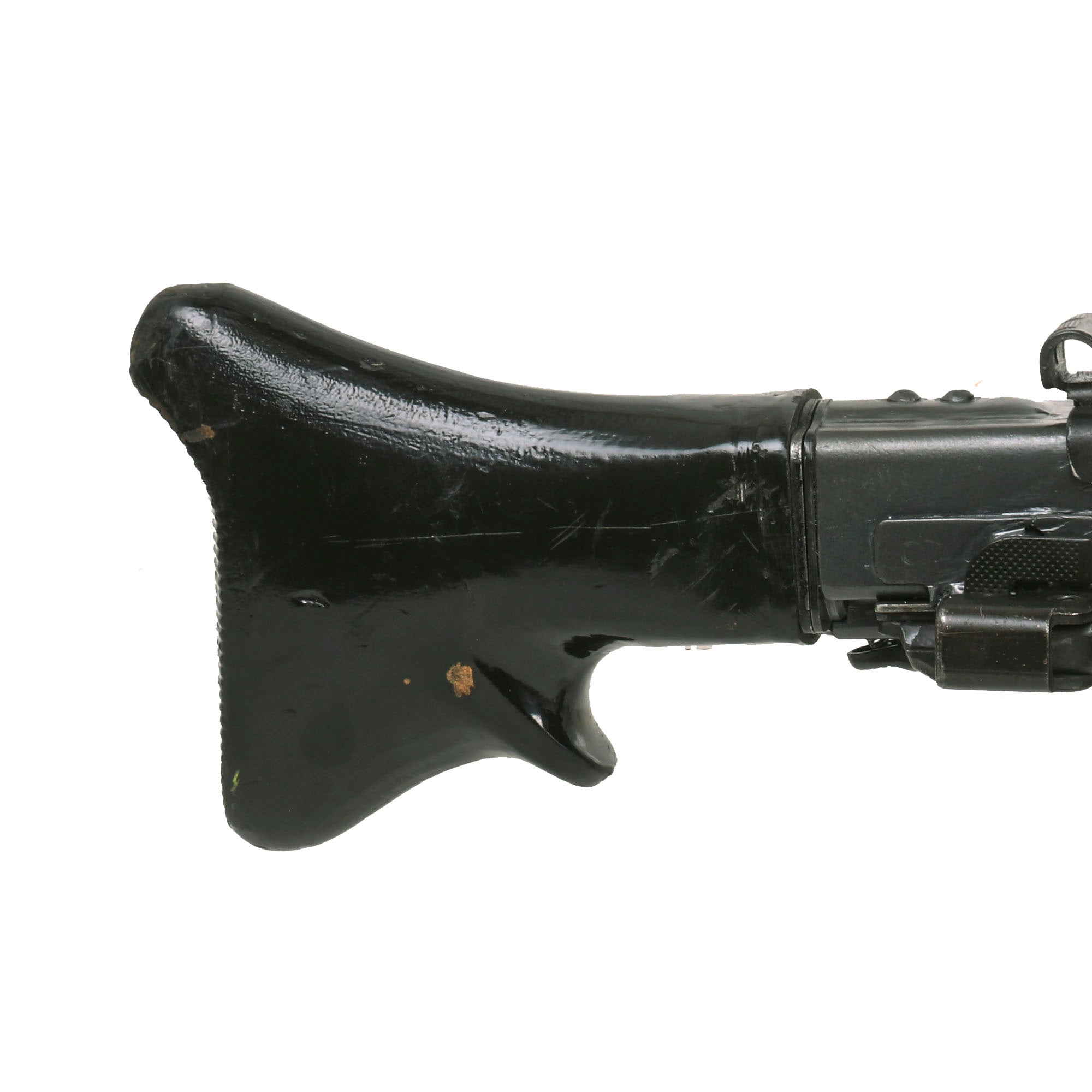 Original Item: Only One Available. Constructed from a legally demilitarized (de-milled) parts set, this is a wonderful and rare German WWII MG42 Display Gun. It is built from all original parts on an original BATF compliant non-firing display receiver, making this a 100% legal display machine gun. This receiver was created by using portions of the original torch cut receiver, including the barrel bushing, combined with some new made solid steel portions. It has properly had a 25% section of the total length completely replaced entirely with solid steel bar stock. Meaning a 1/4 length section of the display receiver is solid steel, making this totally legal to own without a license of any kind. The receiver has been partially repainted with our lovely "gunmetal gray" paint to give it a great look.