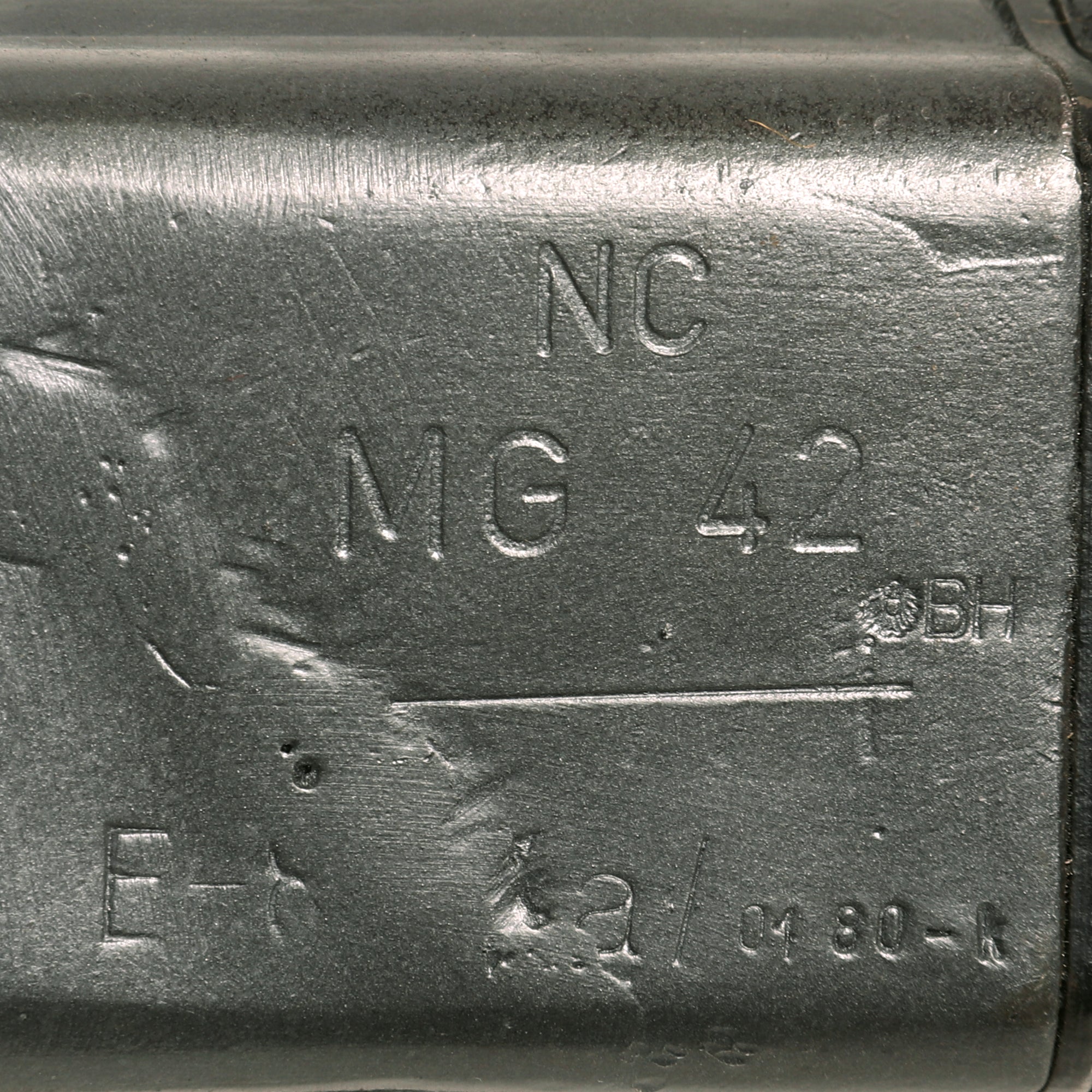 The maker code is partly removed due to where the receiver was cut, but we can tell that it is definitely cra, the maker code for MAGET - Maschinen und Geraetetbau GmbH, in Berlin-Tegel. Interestintly, there is just a line where the serial number should be. This company was previously known as ALKETT-Altmärkische Kettenweke GmbH, Werk II, but was was renamed in 1942-1943. Starting in 1943, they switched to two letter codes for dates, with "NC" being the code for 1944. They later changed their maker code to "swd" for 1945 only, keeping the same "NC" date code. They made MG34 and MG42 machine guns, and also made components for armored vehicles.