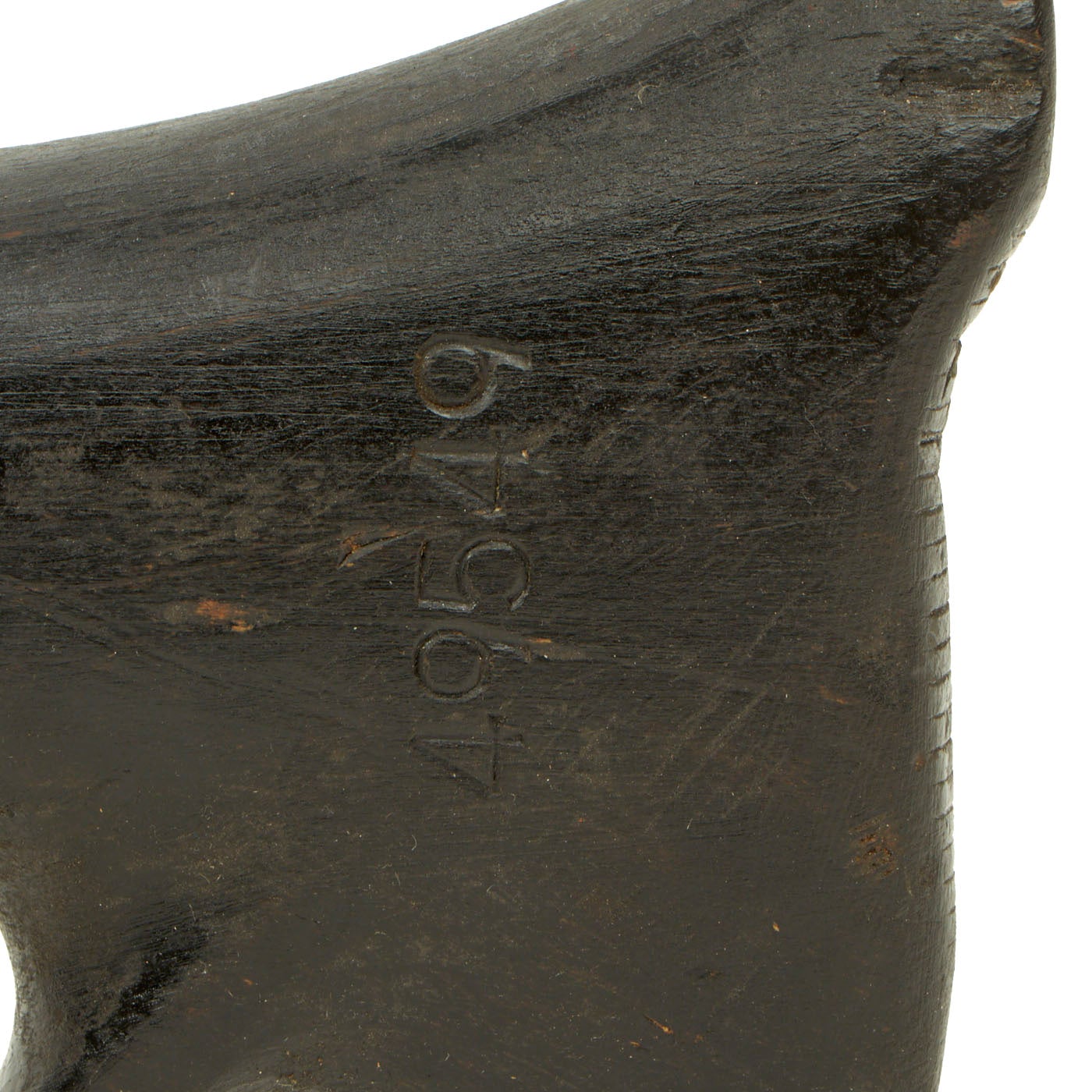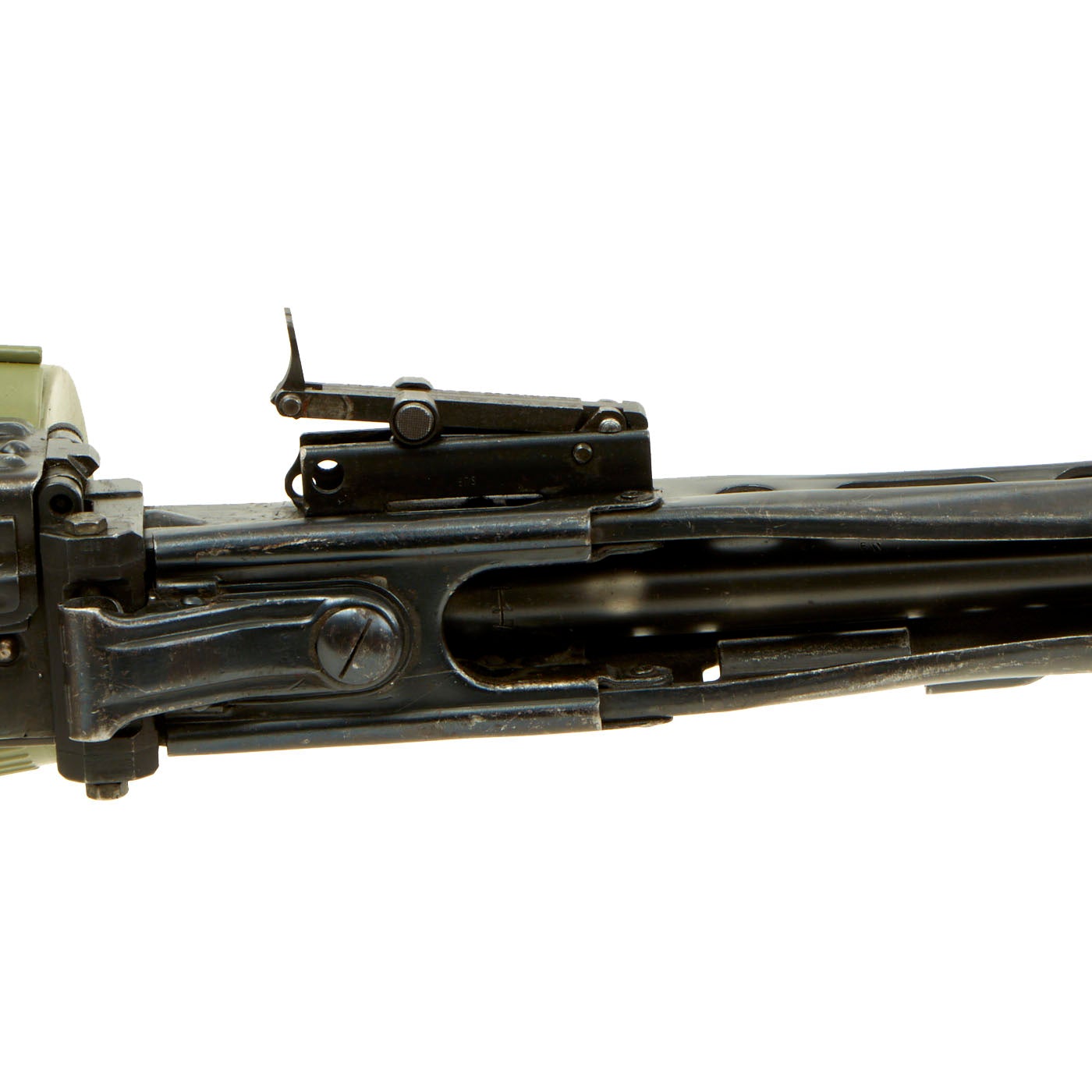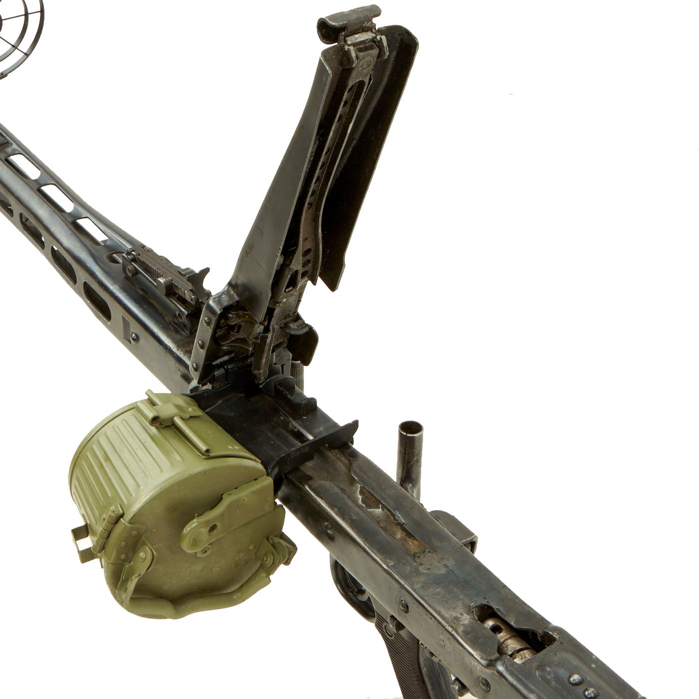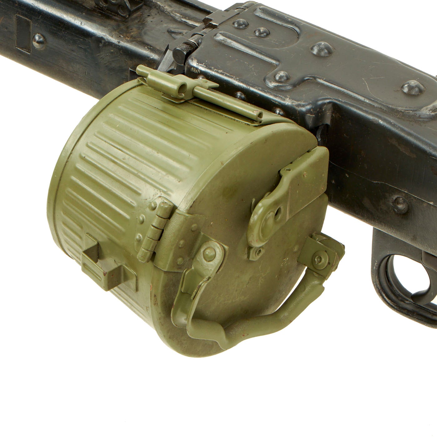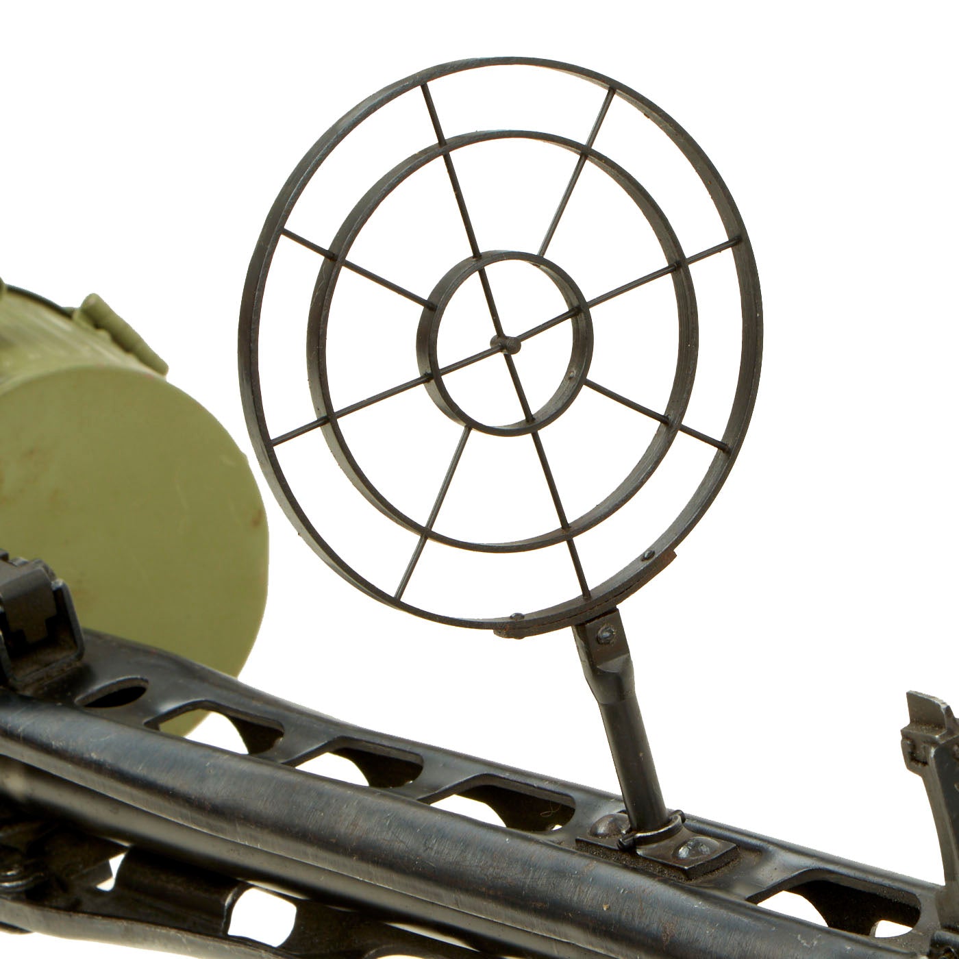 Comprised mostly of original WWII parts, this display gun was reconstructed using a BATF approved receiver with 2 inches totally replaced with solid bar stock, making this an inert non-firing display gun. Comes complete with German WWII issue parts including a black painted wooden butt-stock, post-war painted drum belt carrier, and bipod.