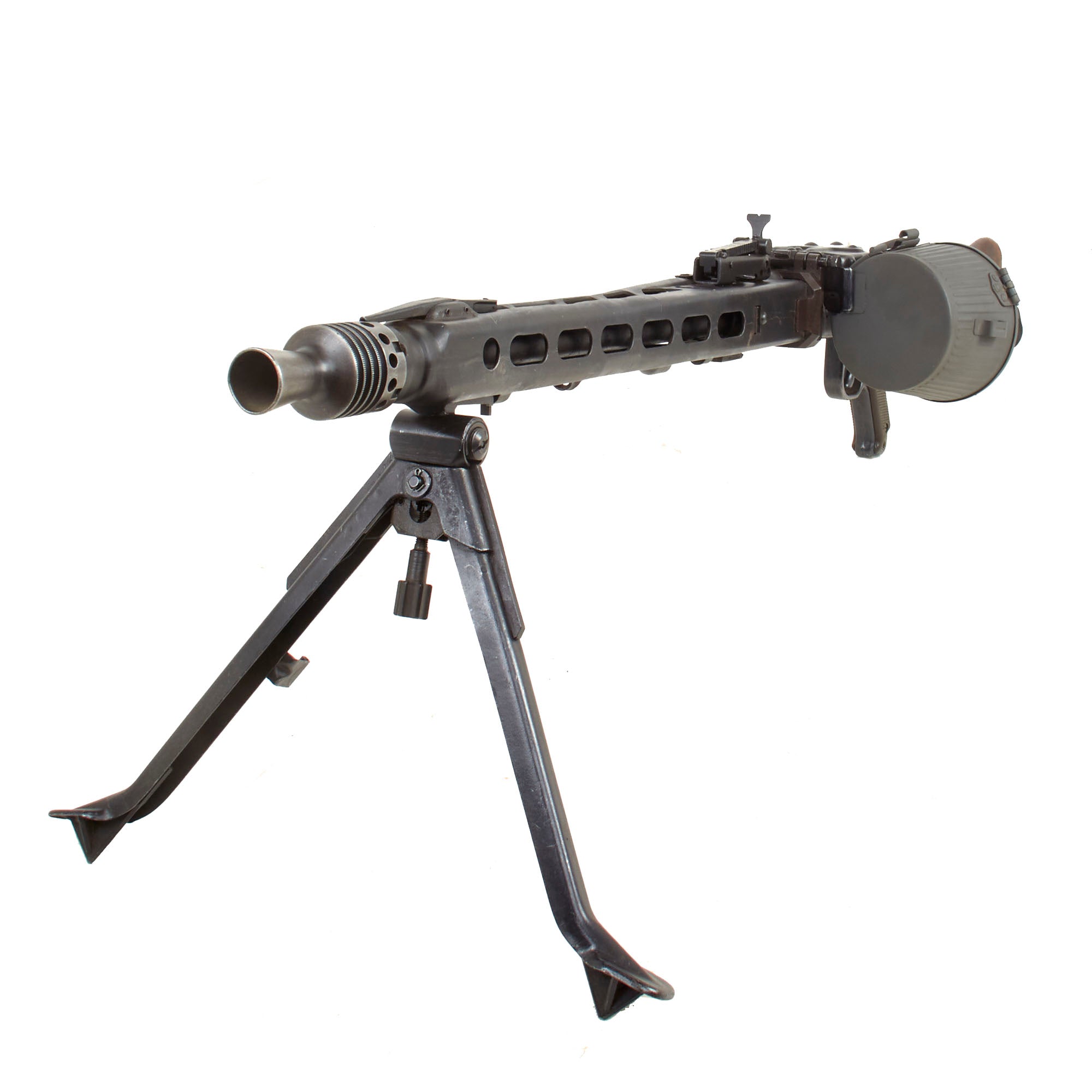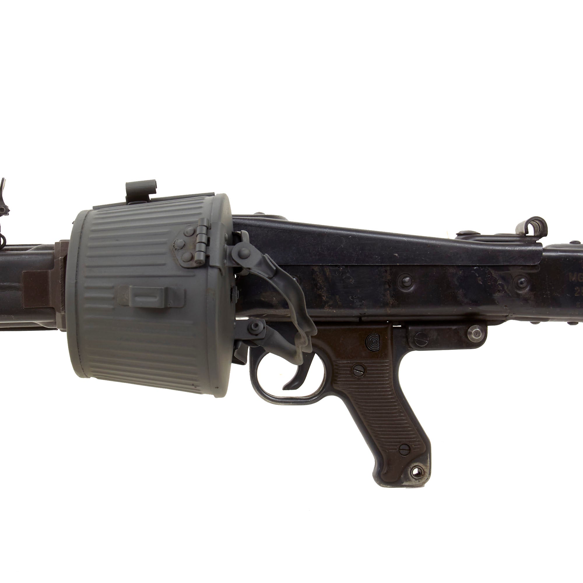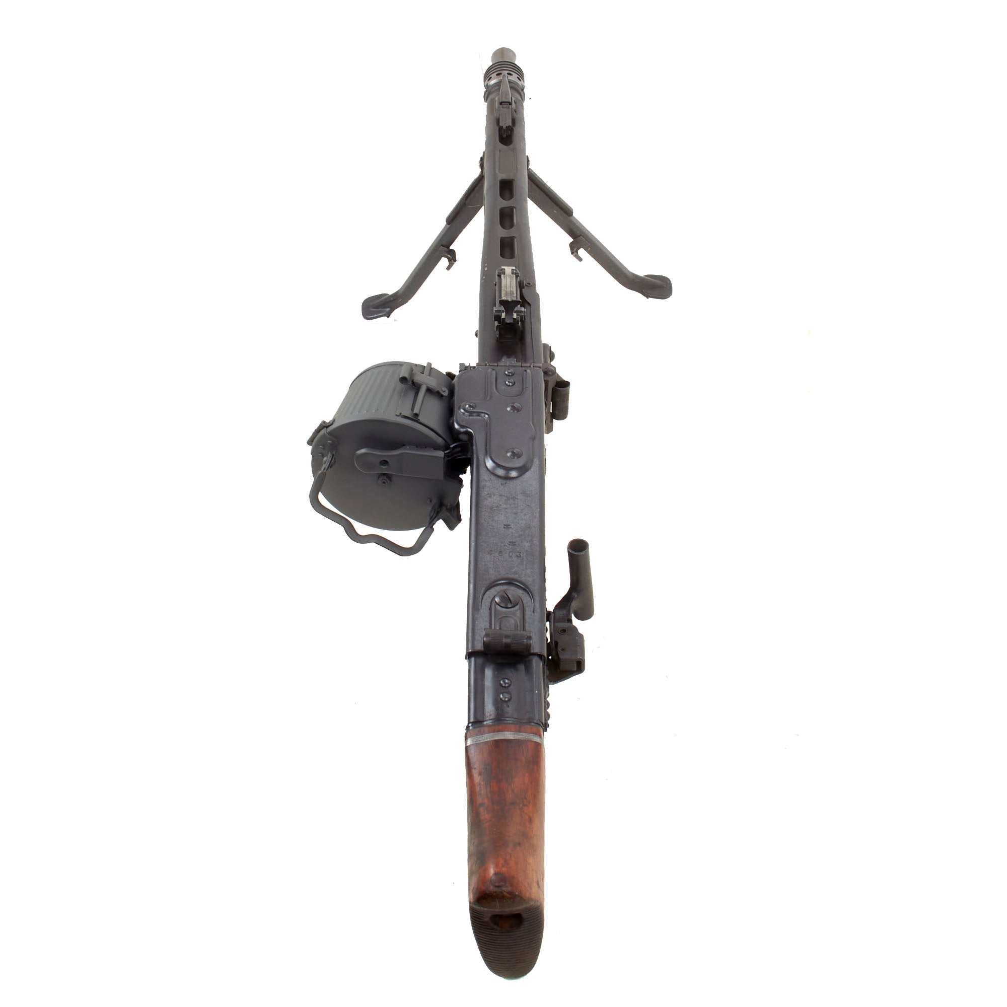 Condition-wise, it is one of the best we have seen in years, and doesn't have lots of crossed out markings as so many do. The metal finish and overall condition is excellent, and it will make a fantastic addition to any WWII Collection. It comes complete with German WWII issue parts including a wooden butt-stock, bipod, and an original WWII Production maker marked belt carrier drum, which has been repainted with our panzergrau spray paint.