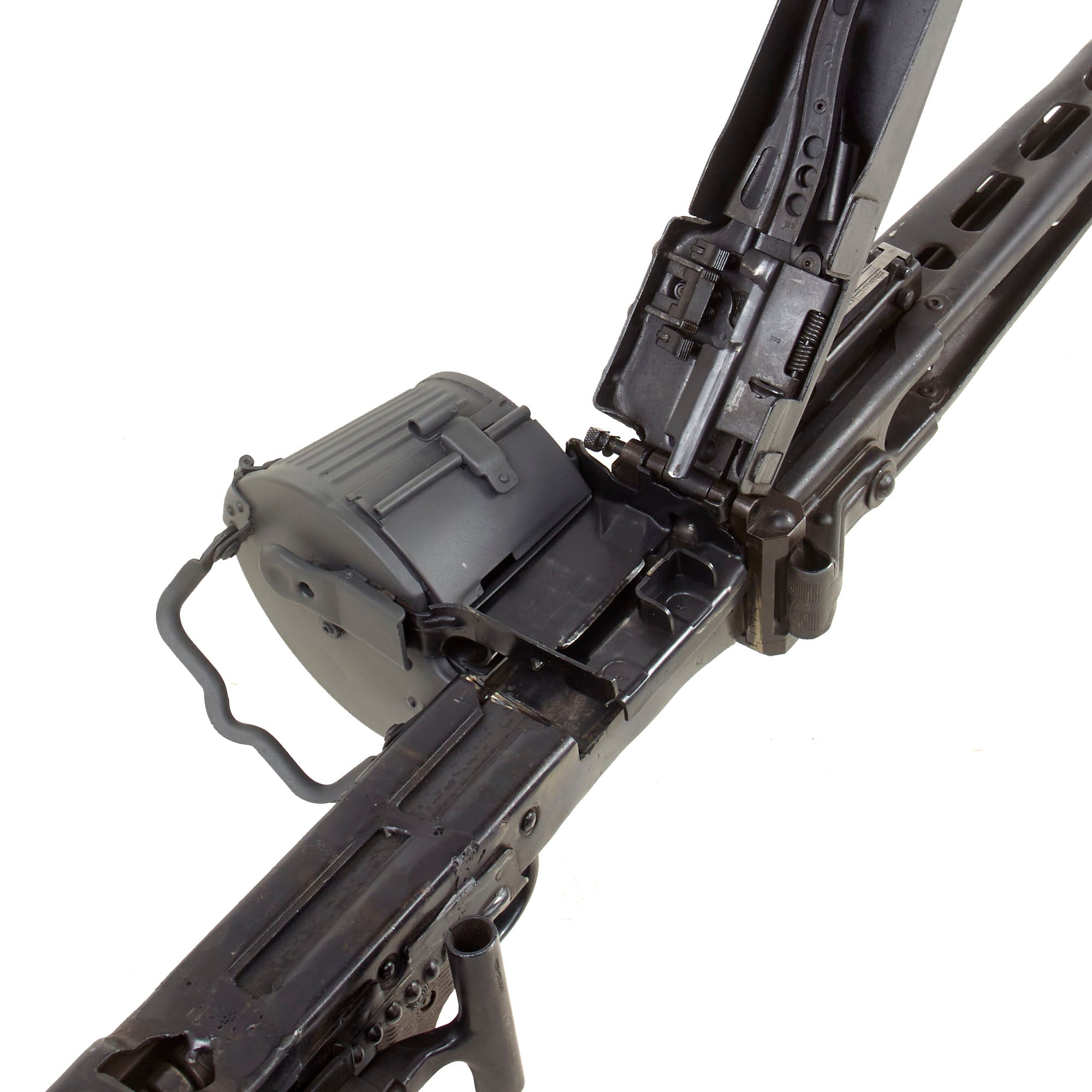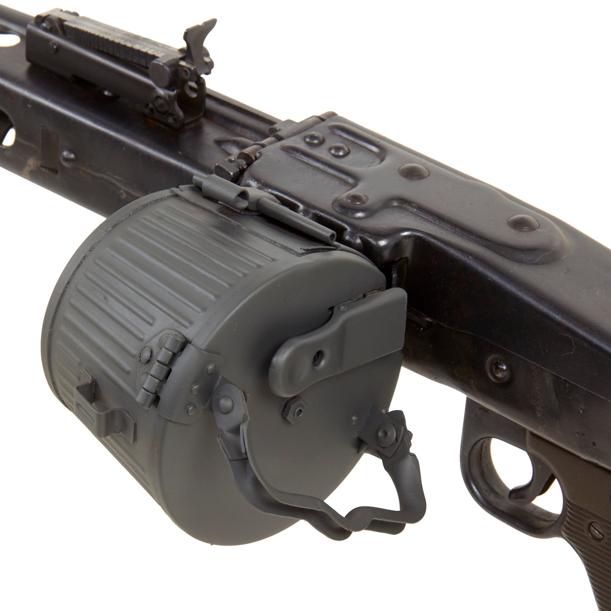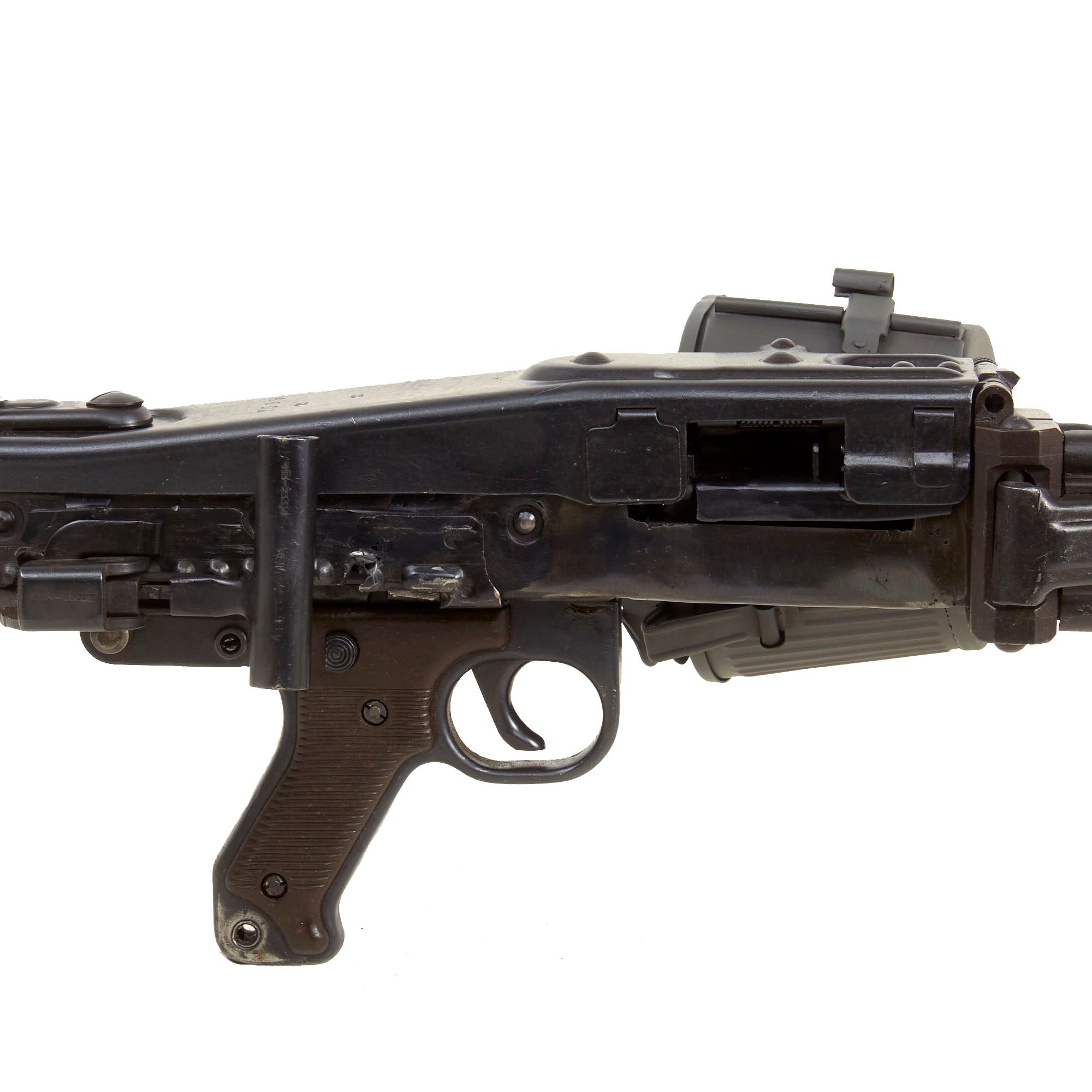 Condition-wise, it is one of the best we have seen in years, and doesn't have lots of crossed out markings as so many do. The metal finish and overall condition is excellent, and it will make a fantastic addition to any WWII Collection. It comes complete with German WWII issue parts including a wooden butt-stock, bipod, and an original WWII Production maker marked belt carrier drum, which has been repainted with our panzergrau spray paint.