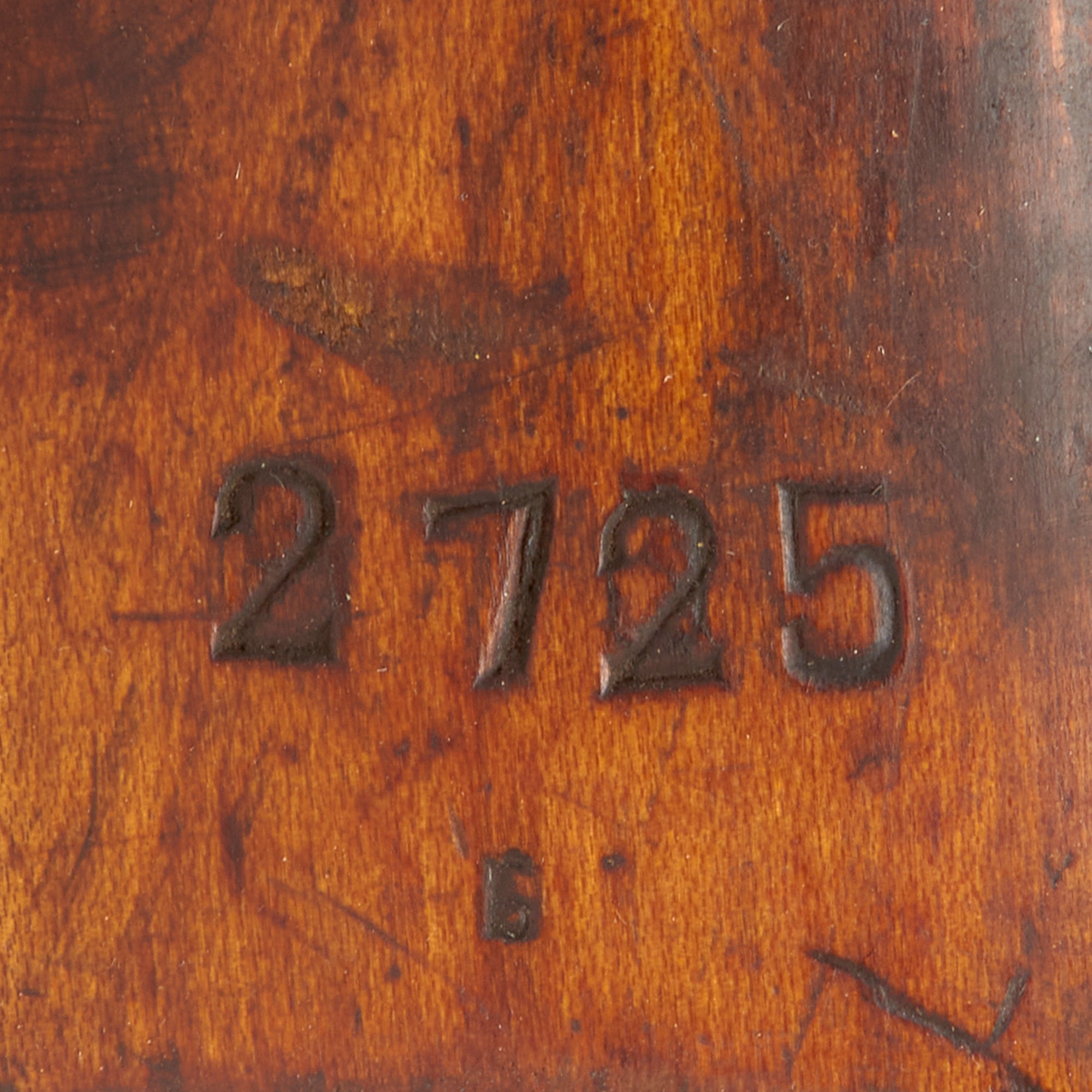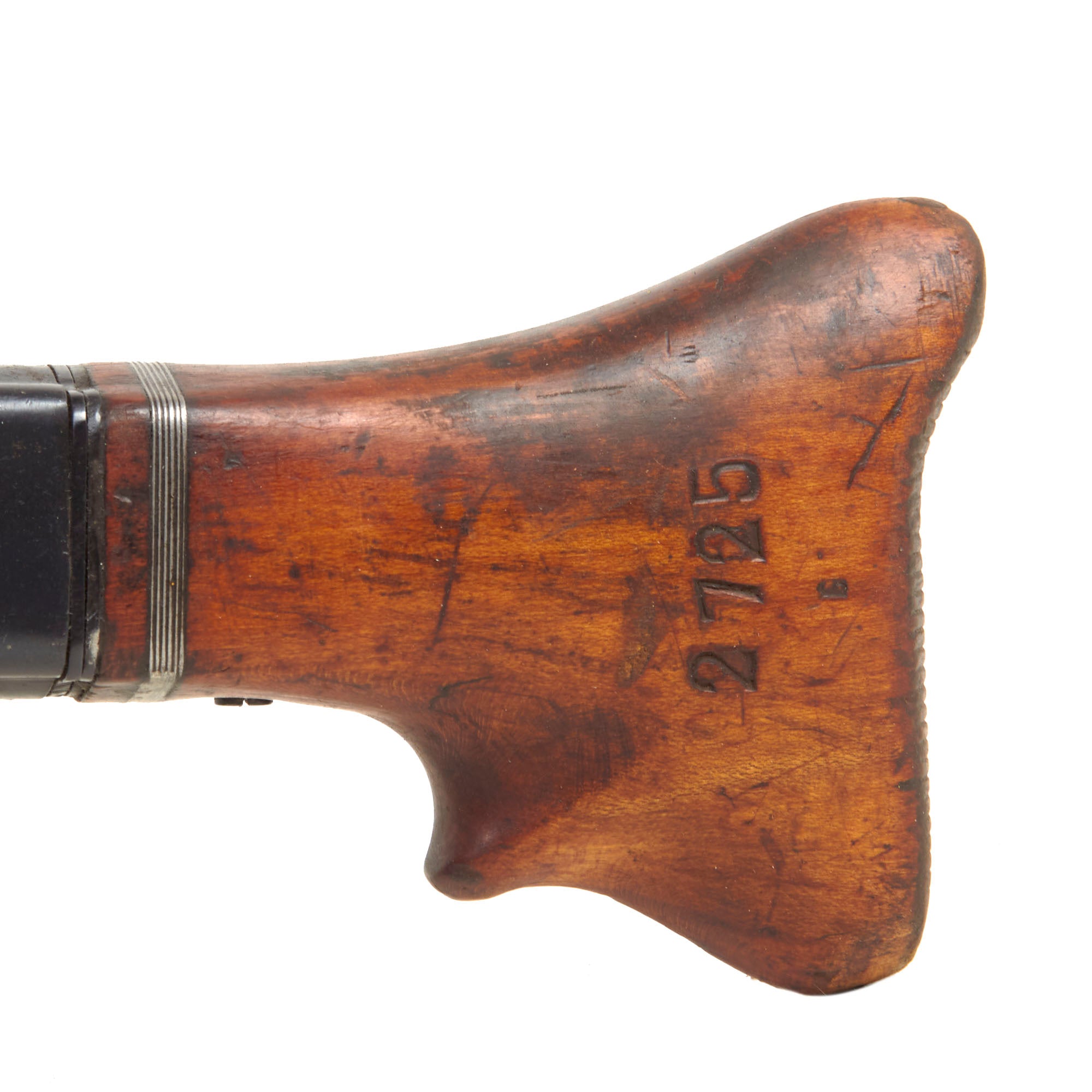 The bipod is the correct type and is in great shape, though it has had the original wartime markings removed, It is the early pattern with the center height adjustment, with some post war arsenal markings in places. The butt stock is wood and is in very good condition, showing no major cracks or other damage. It still has a clear 2725 marking on the left side, and the wire wrapping around the front is fully intact. This display gun bears additional markings on various components.