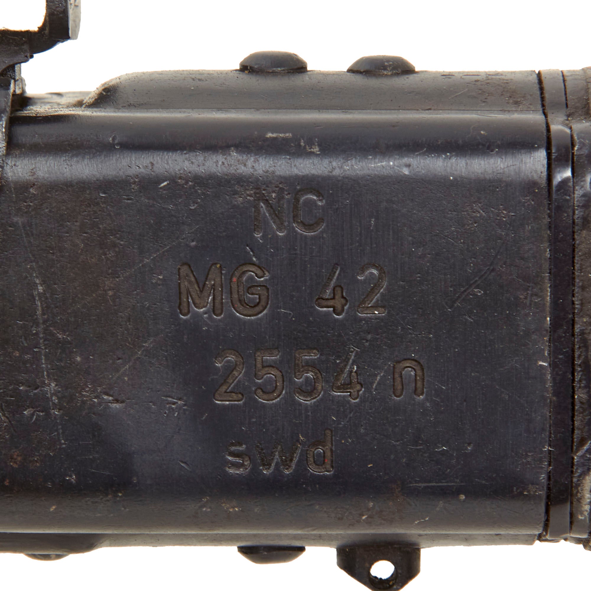"swd" is the 1945 maker code for MAGET - Maschinen und Geraetetbau GmbH, in Berlin-Tegel. This company was previously known as ALKETT-Altmärkische Kettenweke GmbH, Werk II, but was was renamed in 1942-1943. They previously used the code "cra" until 1944, when they changed their maker code to "swd" for 1945 only. They made MG34 and MG42 machine guns, and also made components for armored vehicles. The top rear of the receiver is marked on either side with Waffenamt WaA11 codes, which are faint and could be partial numbers.