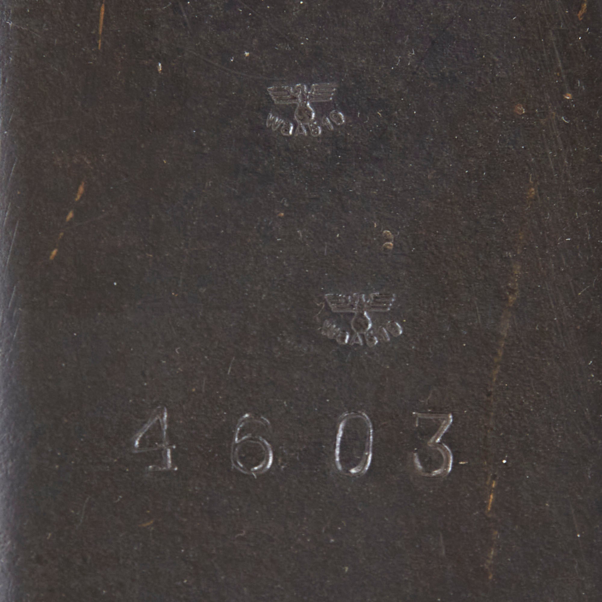 The top cover is marked with original serial number 4603, with no signs of markings having been scrubbed. Just rear of the bulge on the top it is marked with cof for Carl Eickhorn of Solingen, a legendary manufacturer of edged weapons, and a known make of top covers, feed trays, and other MG 42 components. The feed mechanism on the underside of the top cover and the feed tray itself have the same cof marking, and the top cover is marked with two Waffenamt WaA519 stamps, for inspection in Solingen, Germany, correct for Carl Eickhorn. Additionally, the left side of the trigger group is also marked with cof and Waffenamt WaA519 stamps, so this display gun has many components made by the same legendary blade maker.