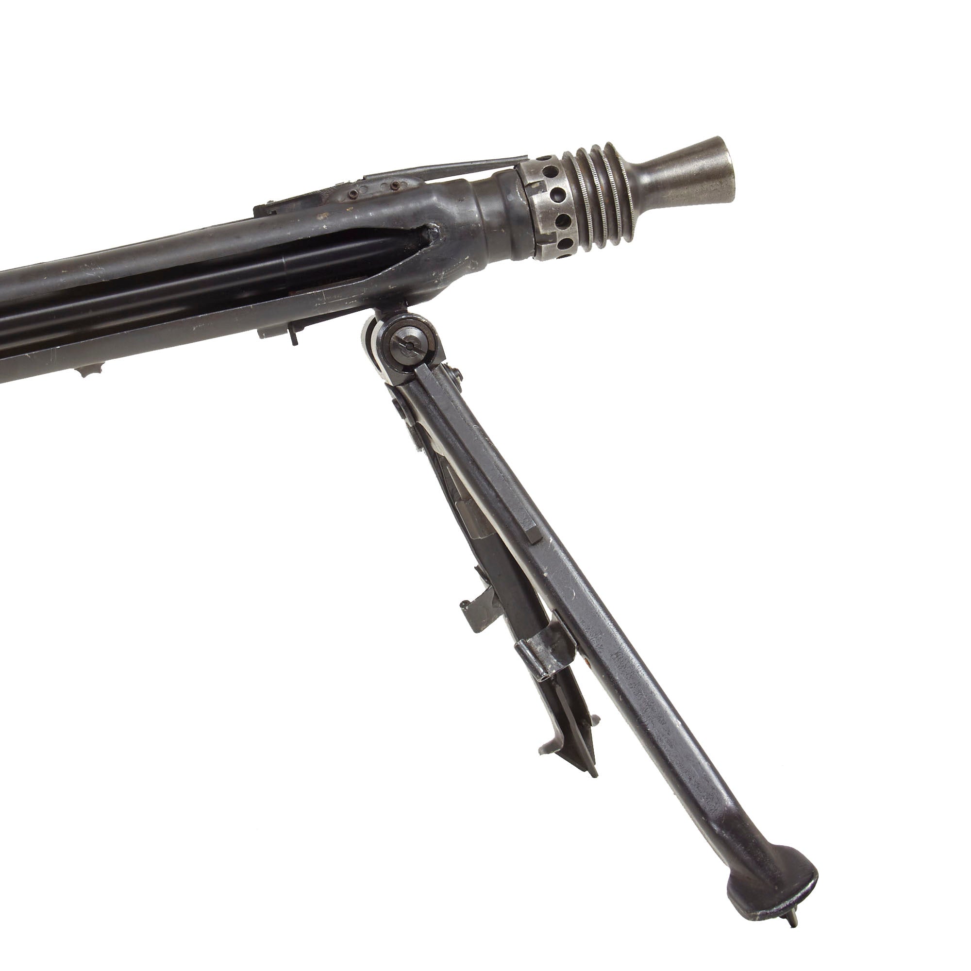 Original Item: Only One Available. Constructed from a legally demilitarized (de-milled) parts set, this is a wonderful and rare German WWII MG42 Display Gun. It is built from all original parts on an original BATF compliant non-firing display receiver, making this a 100% legal display machine gun. This receiver was created by using portions of the original torch cut receiver, including the barrel bushing, combined with some new made solid steel portions. It has properly had a 25% section of the total length completely replaced entirely with solid steel bar stock. Meaning a 1/4 length section of the display receiver is solid steel, making this totally legal to own without a license of any kind. Additionally, it had a barrel welded into the muzzle of the receiver, which does not look to be an MG 42 barrel, so unfortunately the barrel change mechanism opens but is incomplete and non functional.