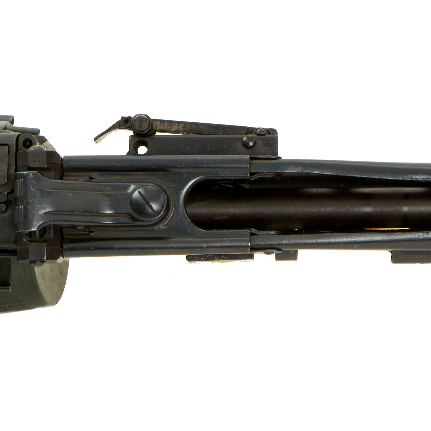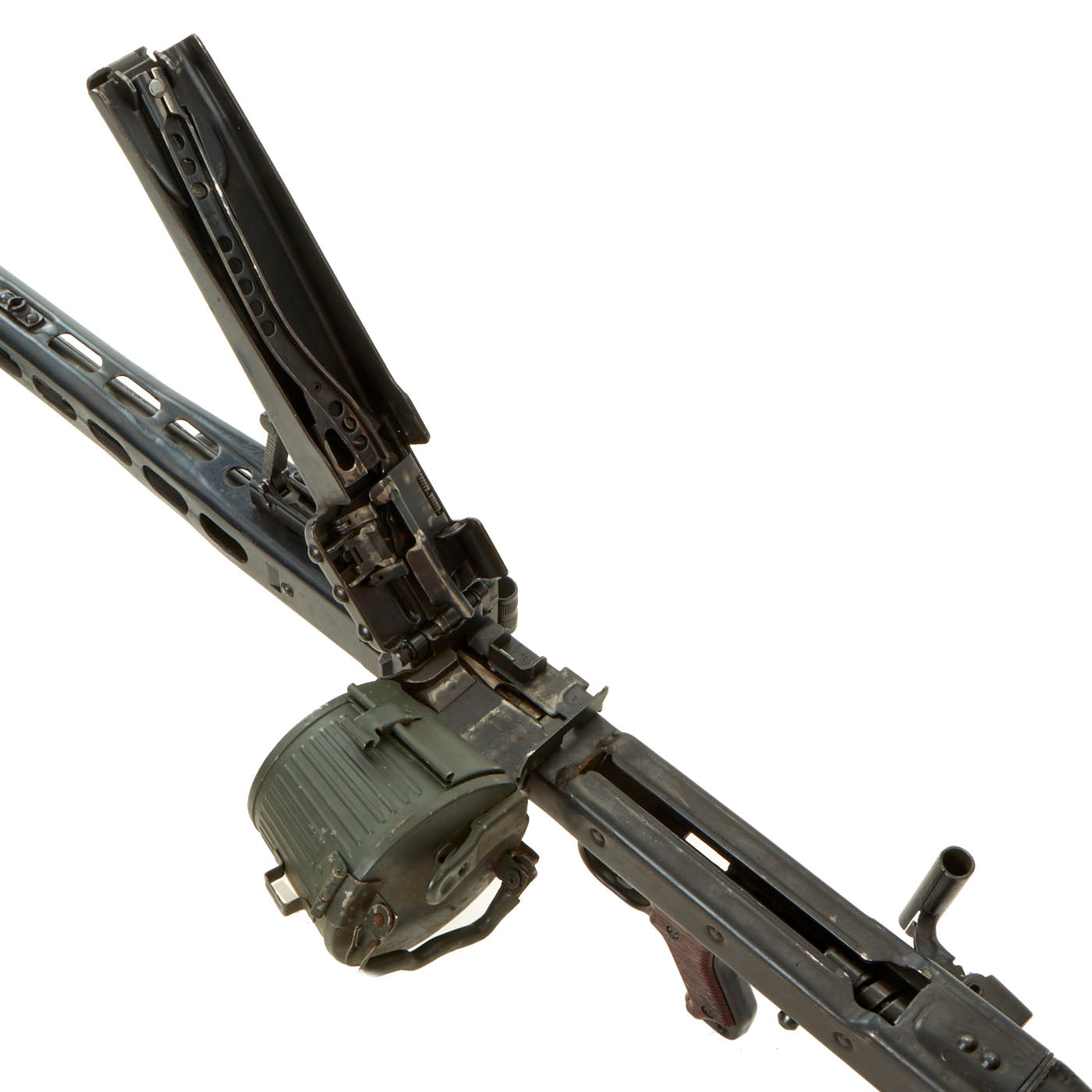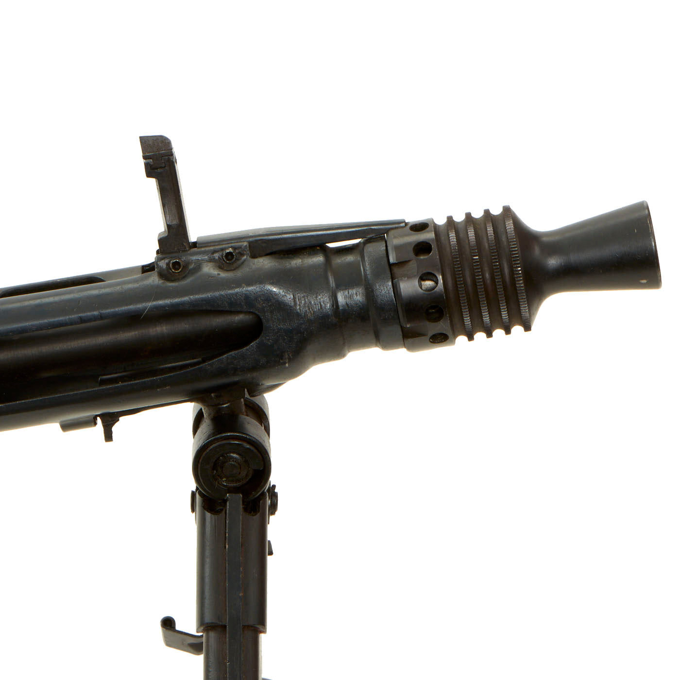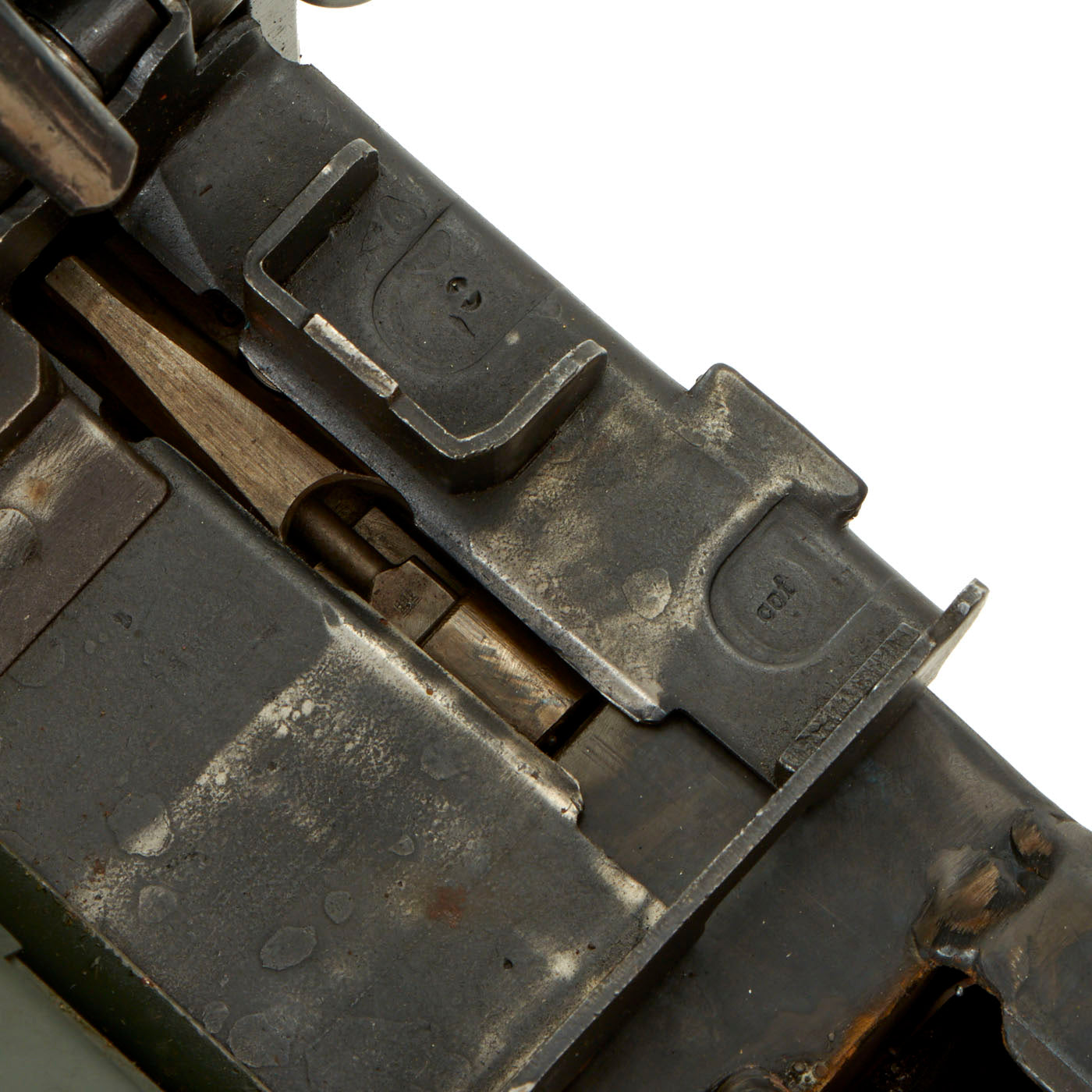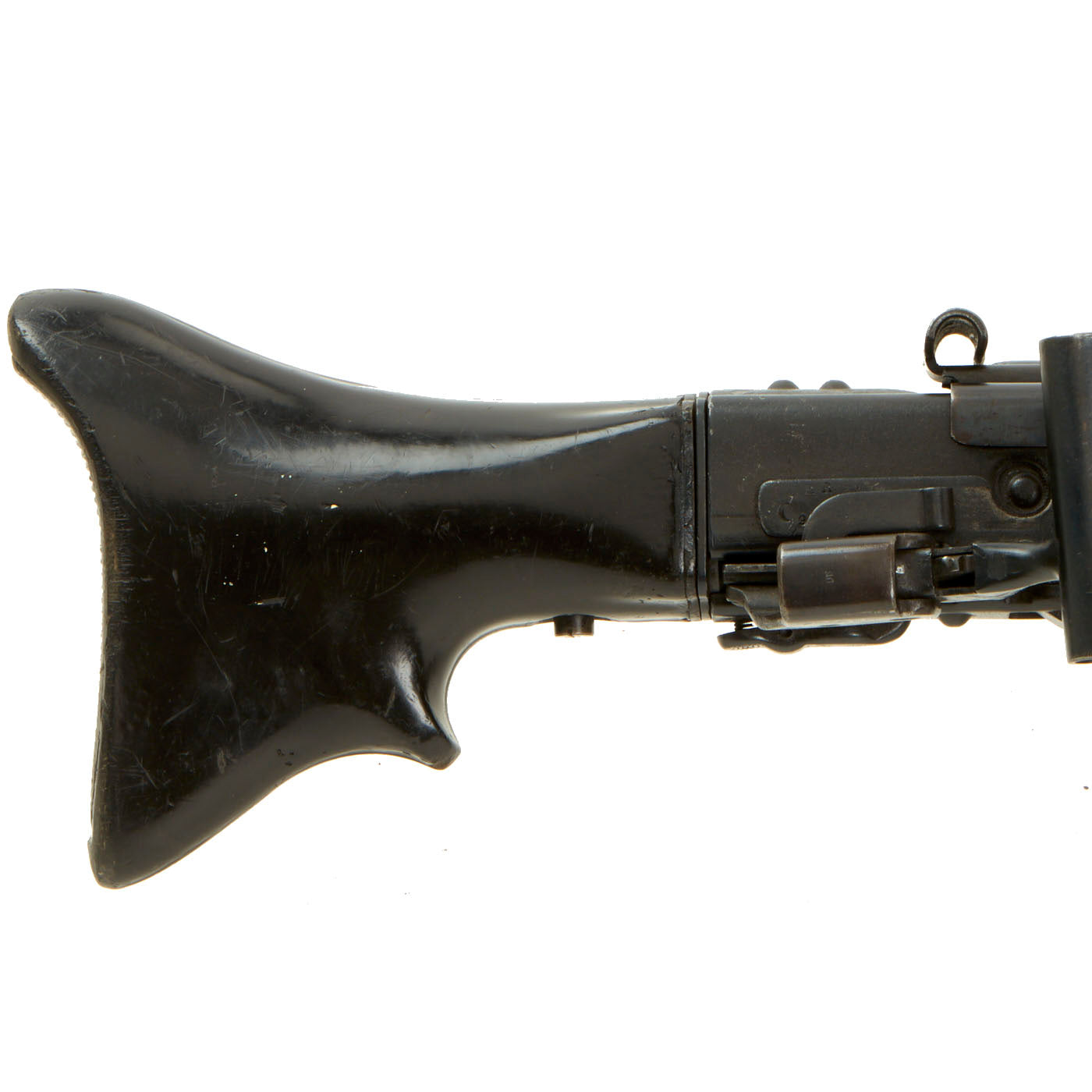 Comprised mostly of original WWII parts, this display gun was reconstructed using a BATF approved receiver with 2 inches totally replaced with solid bar stock, making this an inert non-firing display gun. Comes complete with German WWII issue parts including a rare and desirable bakelite butt-stock, post-war painted drum belt carrier, and bipod. This example even has a fully functioning barrel change assembly!