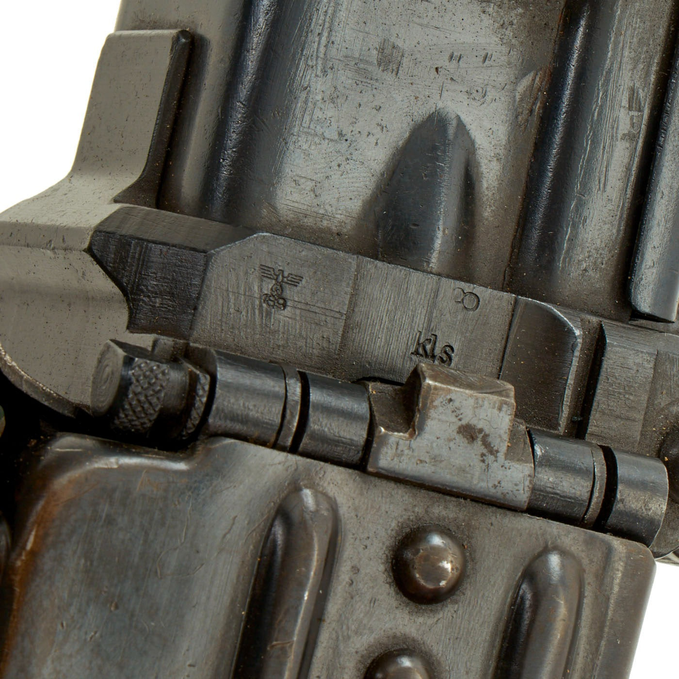 The top cover and feed tray are both maker coded cof for Carl Eickhorn of Solingen, a legendary manufacturer of edged weapons, and a known maker of top covers and feed tray components. The top of the barrel trunion "camming block" by the barrel door is marked kls, for manufacture by Steyr-Daimler-Puch AG, Warsaw plant, Poland. The bipod is the correct type and is in great shape, though it has had the original wartime markings removed. The butt stock is a rare bakelite example, and is unmarked as far as we can see. This display gun bears additional markings on various components.
