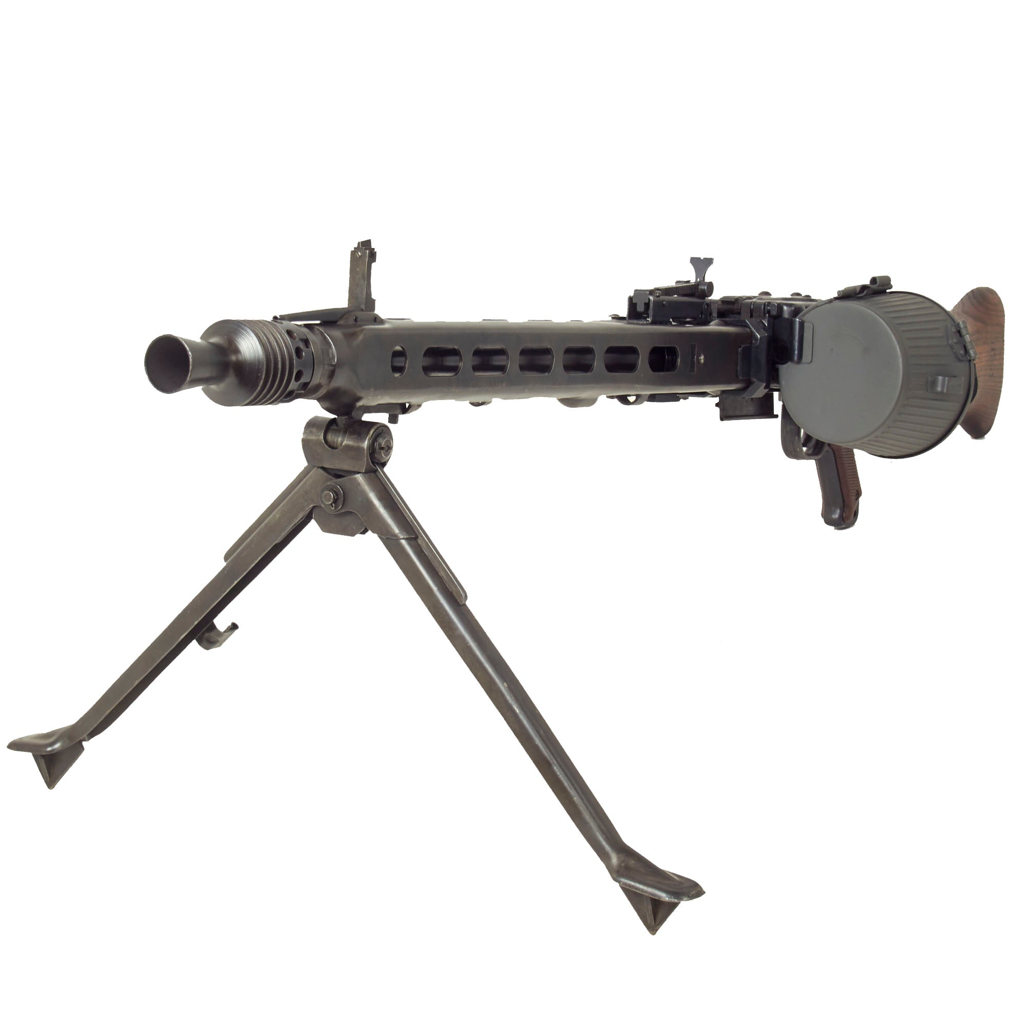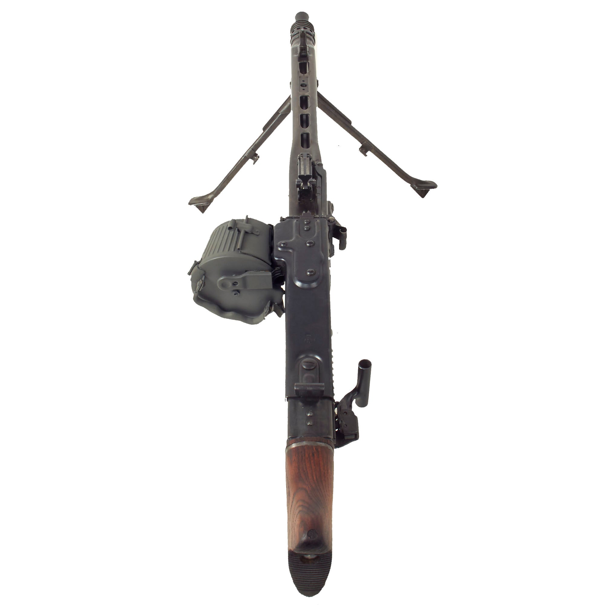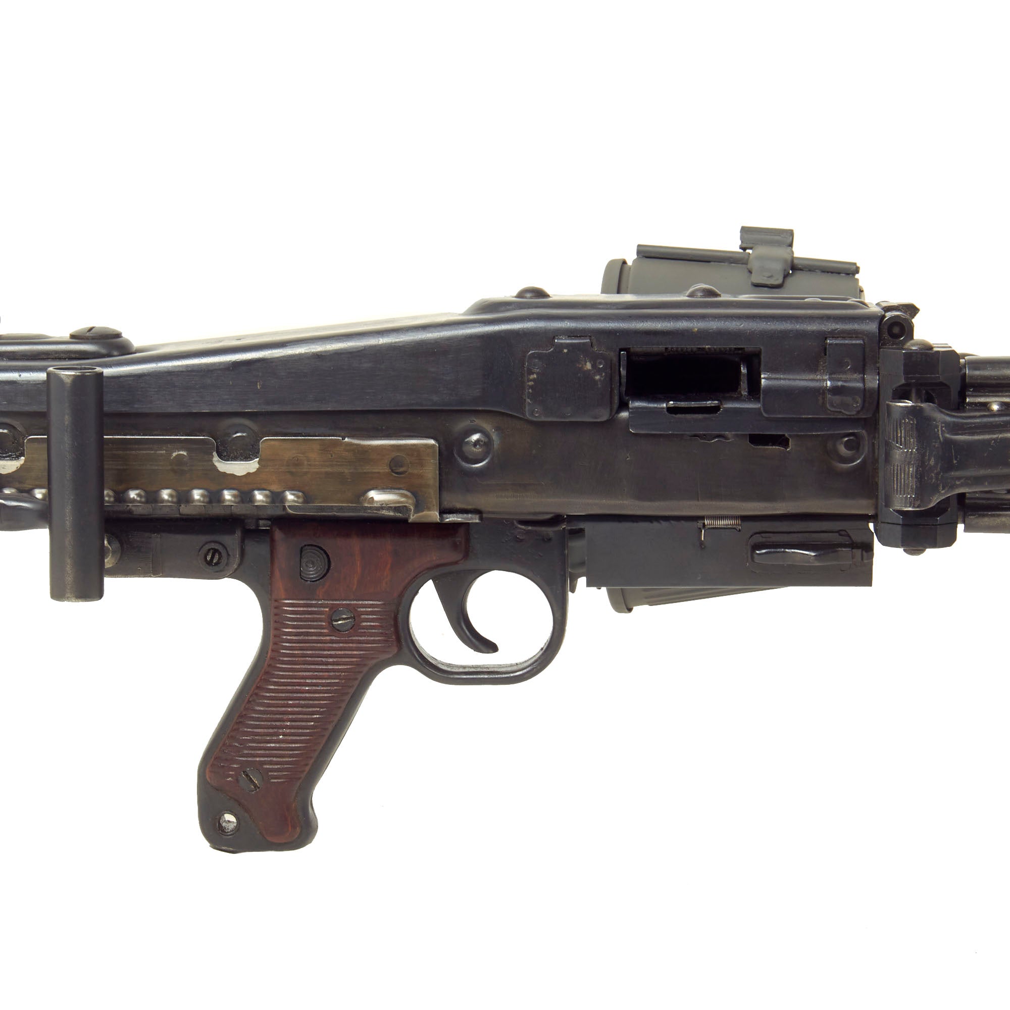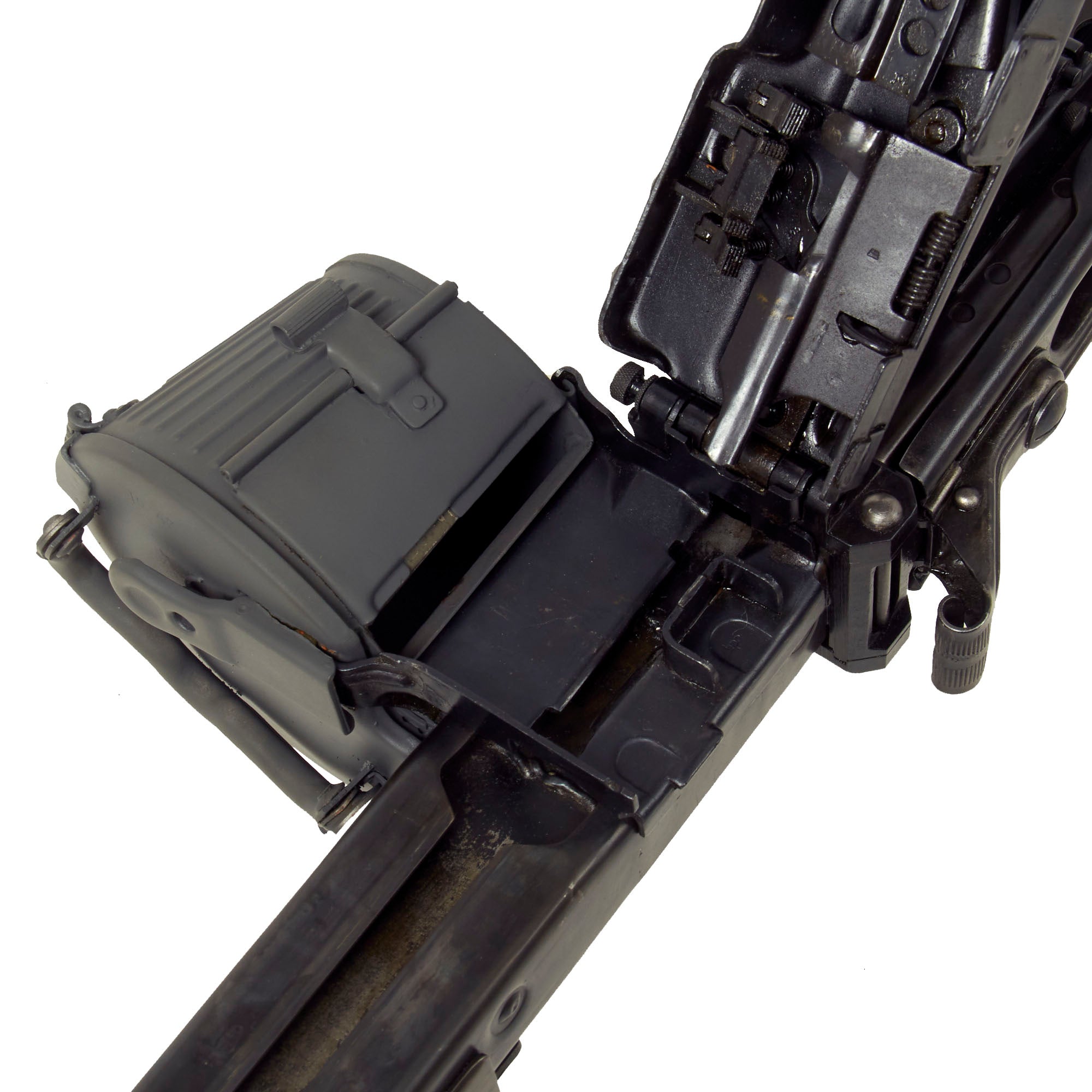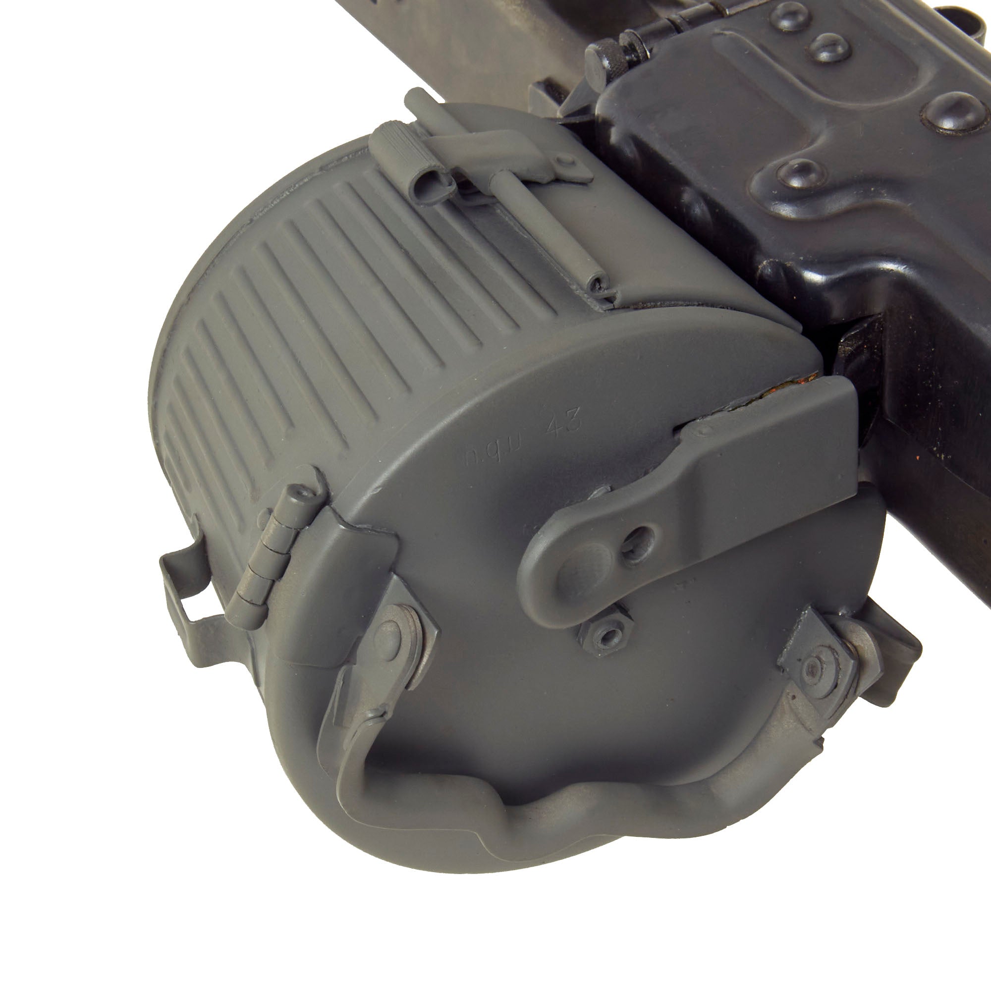 Comprised almost all original WWII parts, this display gun was reconstructed using a BATF approved re-welded receiver with two inches completely replaced with solid steel bar stock, making this an inert non-firing display gun. Comes complete with German WWII issue parts including a wooden butt-stock, bipod, and a post-war repainted drum belt carrier which has been repainted with our panzergrau spray paint. This example even has a fully functioning barrel change assembly! Please note that the barrel must be in the forward position for it to open.