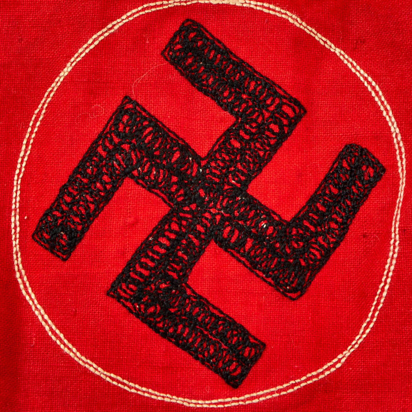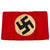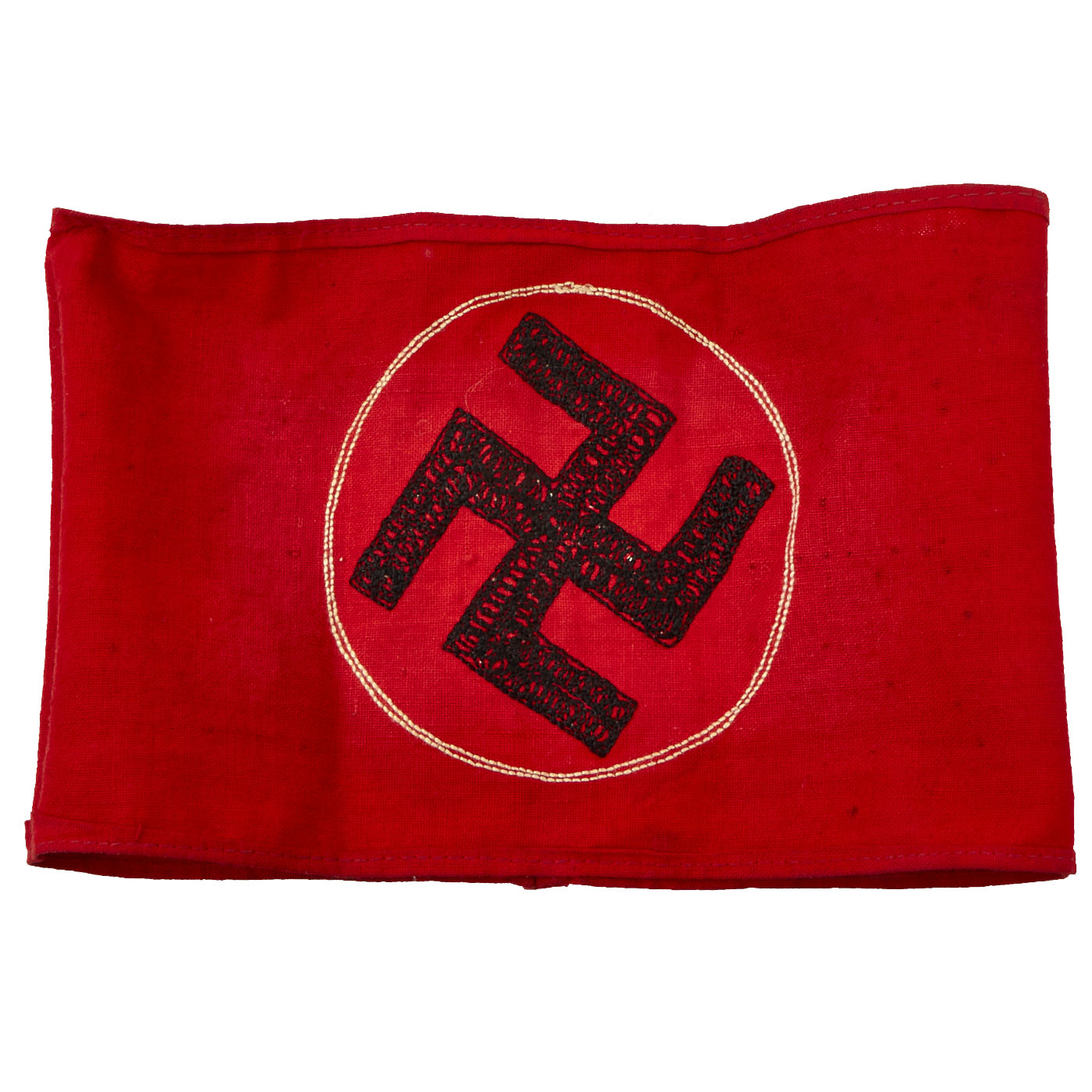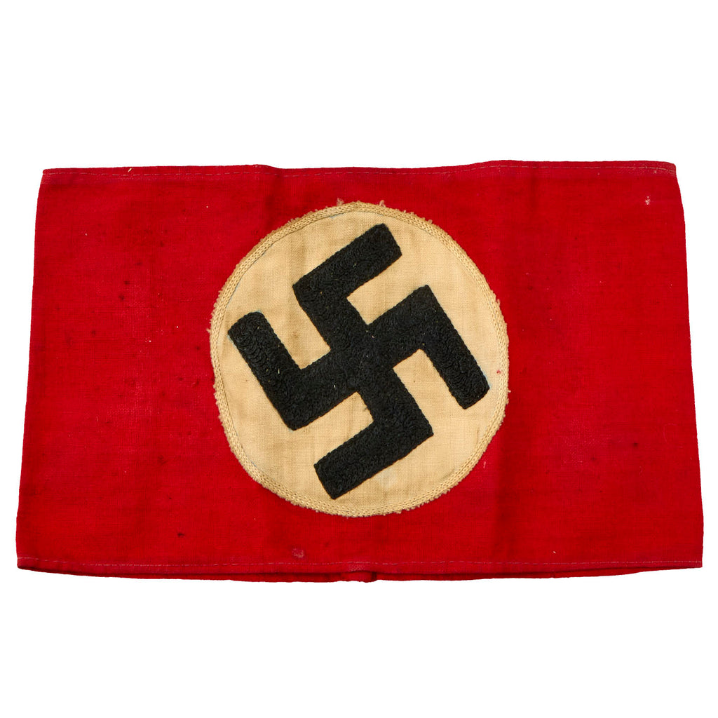 This standard armband was worn by party members, and was also worn by many service members and other personnel during the war. It is in good service worn condition, and measures approximately 14" x 4 1/4", with the ends sewn together. It is definitely one of the rarer types, with a red background and an embroidered black Swas machine woven onto a white cloth circle, which is stitched to the band.