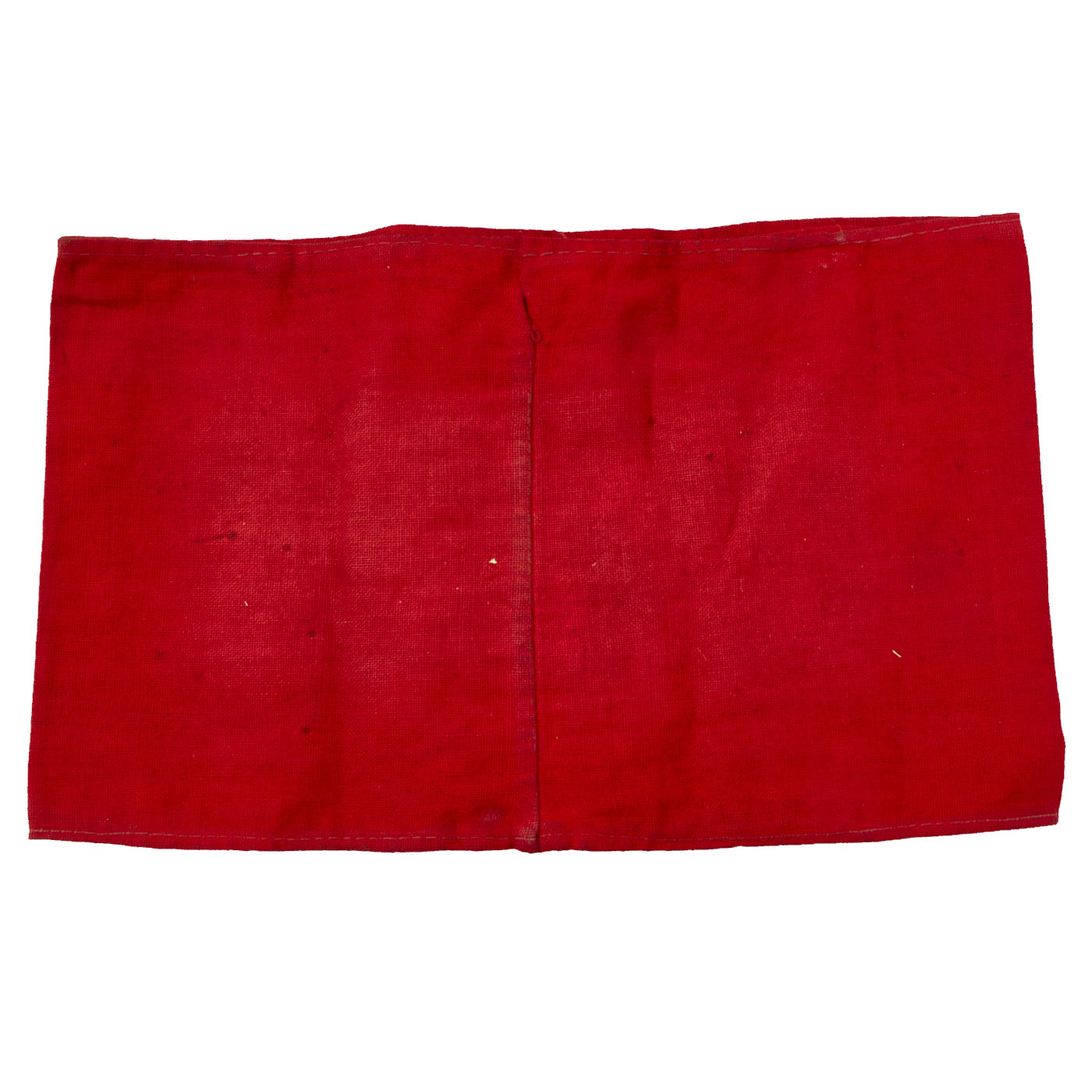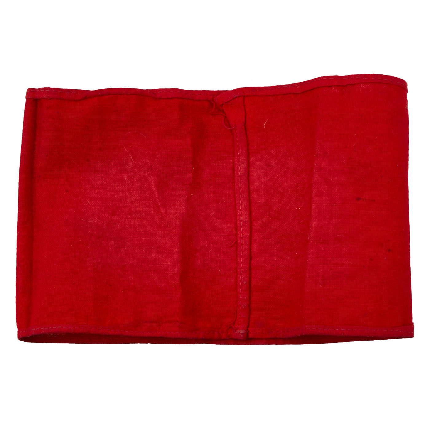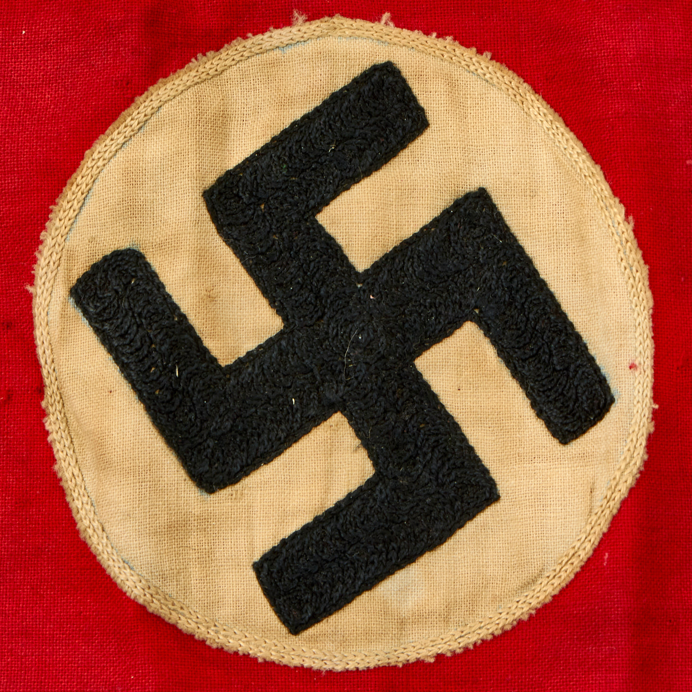 This standard armband was worn by party members, and was also worn by many service members and other personnel during the war. It is in good service worn condition, and measures approximately 14" x 4 1/4", with the ends sewn together. It is definitely one of the rarer types, with a red background and an embroidered black Swas machine woven onto a white cloth circle, which is stitched to the band.