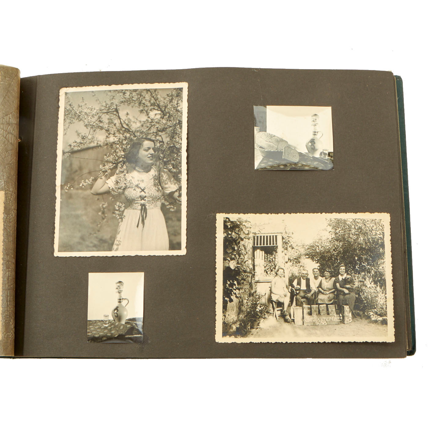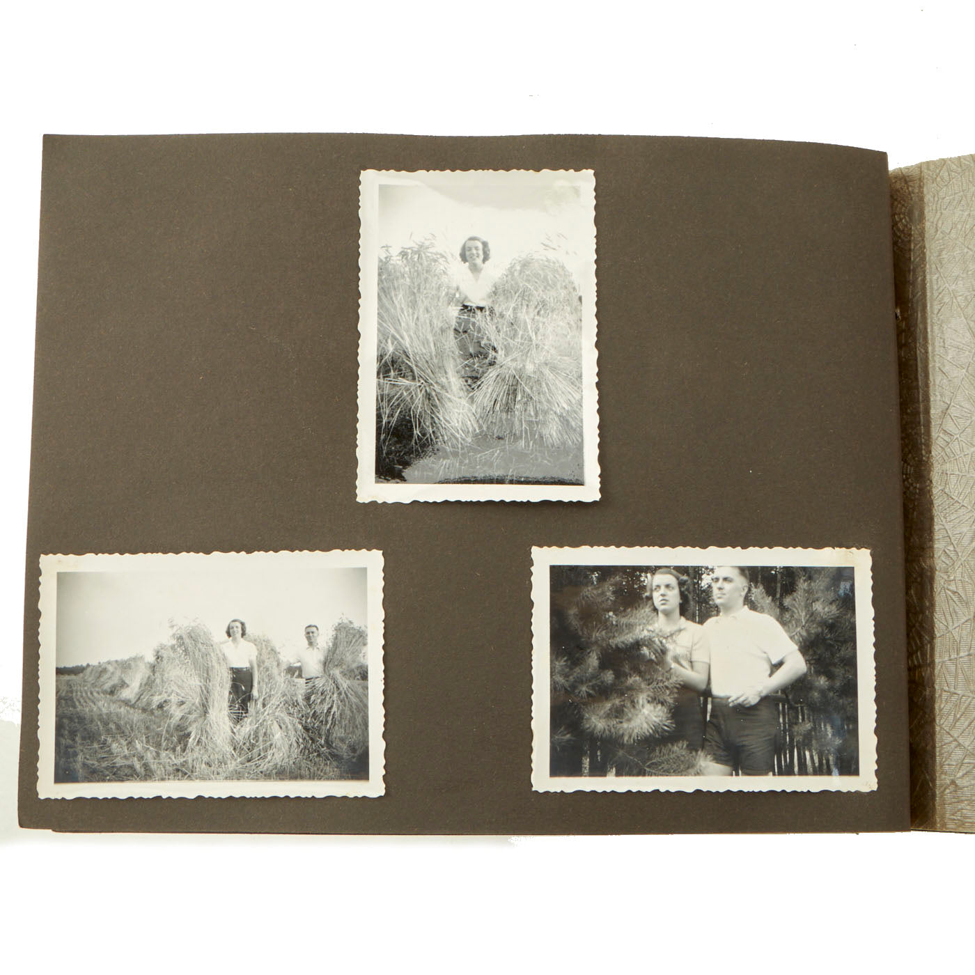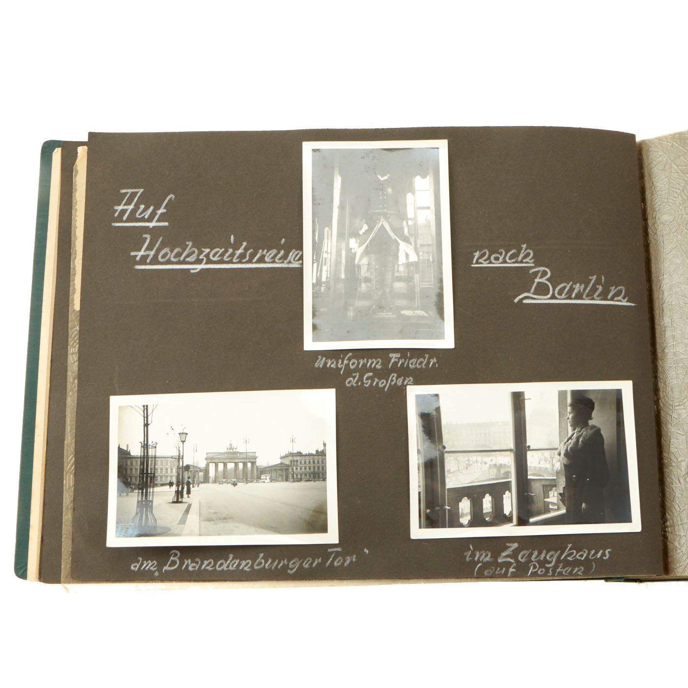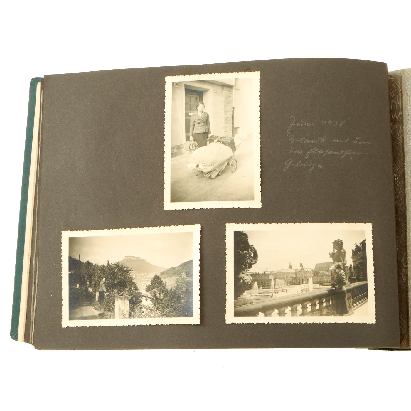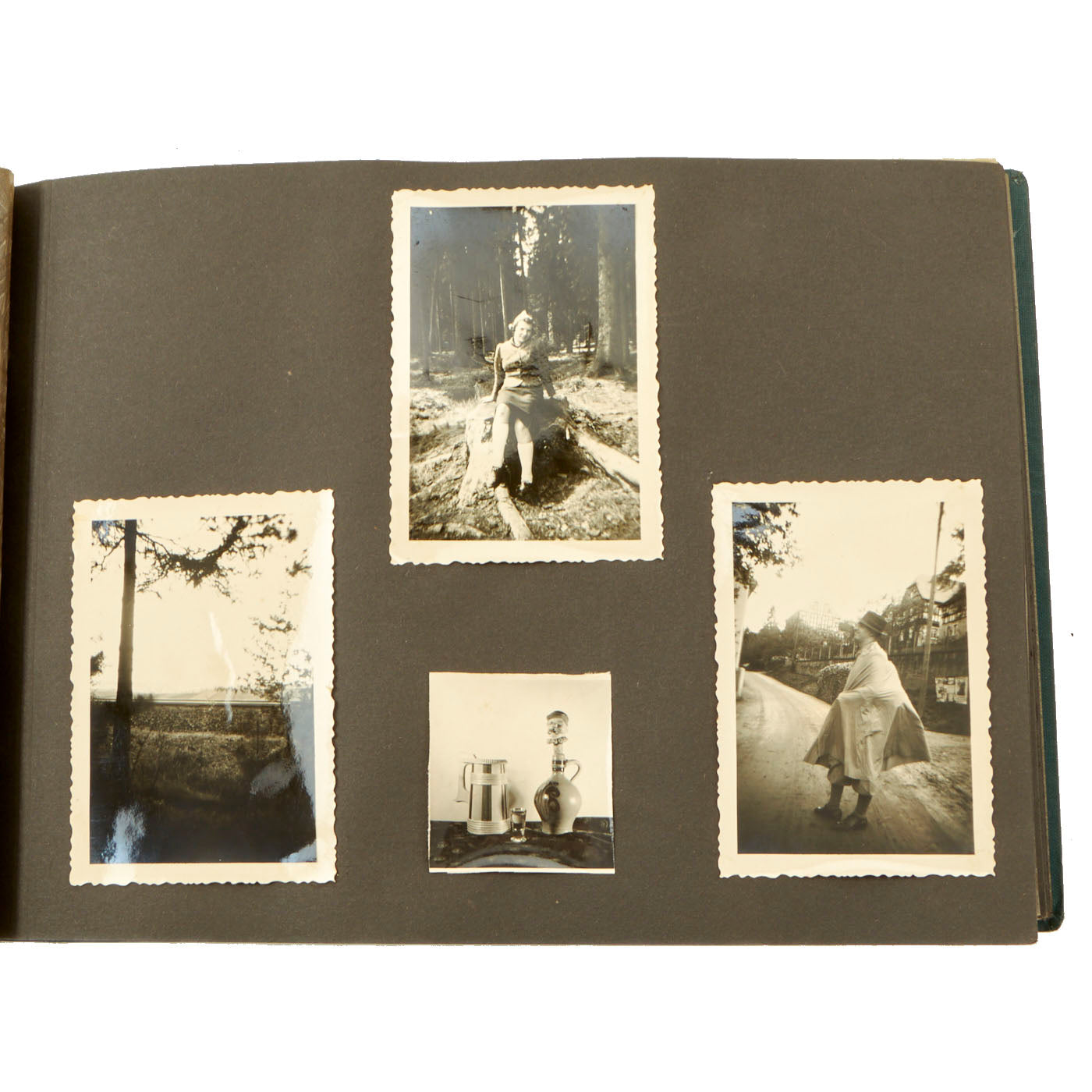 The first page appears to have the pictures of German high command removed and overall there are 30 pages in total, with "onion skin" separators to keep the pages from sticking together. There are over 170 personal photographs of various sizes, showing all manner of scenes and locations. Most of the pictures appear to be from a wedding and a honeymoon/vacation. There are various military pictures dating from 1937-1942 but mostly show homefront life and leave. Most photos seem to be held in by the original adhesive, though it is possible that they were reattached over the years.