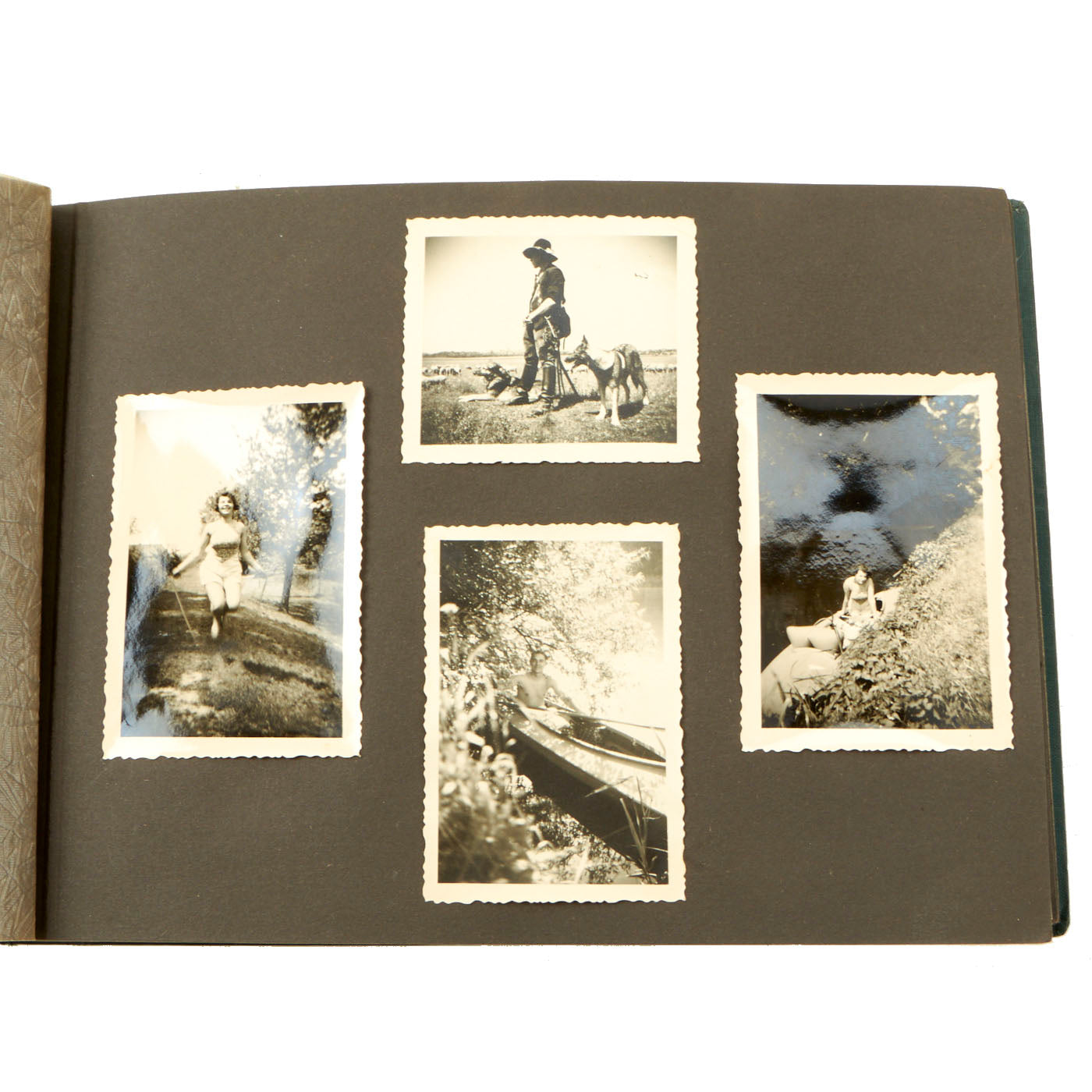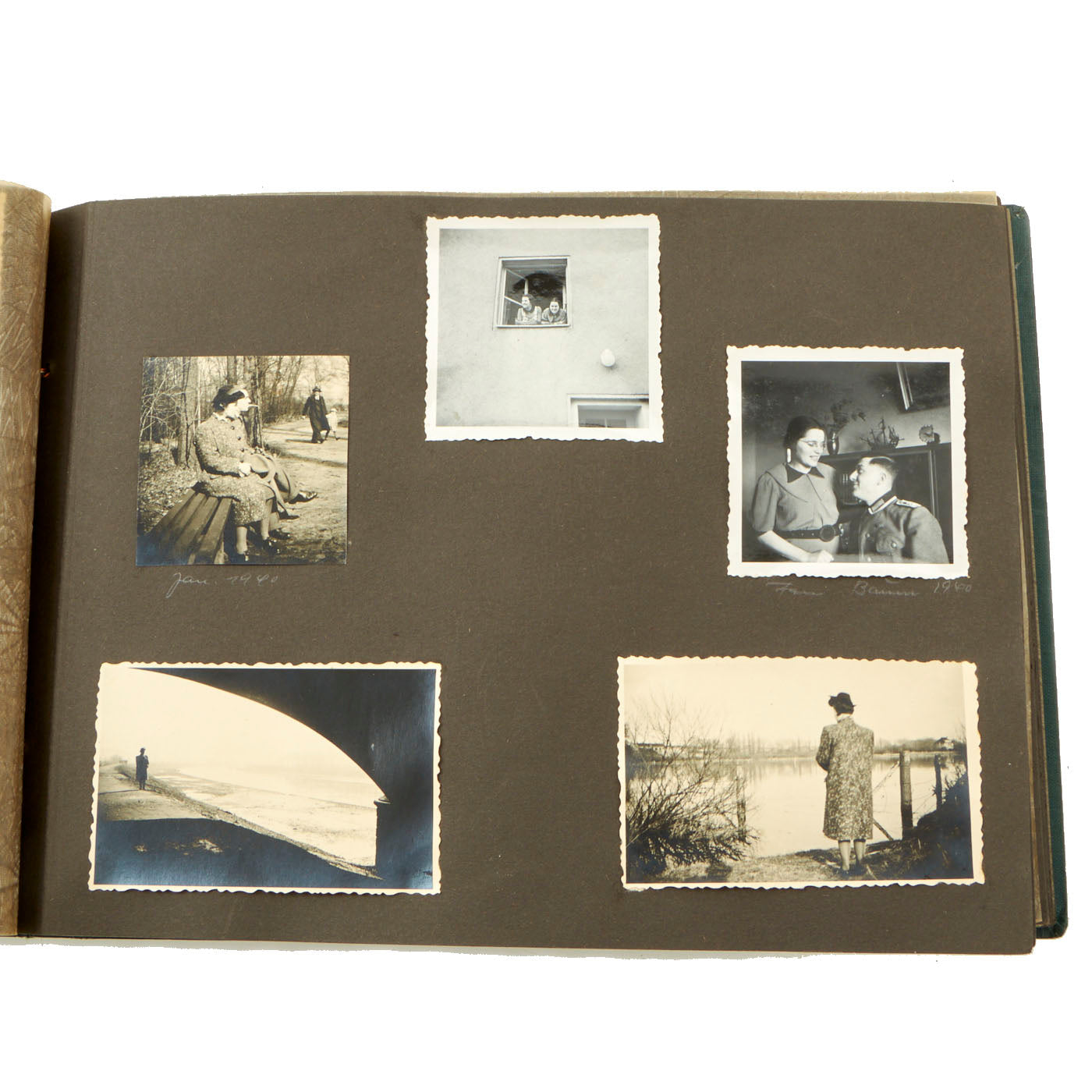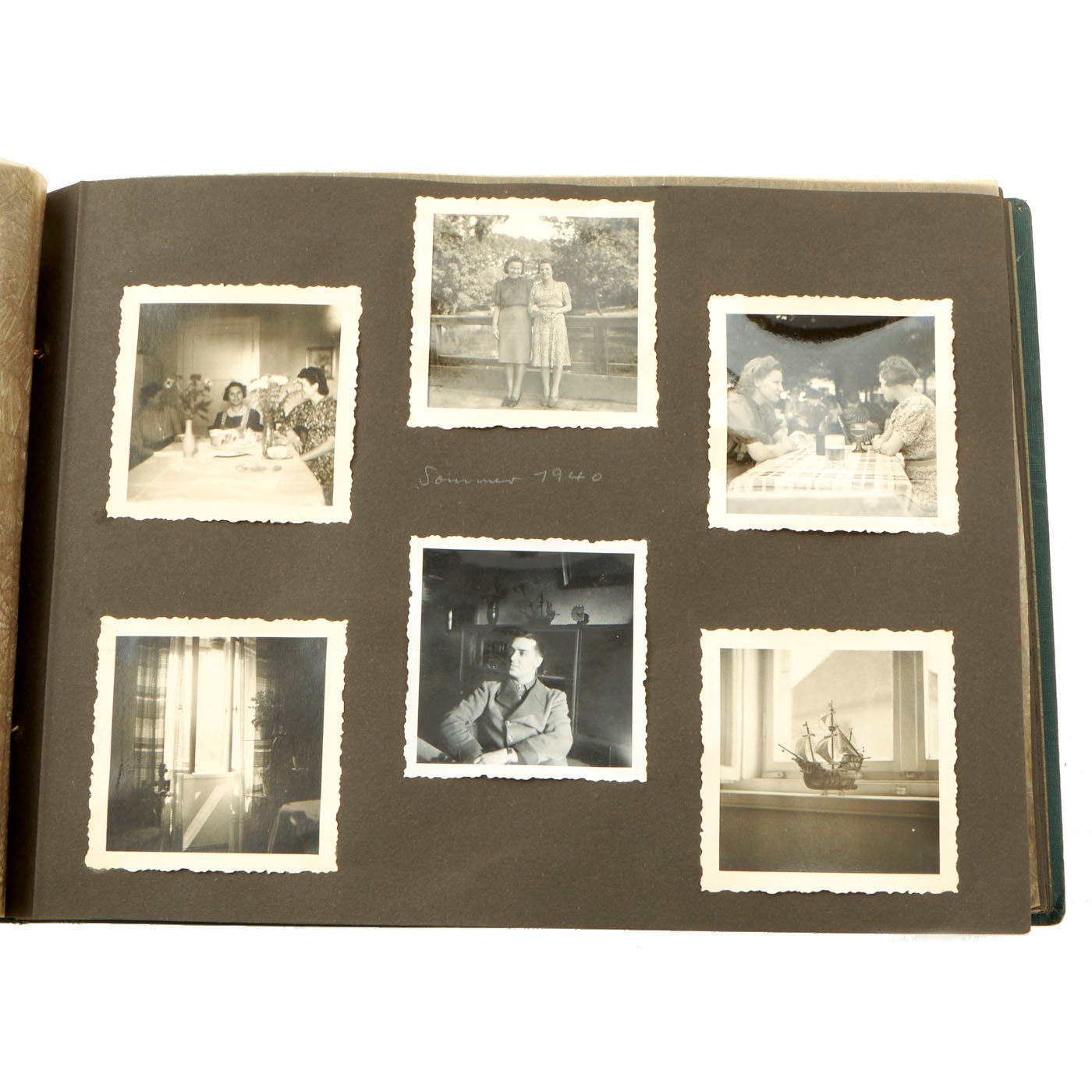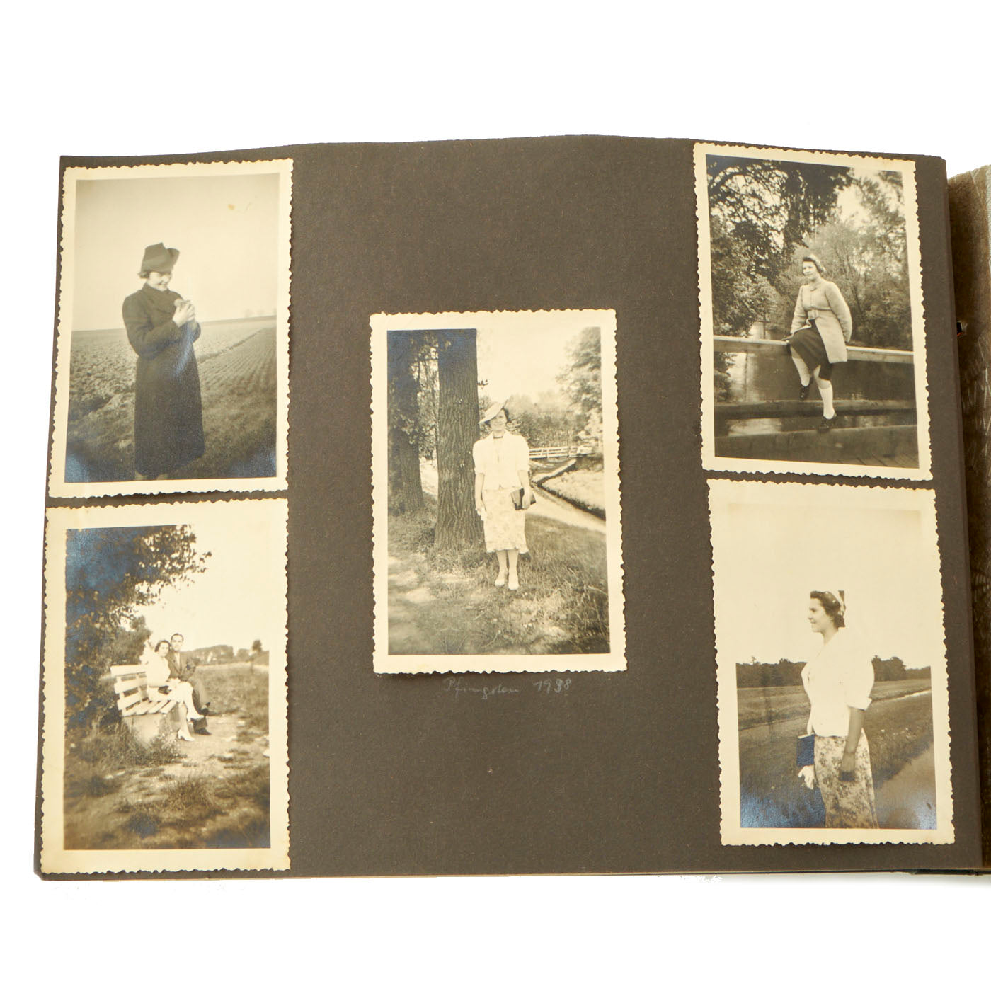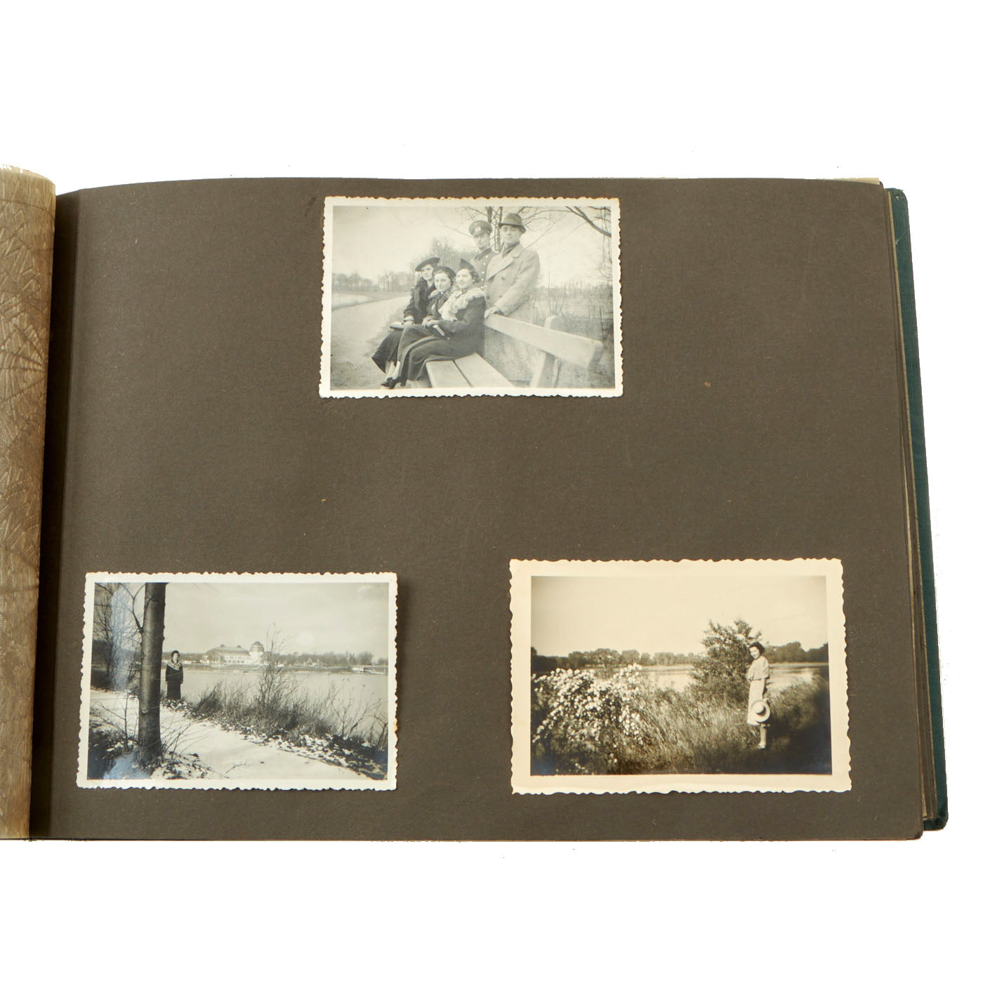 The first page appears to have the pictures of German high command removed and overall there are 30 pages in total, with "onion skin" separators to keep the pages from sticking together. There are over 170 personal photographs of various sizes, showing all manner of scenes and locations. Most of the pictures appear to be from a wedding and a honeymoon/vacation. There are various military pictures dating from 1937-1942 but mostly show homefront life and leave. Most photos seem to be held in by the original adhesive, though it is possible that they were reattached over the years.