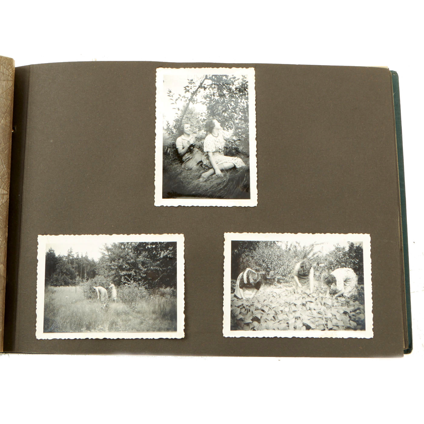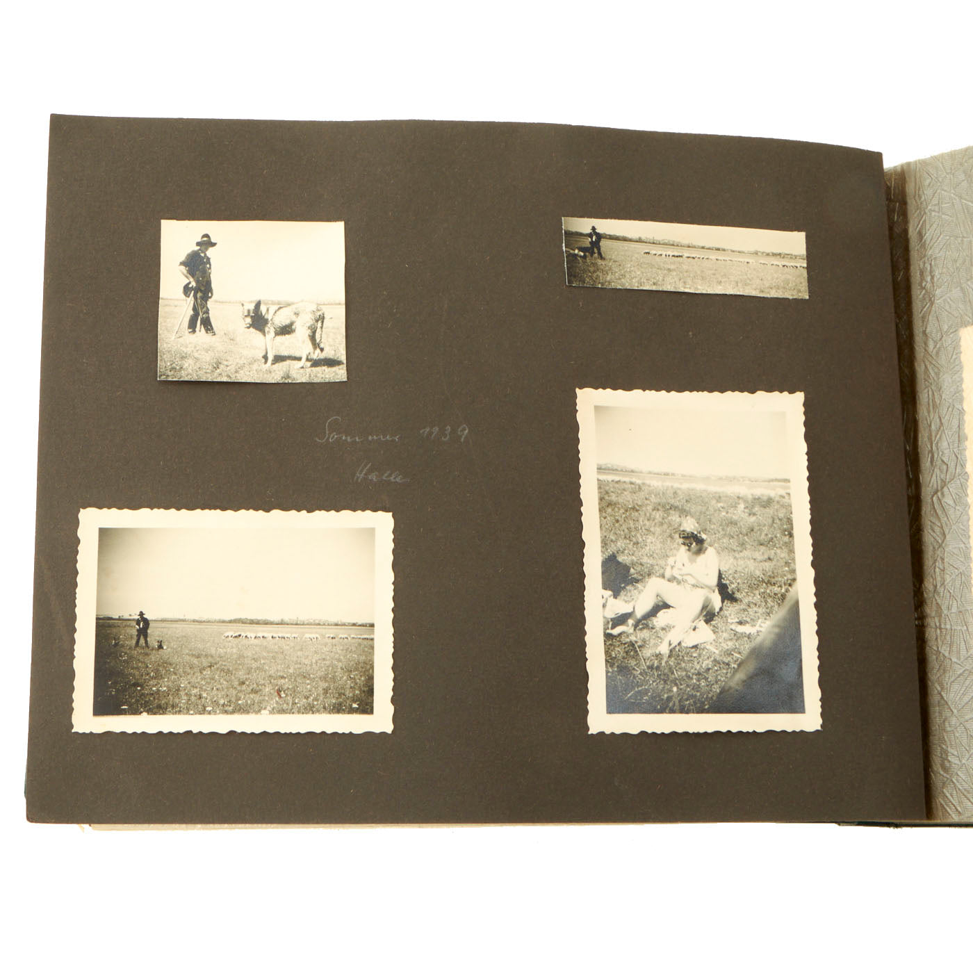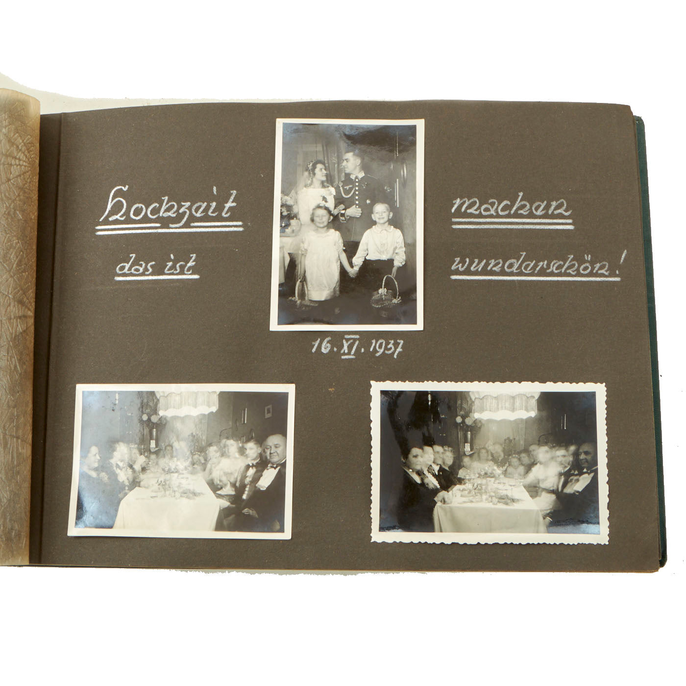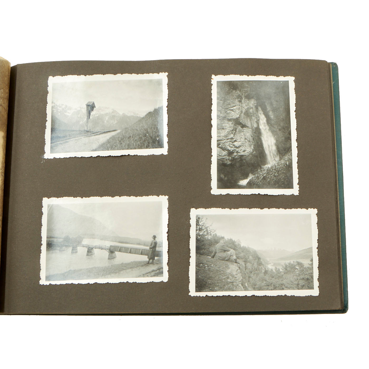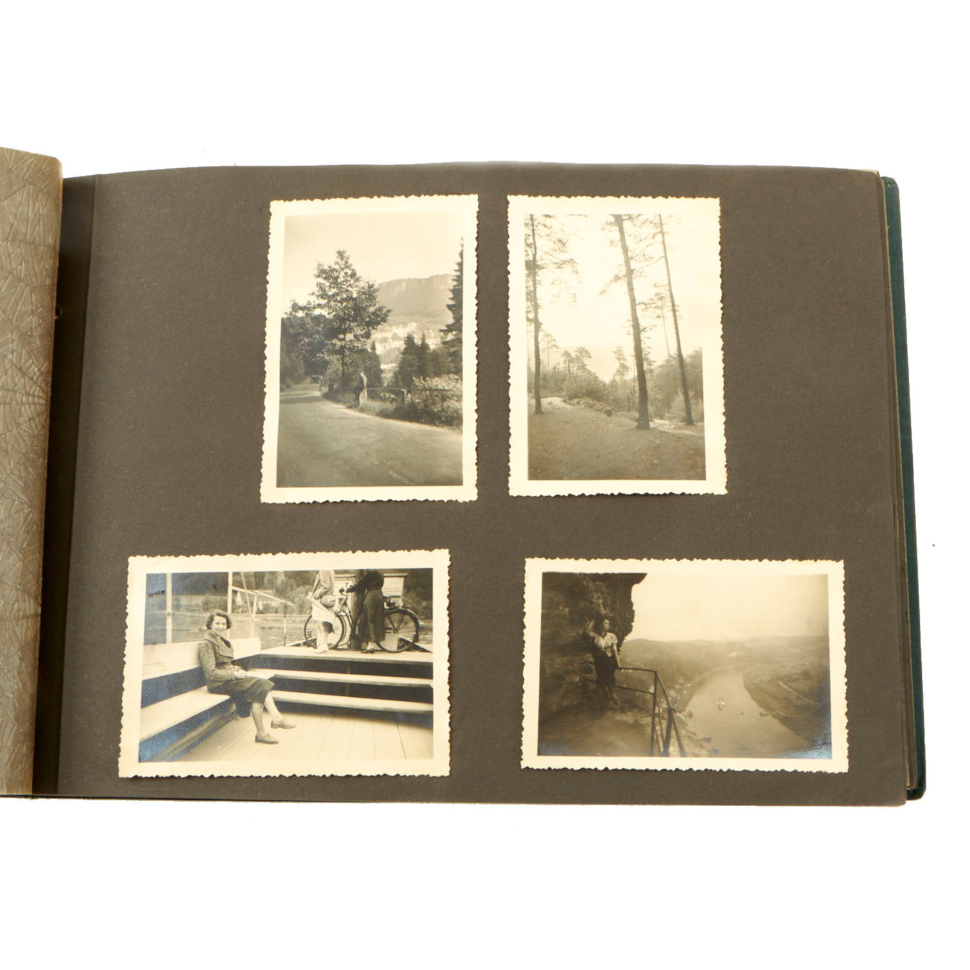 The first page appears to have the pictures of German high command removed and overall there are 30 pages in total, with "onion skin" separators to keep the pages from sticking together. There are over 170 personal photographs of various sizes, showing all manner of scenes and locations. Most of the pictures appear to be from a wedding and a honeymoon/vacation. There are various military pictures dating from 1937-1942 but mostly show homefront life and leave. Most photos seem to be held in by the original adhesive, though it is possible that they were reattached over the years.