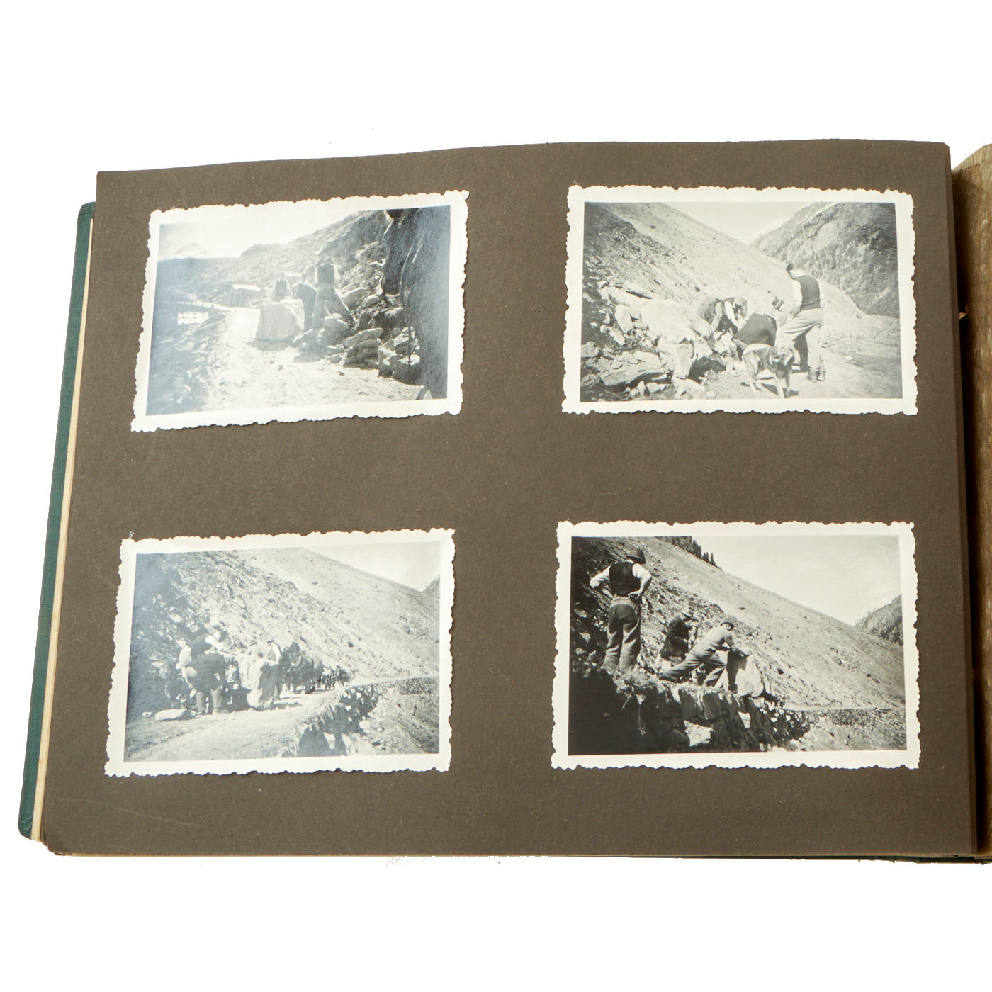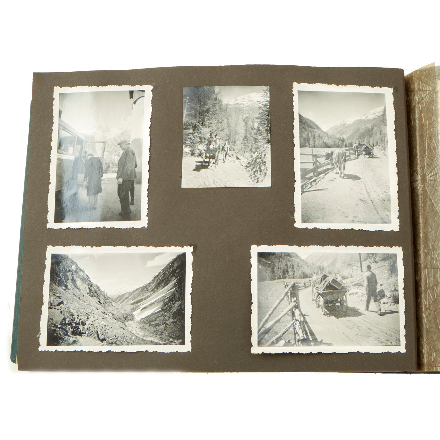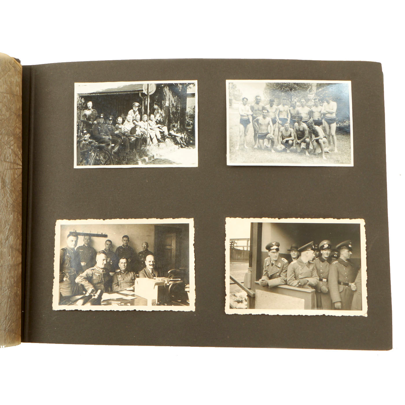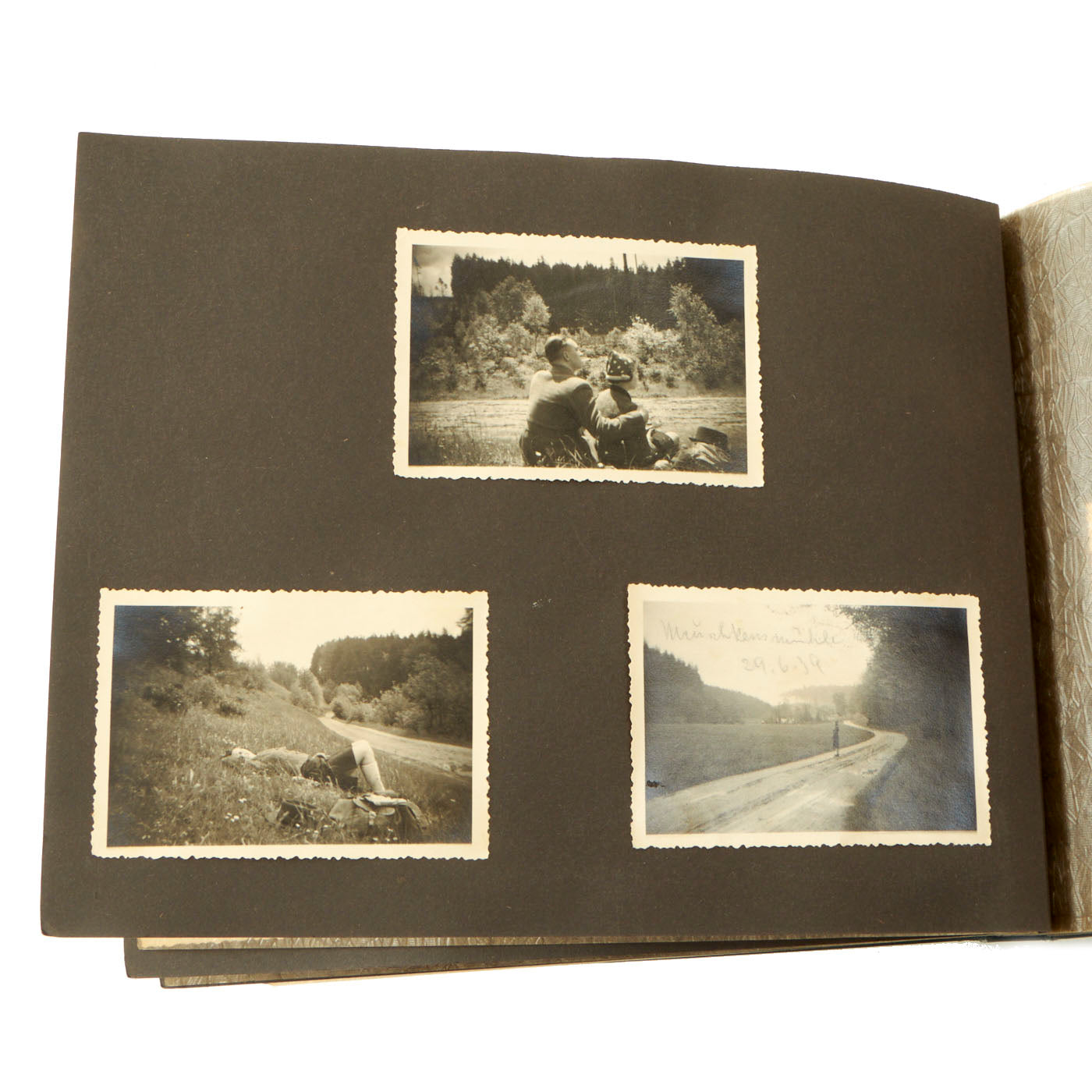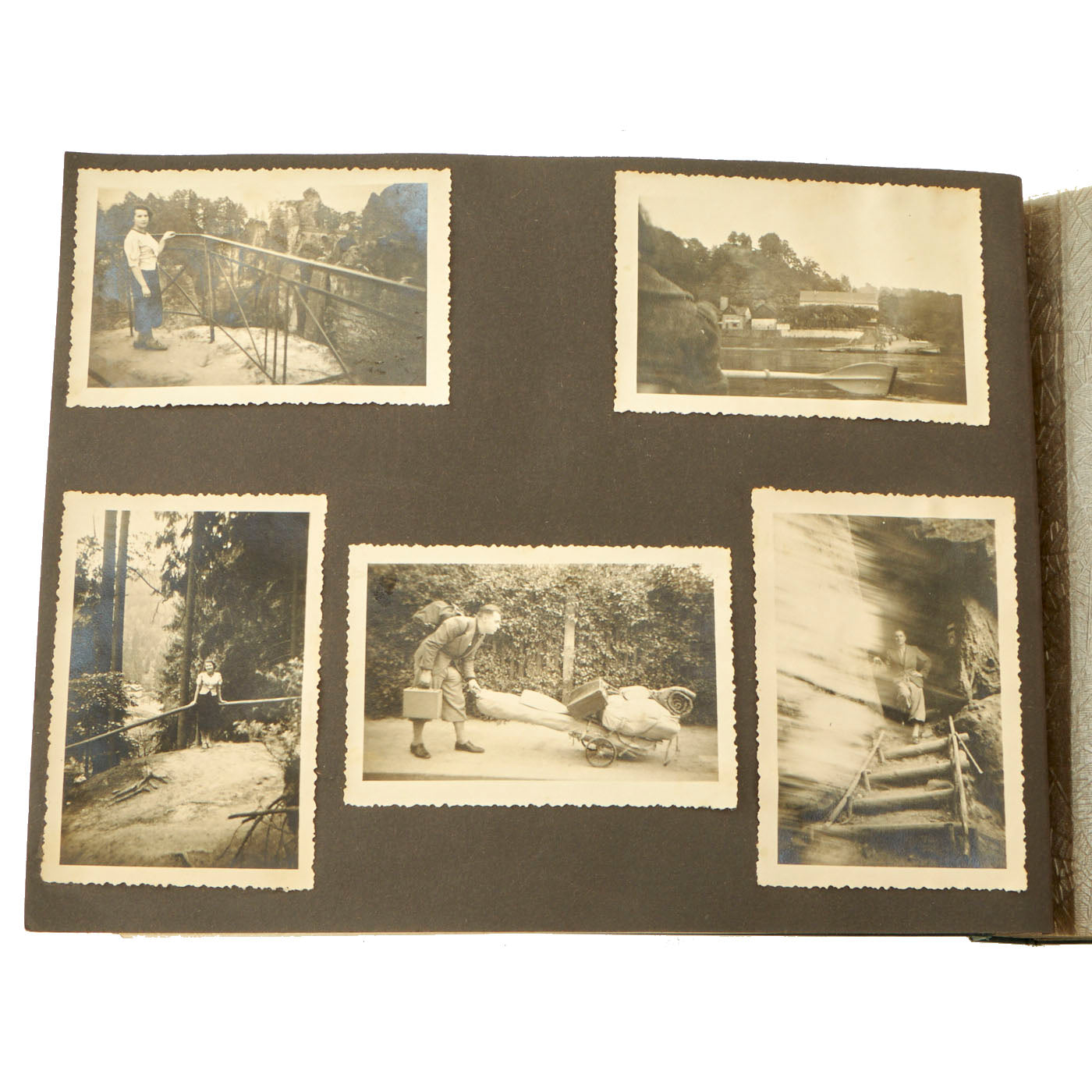 The first page appears to have the pictures of German high command removed and overall there are 30 pages in total, with "onion skin" separators to keep the pages from sticking together. There are over 170 personal photographs of various sizes, showing all manner of scenes and locations. Most of the pictures appear to be from a wedding and a honeymoon/vacation. There are various military pictures dating from 1937-1942 but mostly show homefront life and leave. Most photos seem to be held in by the original adhesive, though it is possible that they were reattached over the years.