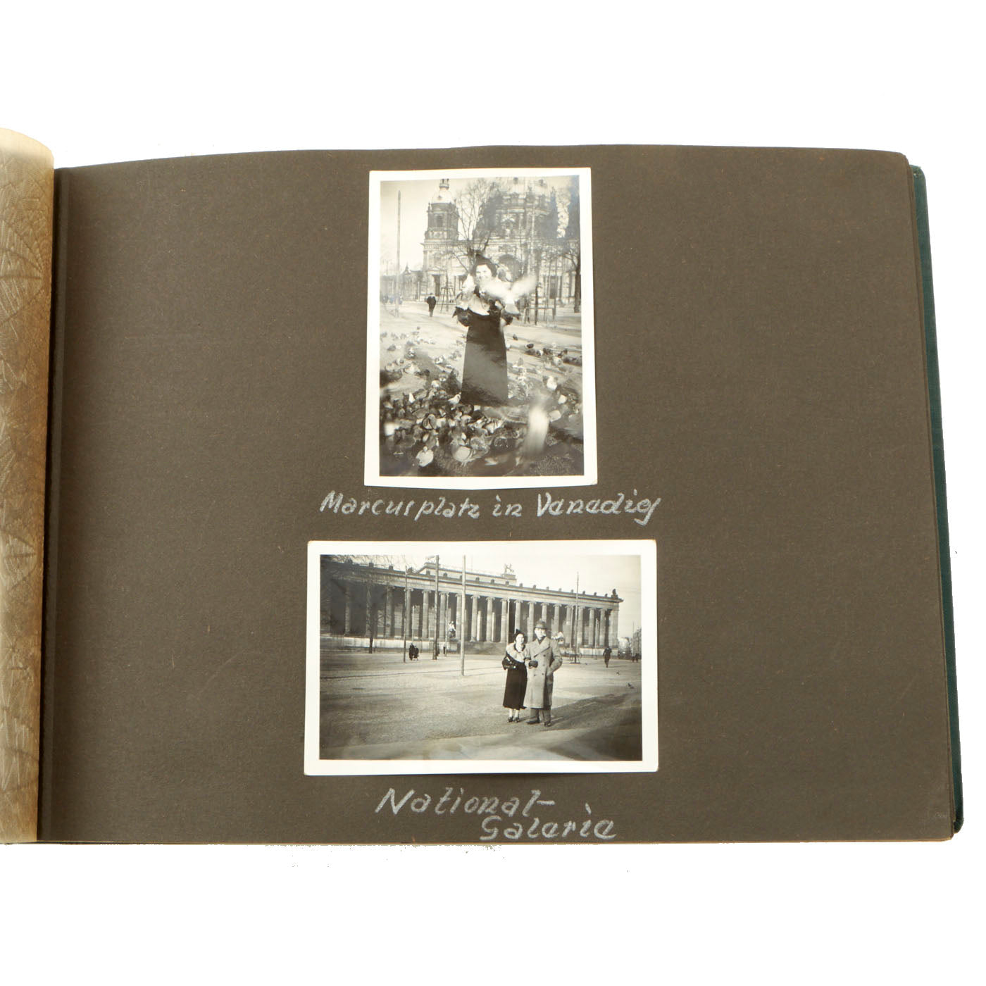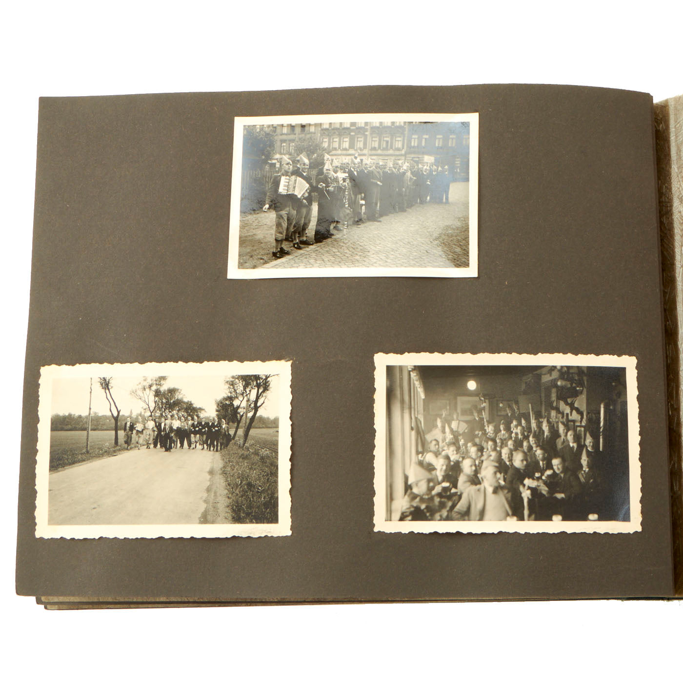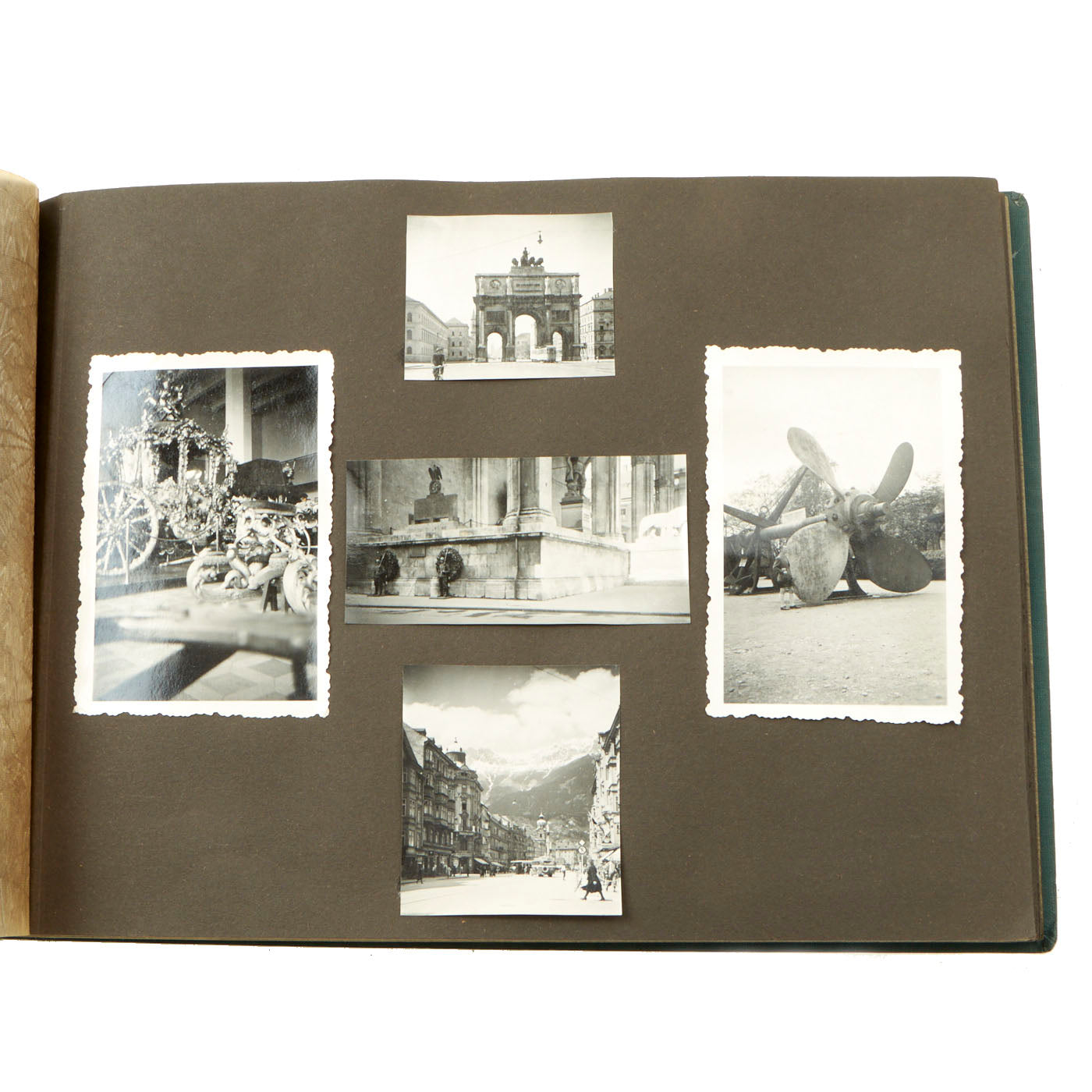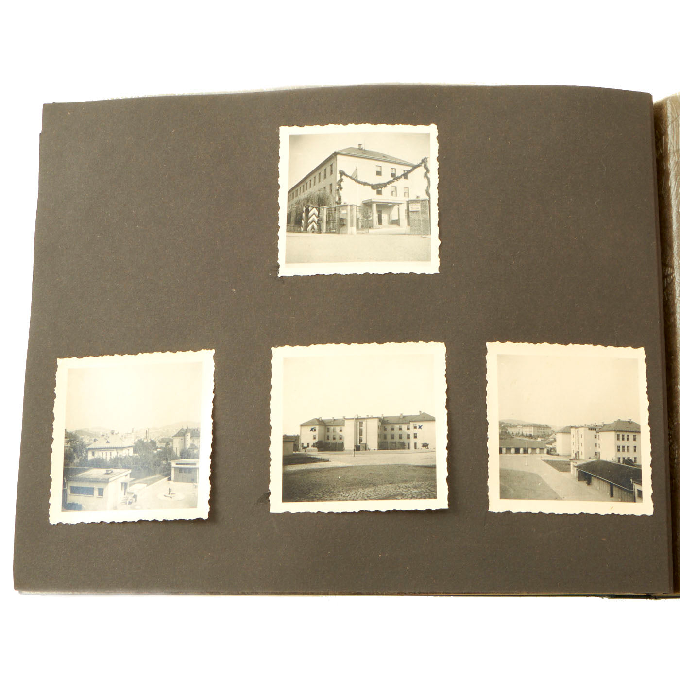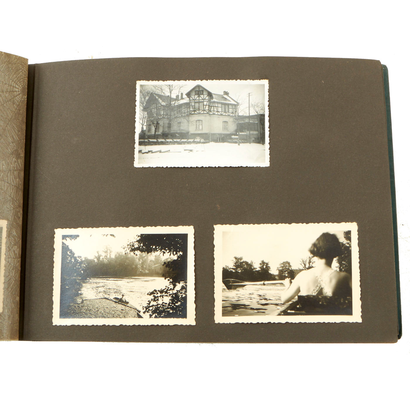 The first page appears to have the pictures of German high command removed and overall there are 30 pages in total, with "onion skin" separators to keep the pages from sticking together. There are over 170 personal photographs of various sizes, showing all manner of scenes and locations. Most of the pictures appear to be from a wedding and a honeymoon/vacation. There are various military pictures dating from 1937-1942 but mostly show homefront life and leave. Most photos seem to be held in by the original adhesive, though it is possible that they were reattached over the years.