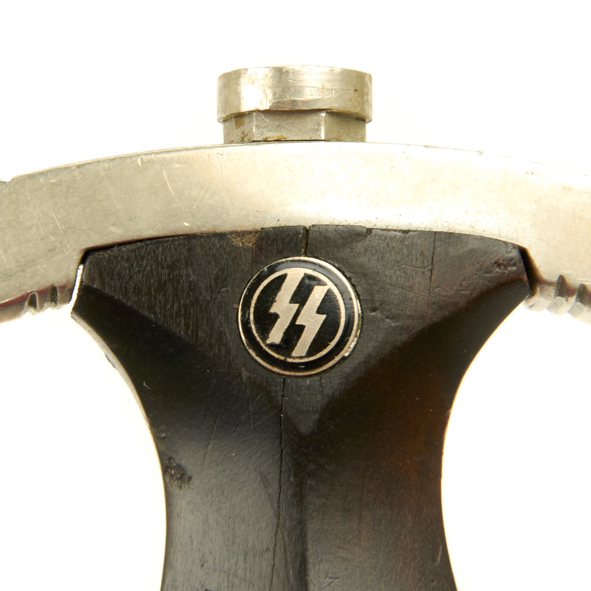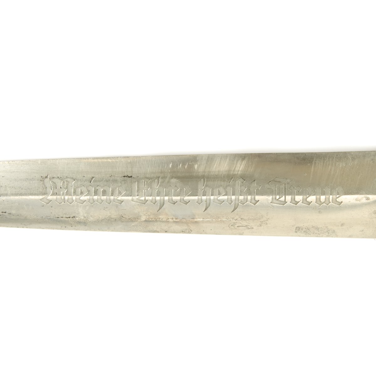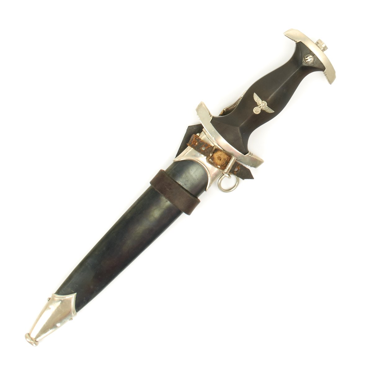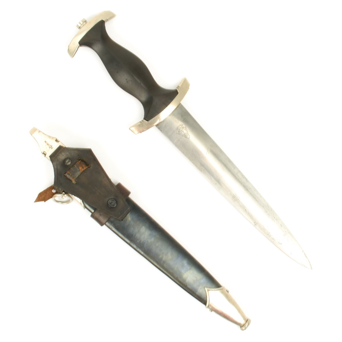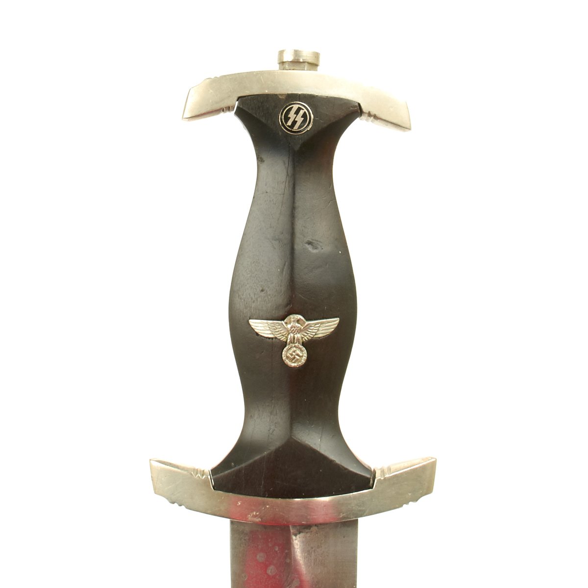 The SS Dagger was equipped with nickel crossguards with an ebony wood grip. The black grip contained a National eagle with swas insignia recessed in the center area and an SS sigrunne button inset at the top. On early examples the scabbard shell surface was factory blackened using a metal bluing process. The scabbard had nickel mounts. The SS blade was a polished type containing the SS motto, Meine Ehre Heisst Treue (My Honor is Loyalty). Early examples bore one of three district stampings on the lower reverse crossguard of I, II, or III. Early examples were mostly hand-fit. Production of later examples was more standardized, using cheaper, nickel-plated fittings with black painted scabbard shells. They could be held with a standard belt hanger, or a much rarer vertical hanger.