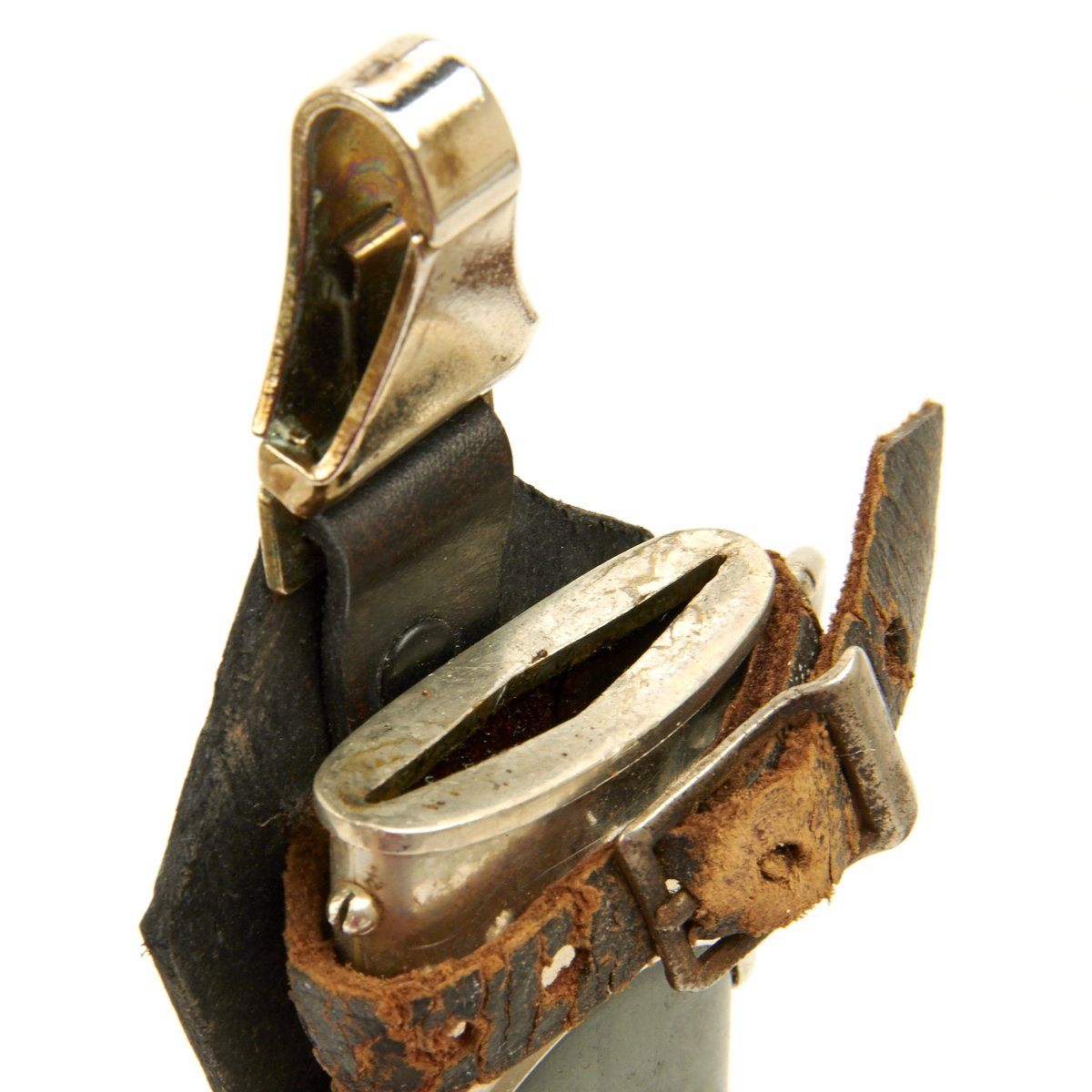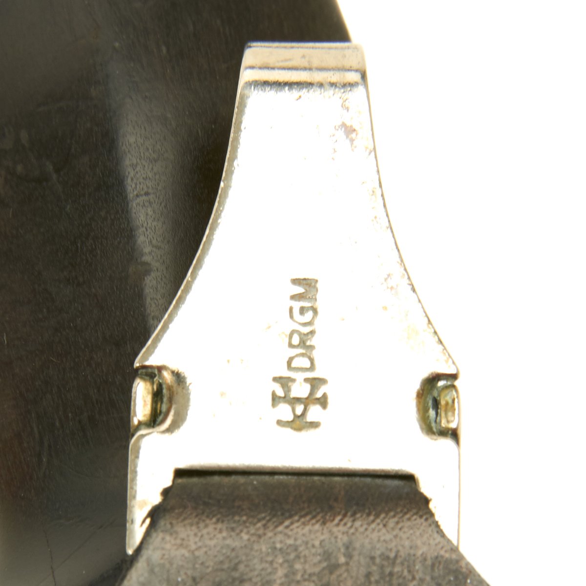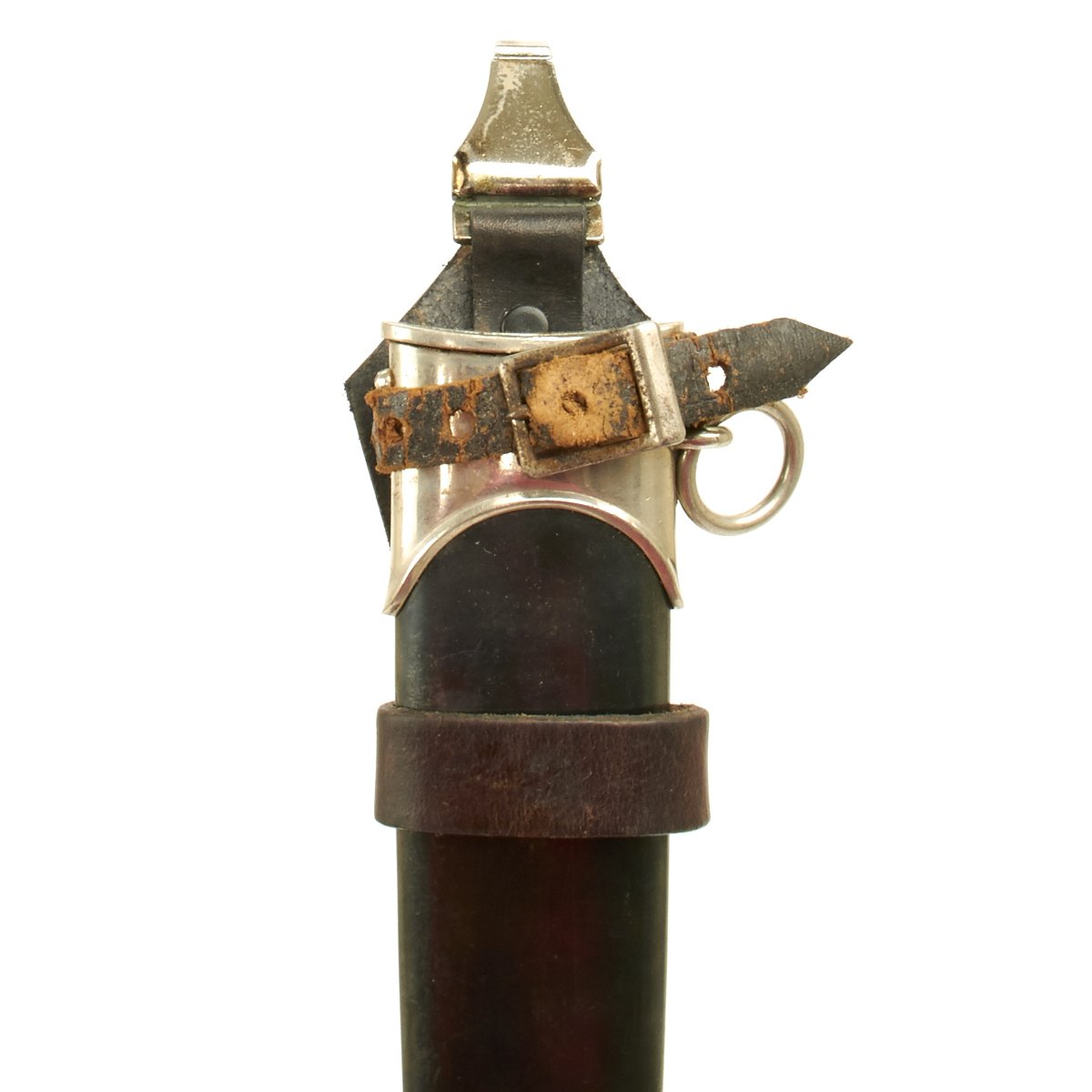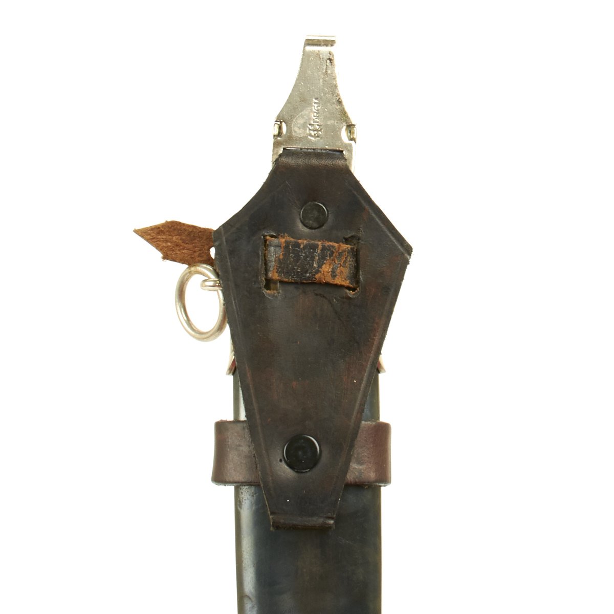 The scabbard is held securely in the extremely rare leather vertical hanger, topped with a nickel hanger clip. The leather is in good condition, though it has dried over time, and the securing strap has become somewhat delicate. The nickel clip itself is marked with a "barred A" followed by D.R.G.M. (Deutsches Reiches Gebrauchs Musterschutz) - meaning it is a protected patented design under the Reich Government. This design was registered to the owner of the "Barred A" trademark, F. W. Assmann & Söhne of Lüdenscheid, a large maker of belts, buttons, and other accoutrements.