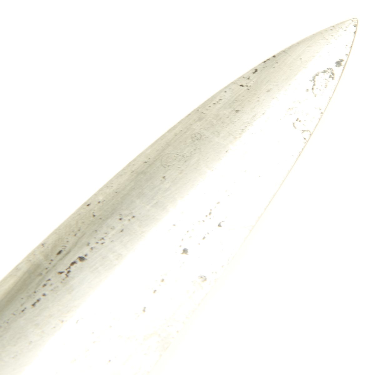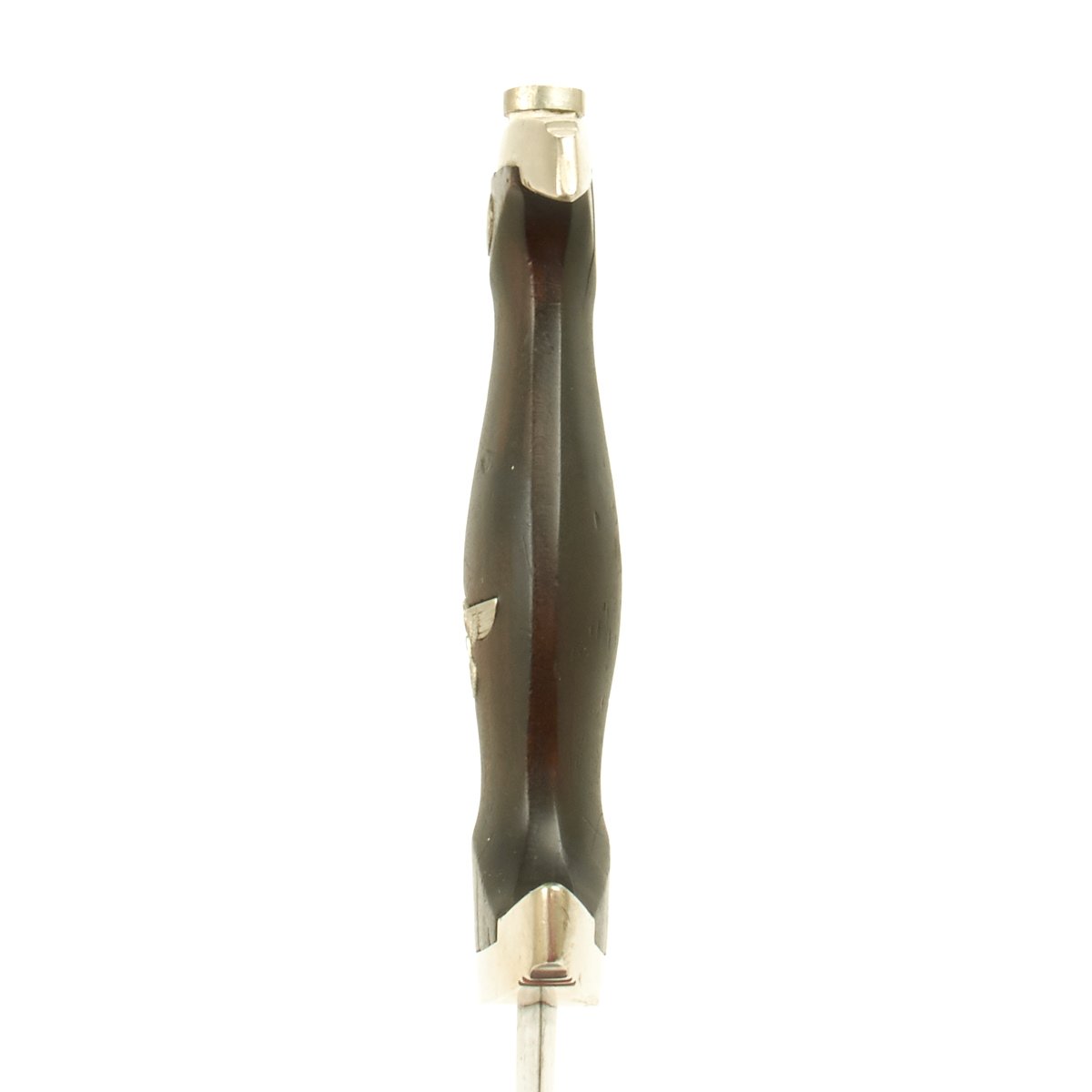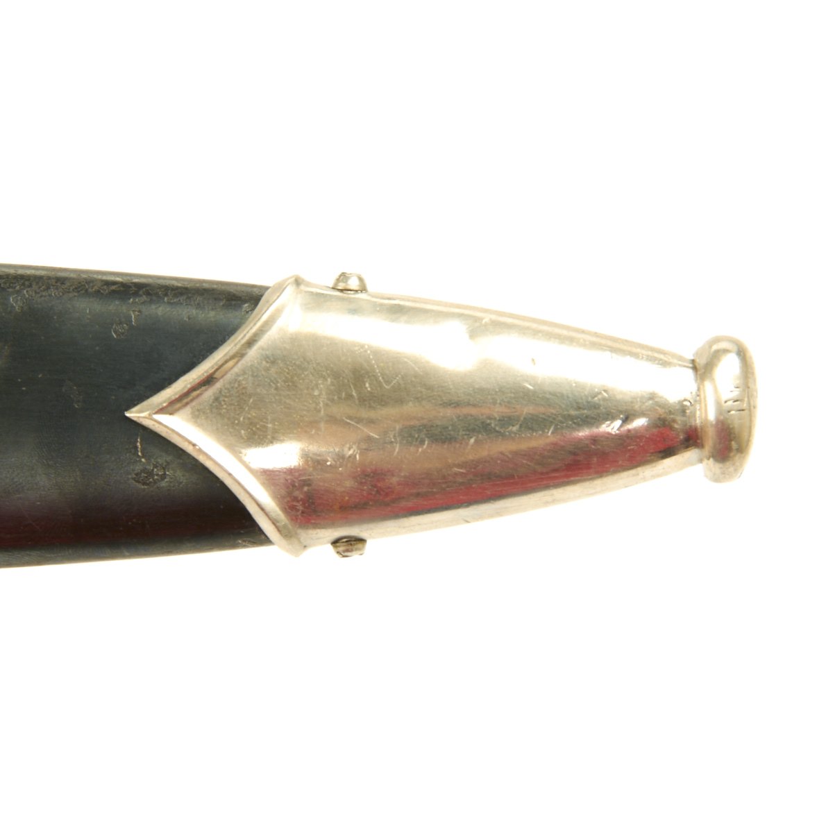 The scabbard shell is a solid example being straight as an arrow with a few small dents. The "anodizing" is mostly intact, though it shows traces of past pitting. The matching solid nickel silver scabbard mounts are in good condition. The lower ball has been crushed slightly and is split, due to the weaker nickel alloy used in early models (later ones used steel).