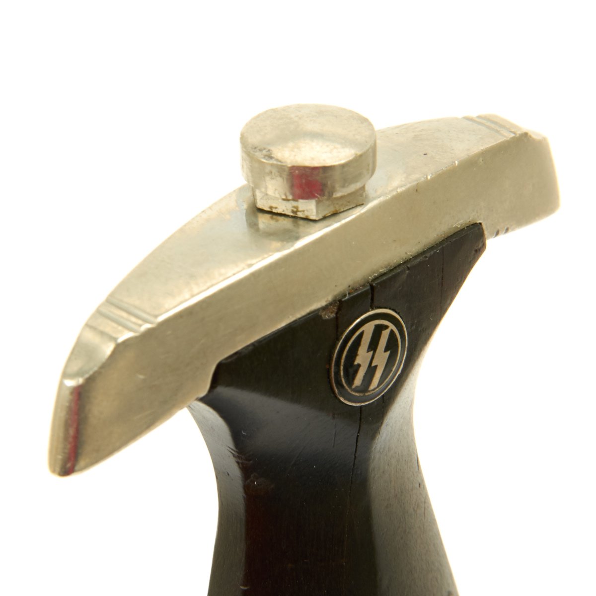 The ebony grip is a nice example showing in great shape except for some cracking and small chips near the lower edge. Early examples such as this were hand fit, which could result in cracking over time. The symbol button is positioned at about 7:00 o'clock, and the enamel surfaces are perfect. The silvered SS symbol and double circles around them have a nice matching patina with the nickel still intact. The nickel grip eagle is the "high-necked" type with the beak pointing slightly up. It remains in crisp condition, showing little wear to the bird's head, breast and wing feathering and to the talons, wreath or swas.
