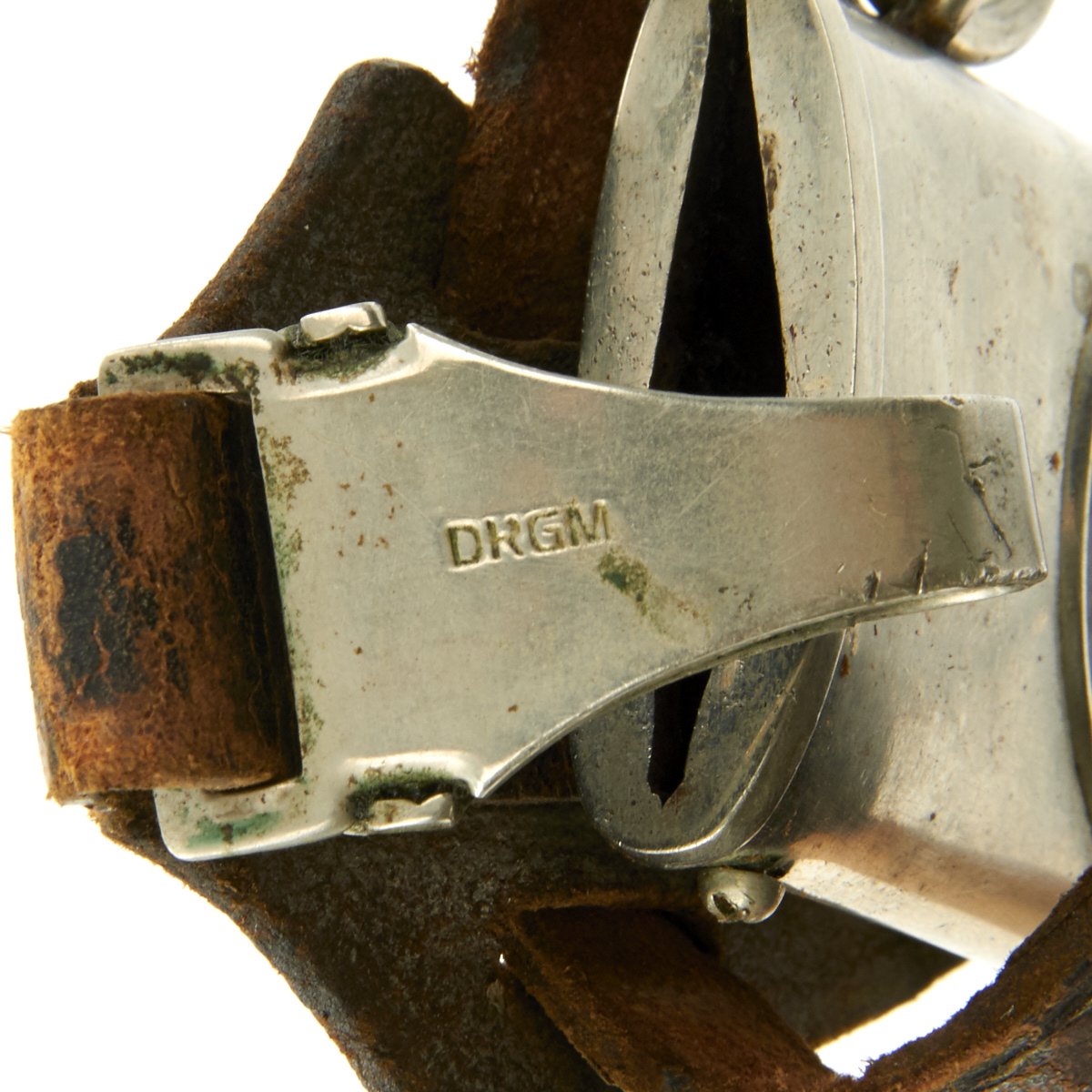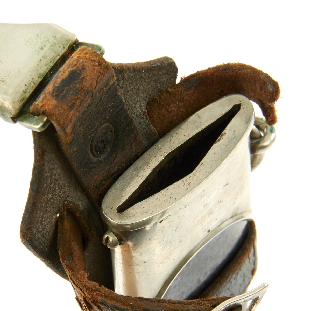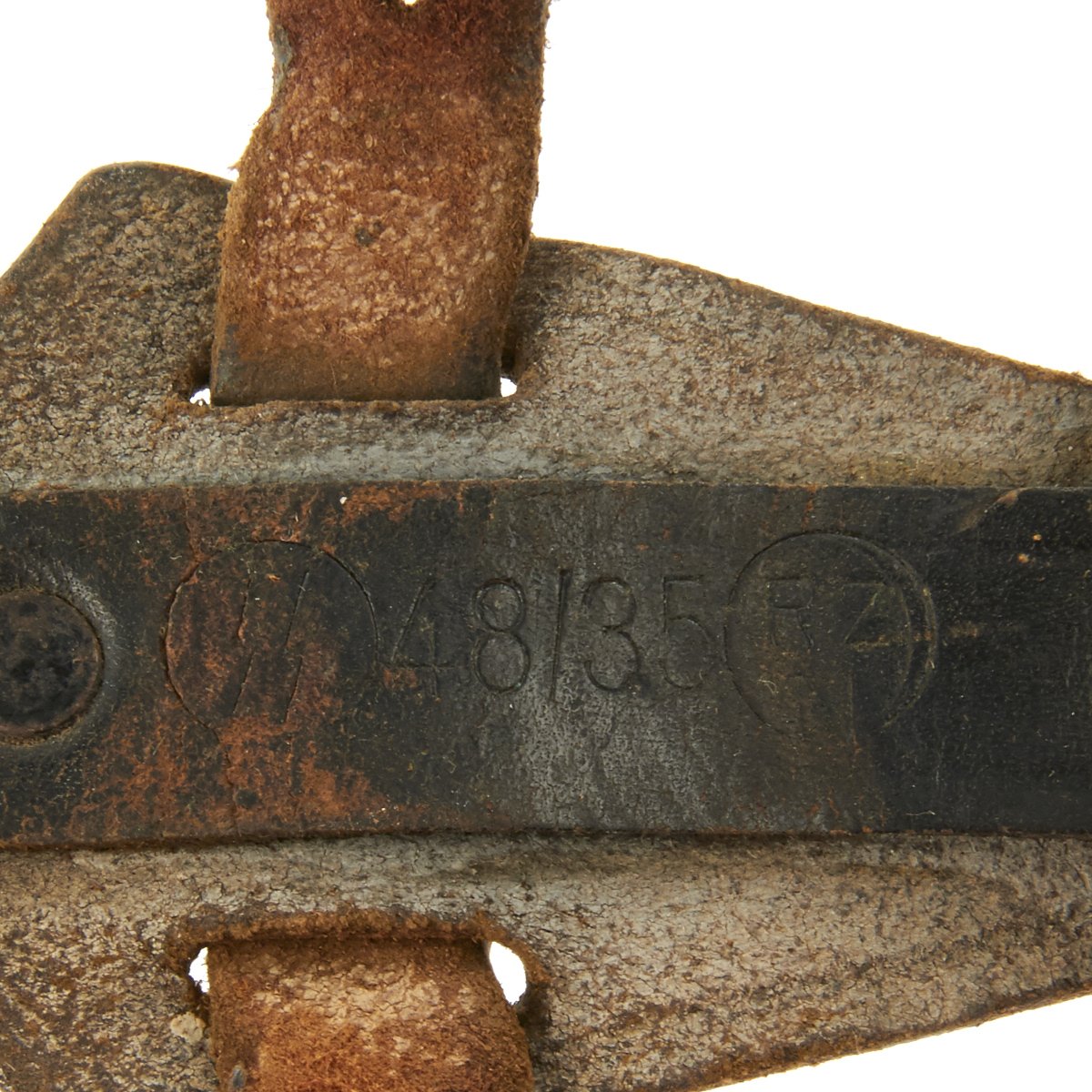 The scabbard is held securely in the extremely rare leather vertical hanger, topped with a nickel hanger clip. The leather is in good condition, though it has dried over time, and the securing strap broken. The nickel clip itself is marked with D.R.G.M. (Deutsches Reiches Gebrauchs Musterschutz) - meaning it is a protected patented design under the Reich Government. The leather is also marked (ᛋᛋ) 48 / 35 (RZM), meaning it was an officially issued vertical hanger, something we have not seen before. The SS RZM codes are different from the standard codes issued by the "Brown House", so unfortunately we cannot identify the maker, however this makes the hanger even MORE rare.