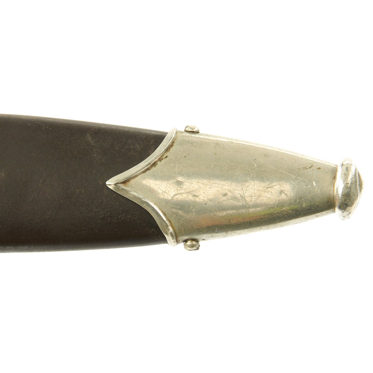 The scabbard shell is a solid example being straight as an arrow with a few small dents. The original black "anodized" finish is only really present near the throat, where the hanger protected it. The rest of the shell has faded to a dark brown oxidized patina. The matching solid nickel silver scabbard mounts are in good condition. The lower ball has been crushed slightly and is split, due to the weaker nickel alloy used in early models (later ones used steel).