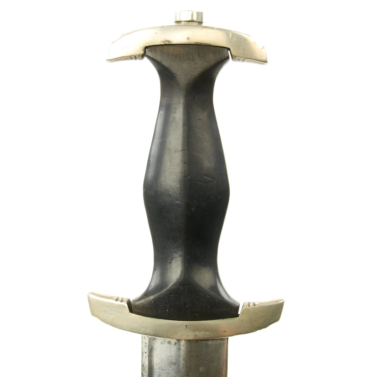 The SS Dagger was equipped with nickel crossguards with an ebony wood grip. The black grip contained a National eagle with swas insignia recessed in the center area and an SS sigrunne button inset at the top. On early examples the scabbard shell surface was factory blackened using a metal bluing process. The scabbard had nickel mounts. The SS blade was a polished type containing the SS motto, Meine Ehre Heisst Treue (My Honor is Loyalty). Early examples bore one of three district stampings on the lower reverse crossguard of I, II, or III. Early examples were mostly hand-fit. Production of later examples was more standardized, using cheaper, nickel-plated fittings with black painted scabbard shells. They could be held with a standard belt hanger, or a much rarer vertical hanger.