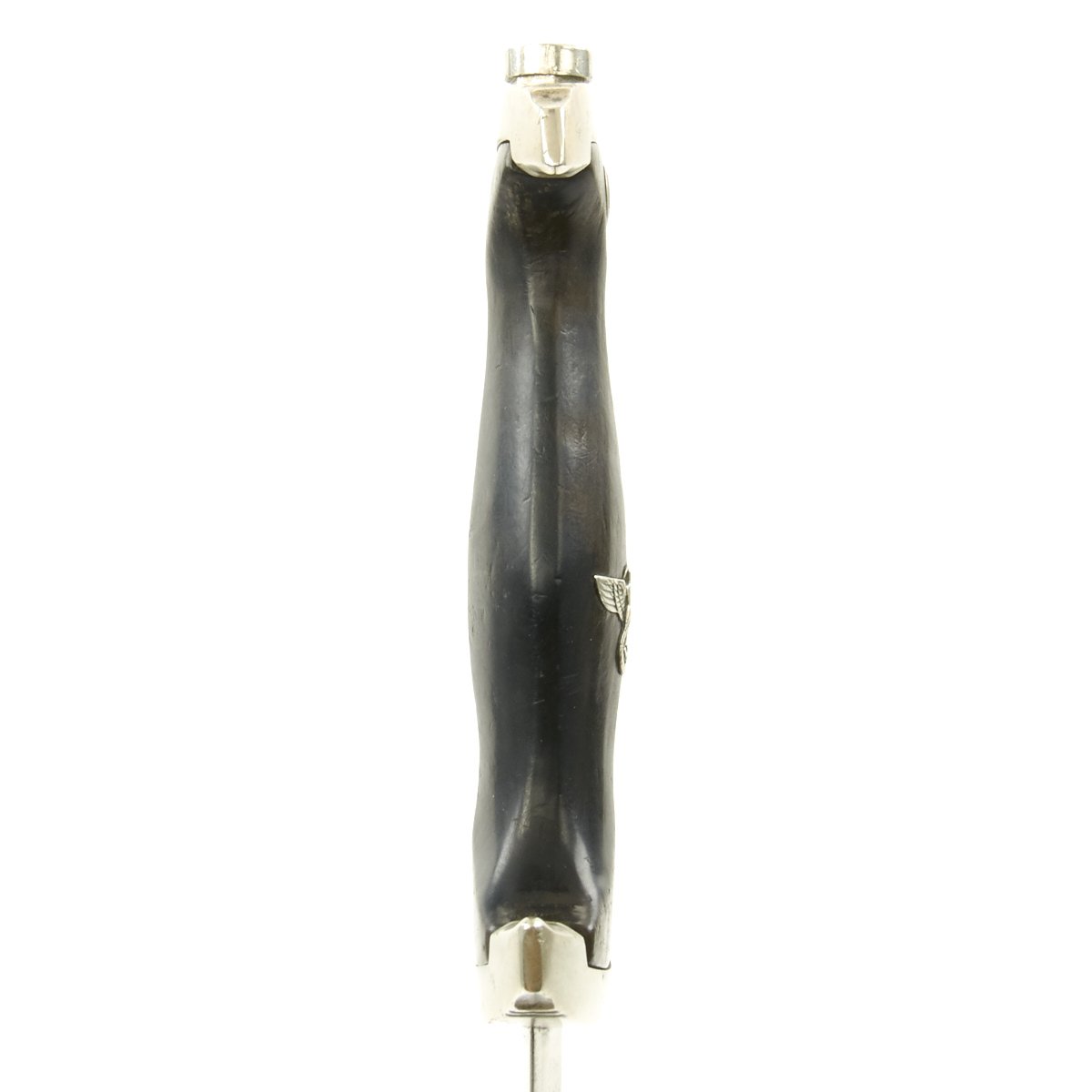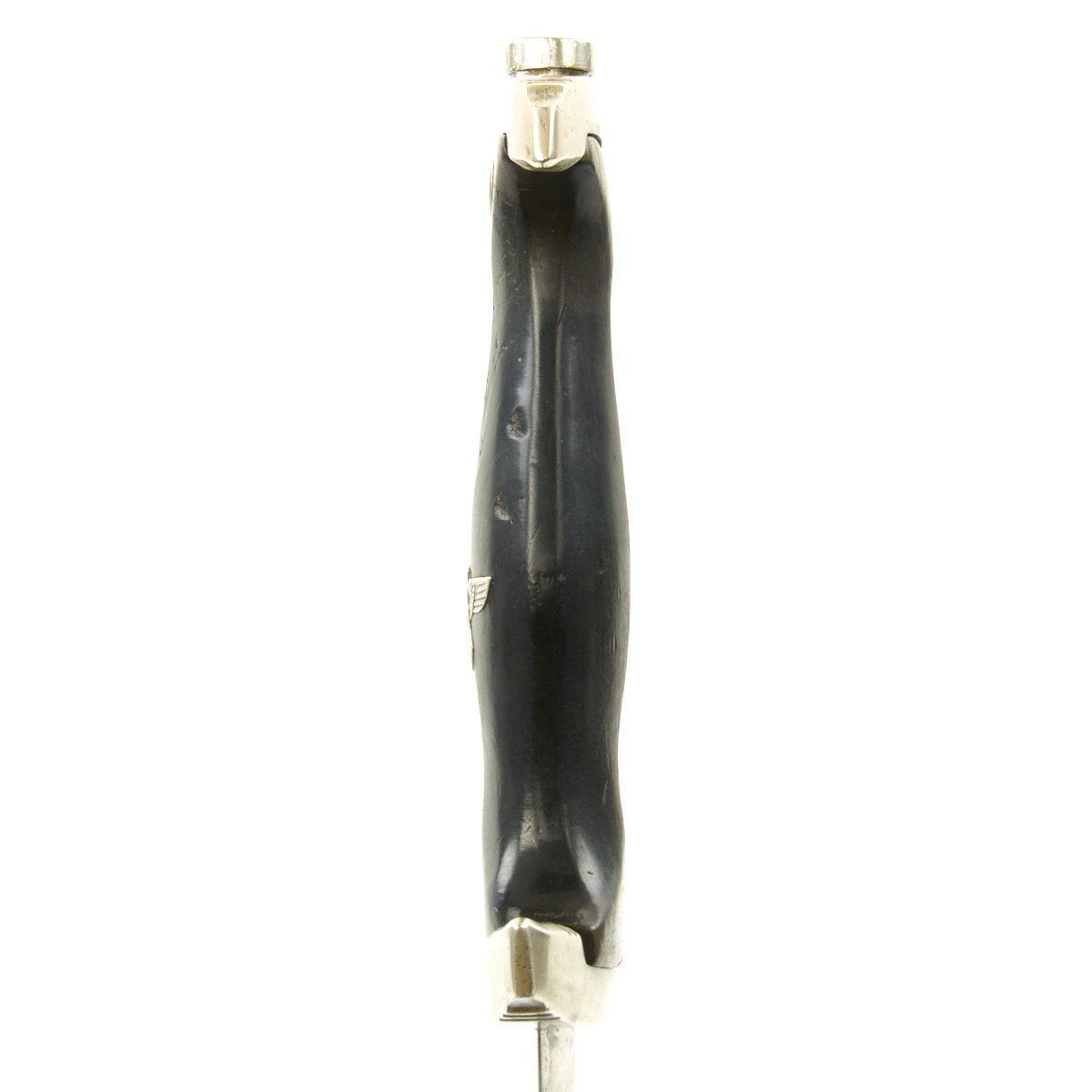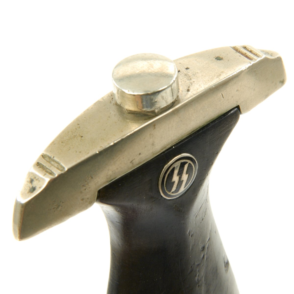 The ebony grip is a nice example showing in great shape except for a crack on the reverse near the cross guard. Early examples such as this were hand fit, which could result in cracking over time. The color is very good, and wood grain can be seen. The symbol button is positioned at about 7:00 o'clock, and the enamel surfaces are perfect. The silvered SS symbol and double circles around them have a nice matching patina with the nickel still intact, with a little verdigris. The nickel grip eagle is the "high-necked" type with the beak pointing slightly up. It remains in crisp condition, showing little wear to the bird's head, breast and wing feathering and to the talons, wreath or swas.