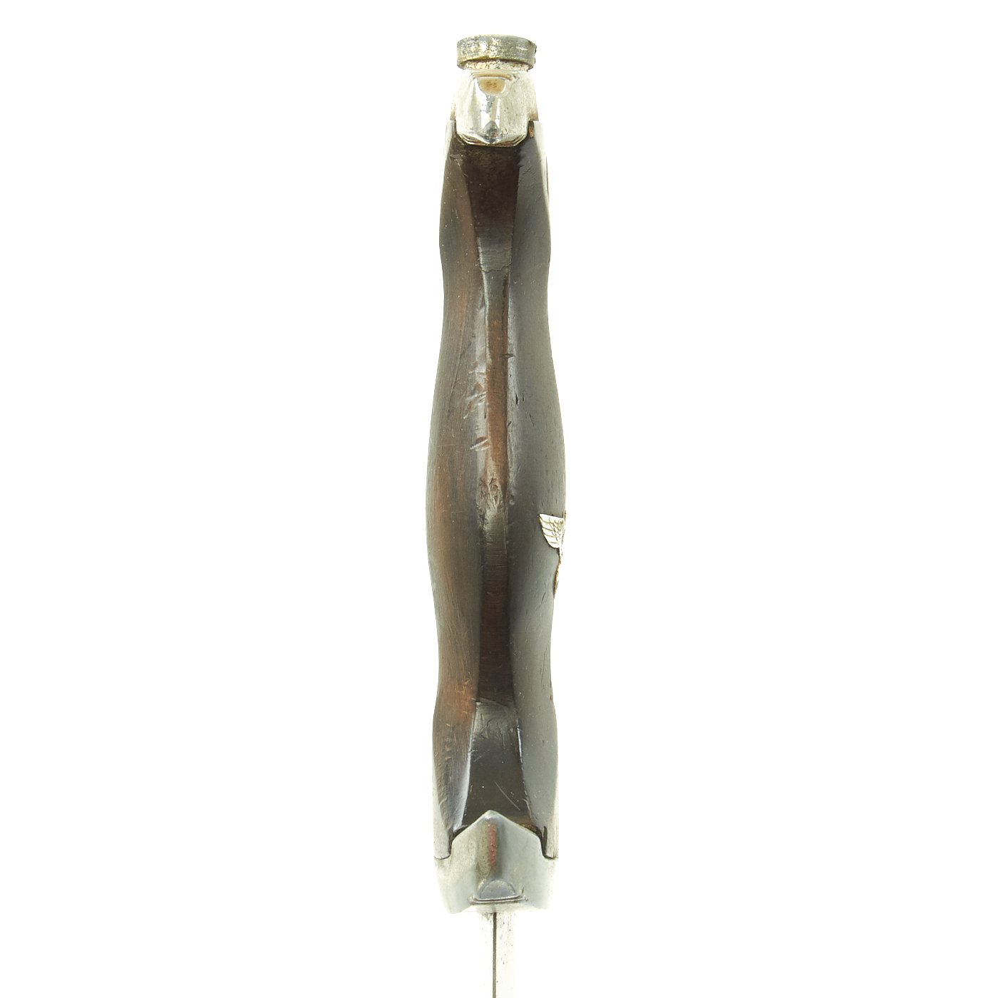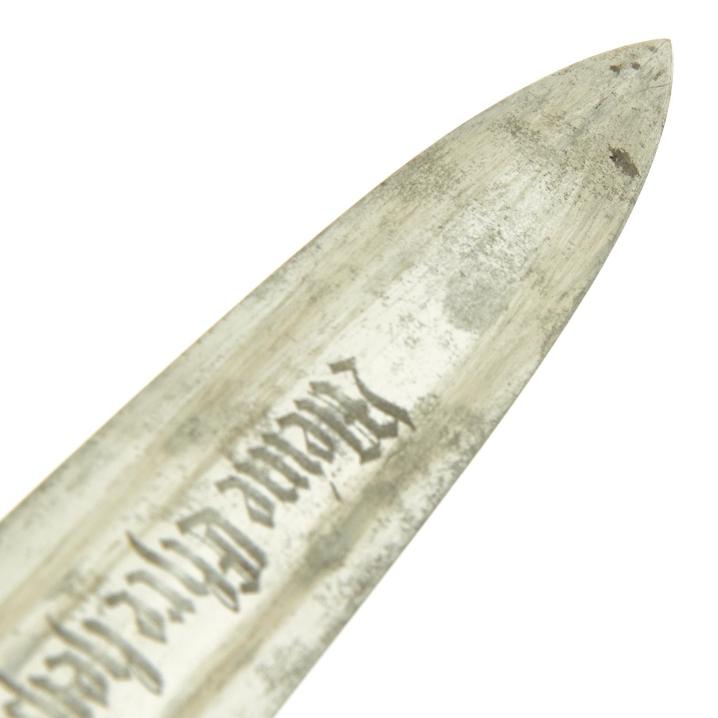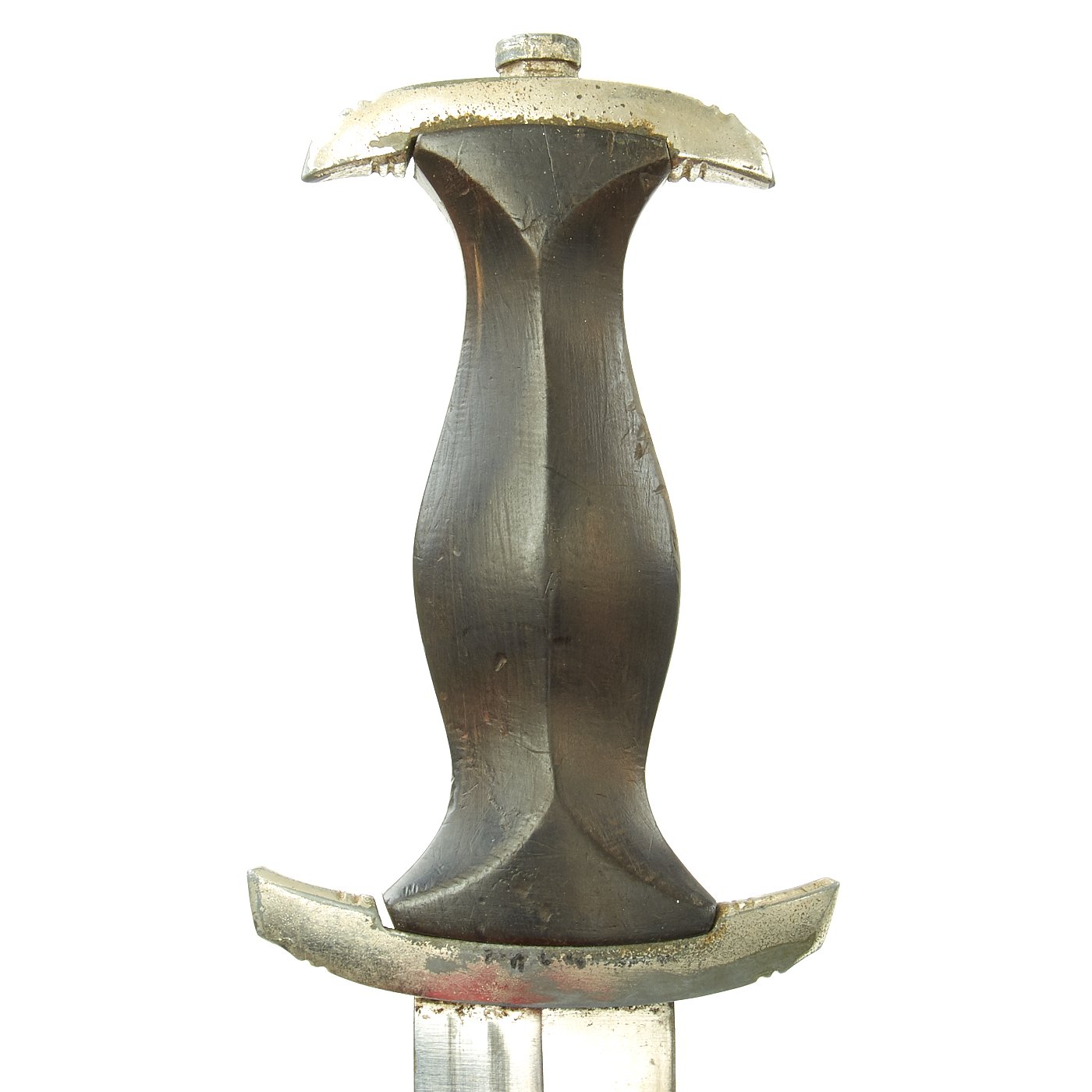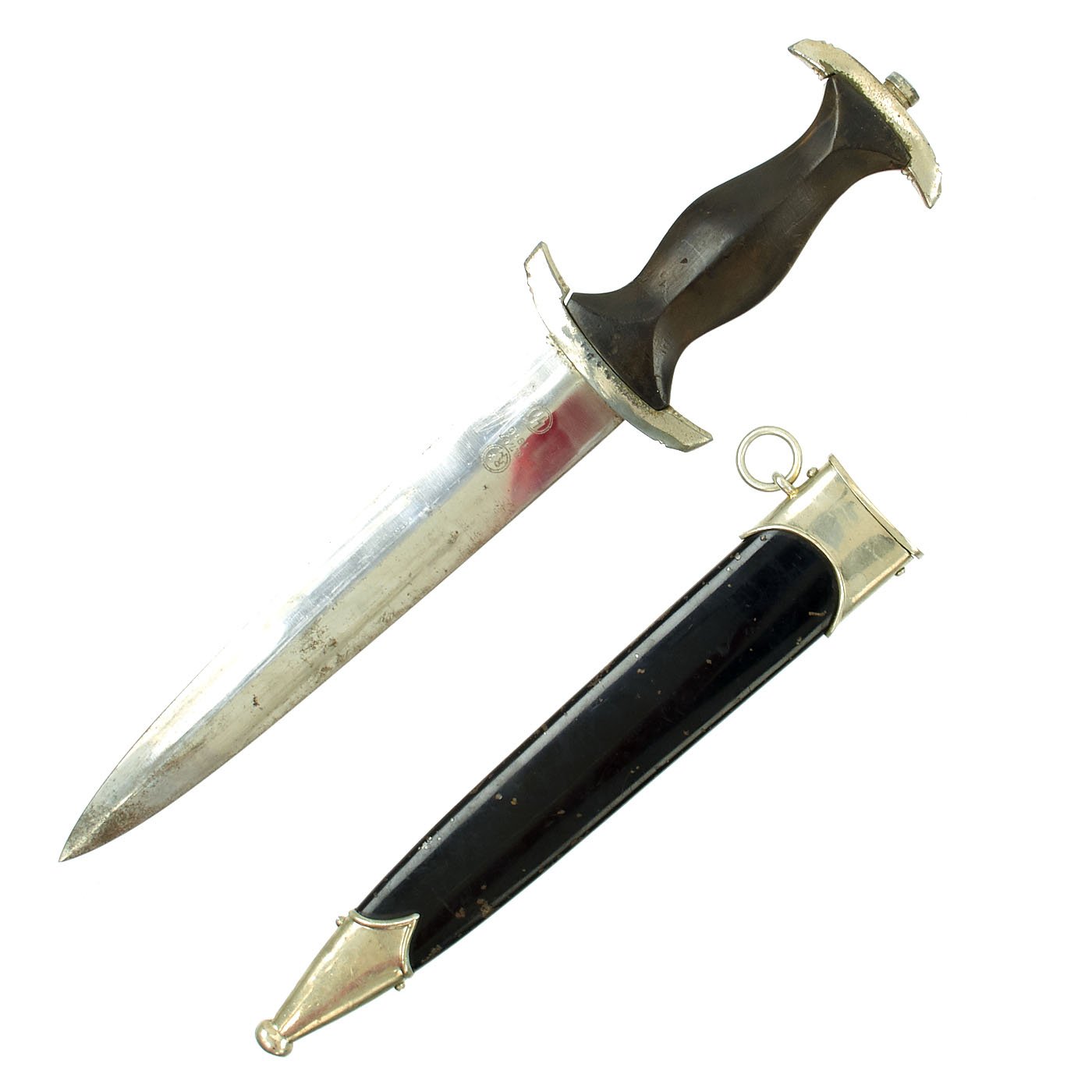 The SS Dagger was originally equipped with nickel crossguards with an ebony wood grip. The black grip contained a National eagle with swas insignia recessed in the center area and an SS sigrunne button inset at the top. On early examples the scabbard shell surface was factory blackened using a metal bluing process. The scabbard had nickel mounts. The SS blade was a polished type containing the SS motto, Meine Ehre Heisst Treue (My Honor is Loyalty). Early examples were mostly hand-fit. Production of later examples was more standardized, using cheaper, nickel-plated fittings with black painted scabbard shells. They could be held with a standard belt hanger, or a much rarer vertical hanger.