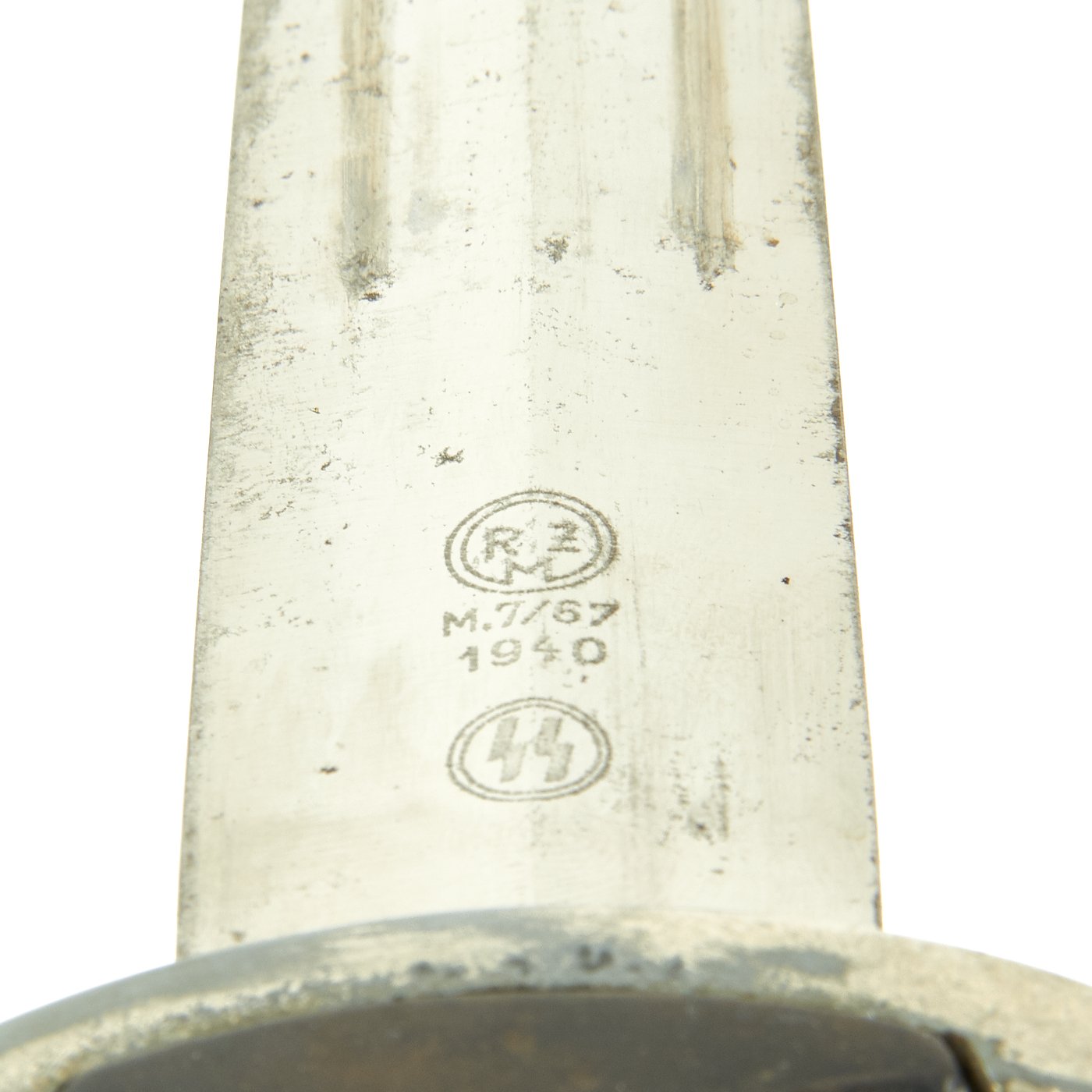 This marking indicates the dagger was made by RZM Dagger contractor "67" in 1940, which records show is a very rare maker: Gottlieb Hammesfahr & Co. AG, Nirosta-Werk, Stahlwarenfabrik und Gesenkschmiederei (Stainless Steel Factory, Steel goods factory and drop forge), in the Foche area of Solingen. This is a known producer of SS daggers during the Pre-WWII period and after.