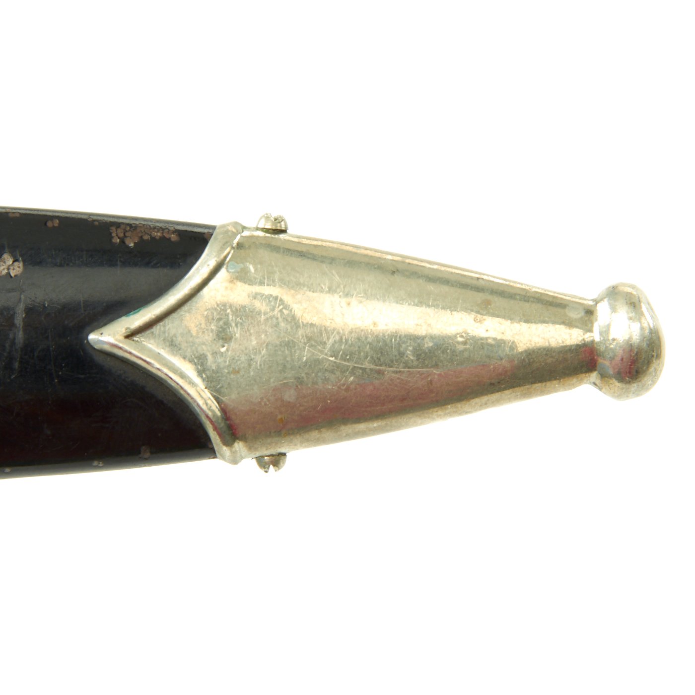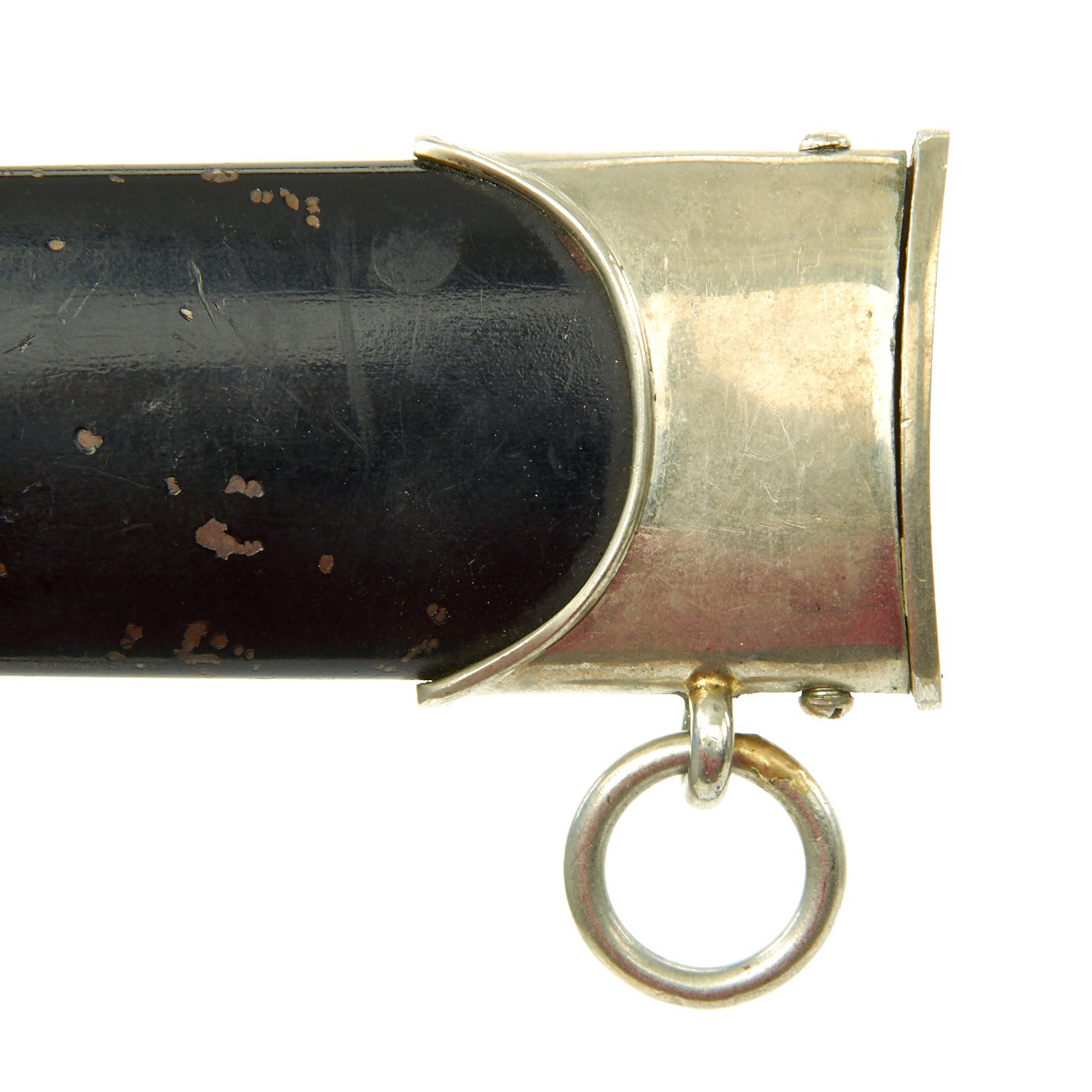 The scabbard shell is a solid example, being straight, with very little damage of any kind. It is the correct black enamel paint finish, with the expected crazing an checking from age. There are some areas where it is missing, showing the steel base metal, some of which is oxidized. The matching nickel plated steel scabbard mounts are in very nice condition. The lower ball is only slightly dented, typical of the stronger steel alloy. All four dome head screws are intact,and present. There is definitely wear to the plating on the fittings, but nothing out of the ordinary.