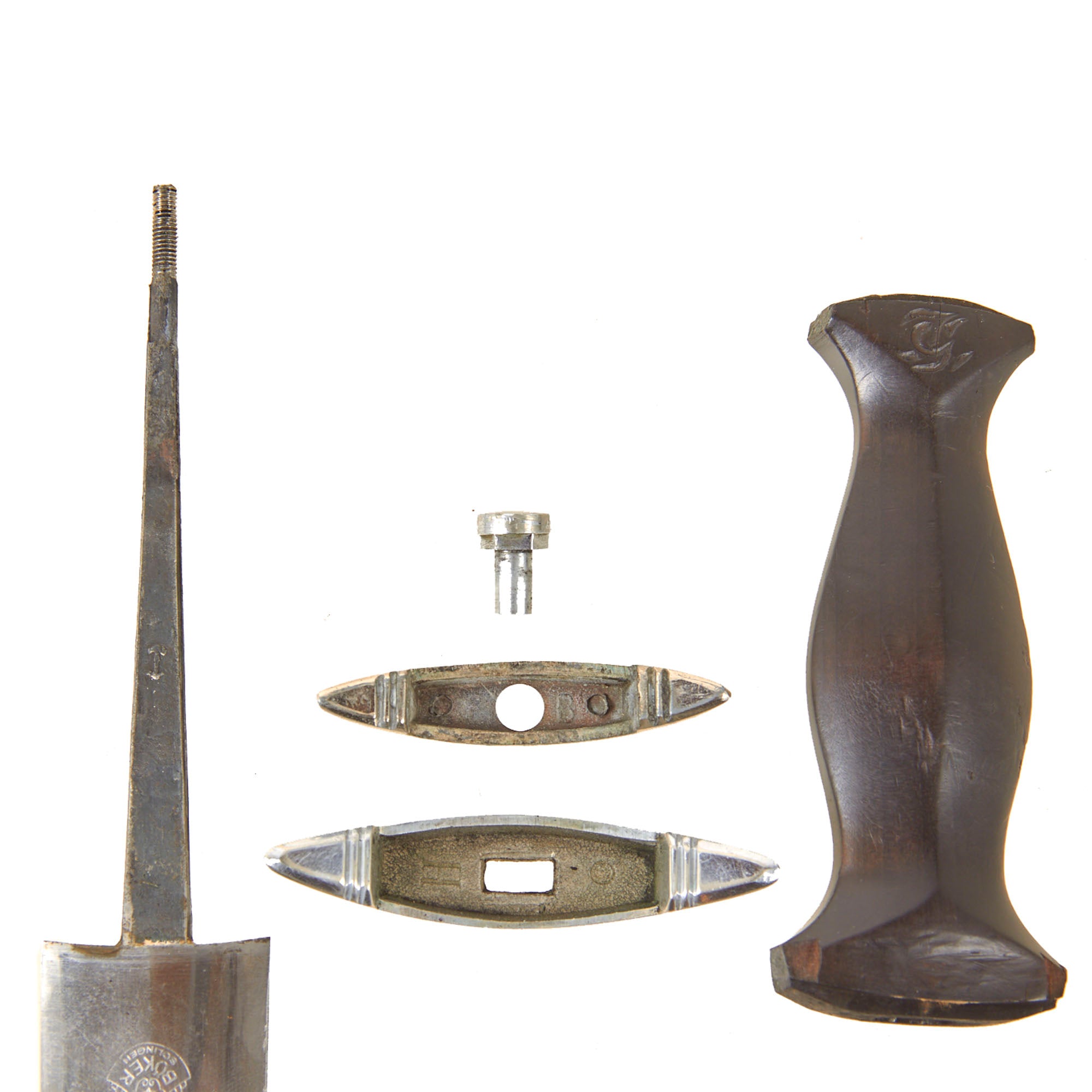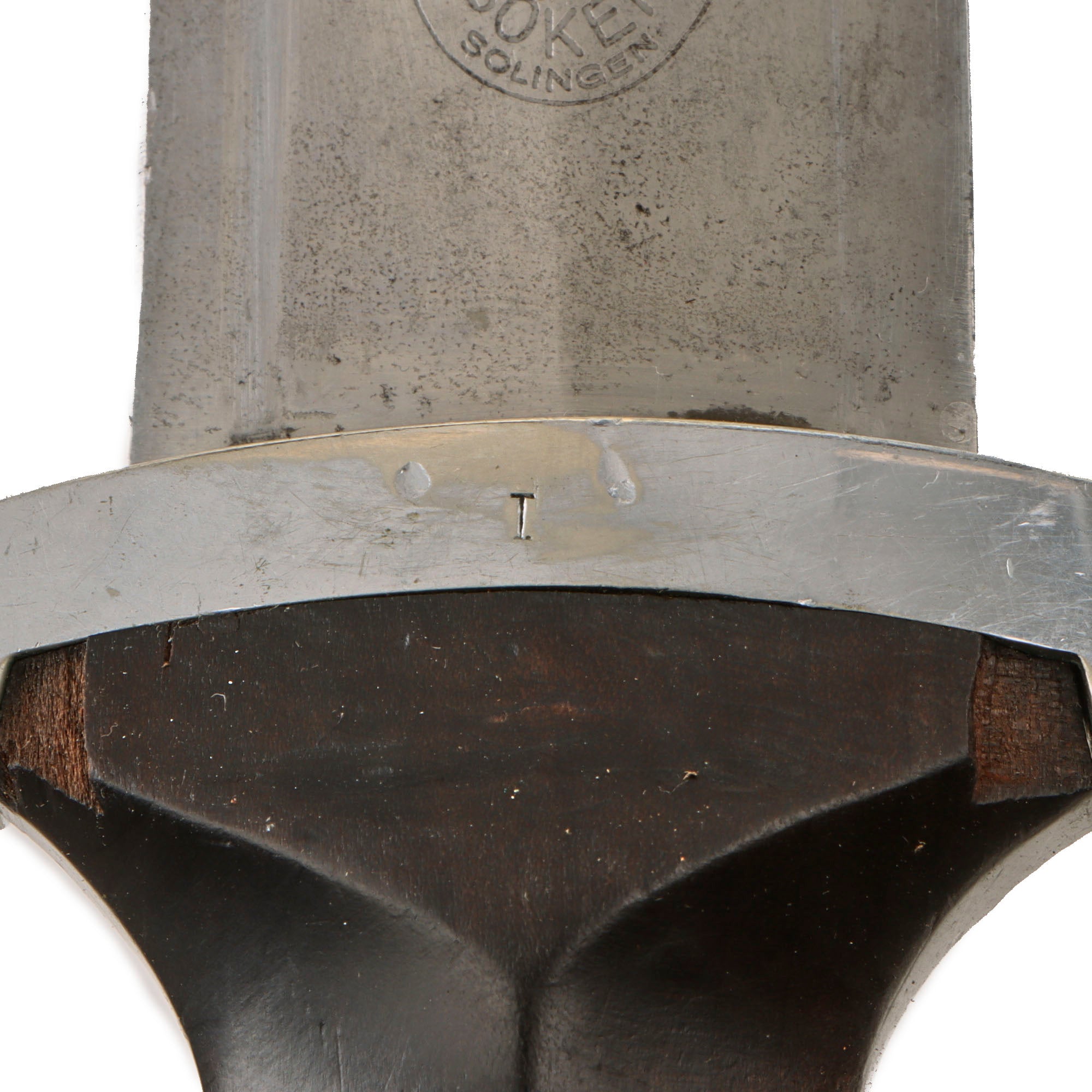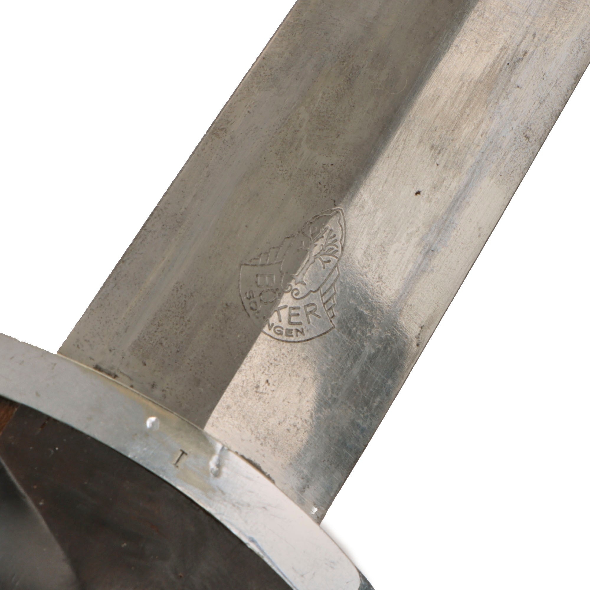 The blade is marked on the reverse with the Heinrich Böker & Co., Baumwerk famous "framed" Baum (Tree) trademark logo, with BÖKER / SOLINGEN at the bottom. The company is a famous and desirable manufacturer, founded in 1869 in Solingen, the legendary "City of Blades" in western Germany. They were a known producer of SS daggers during the Pre-WWII period and after, and we have had several examples from Böker before. The company exists today, and has a long and storied history of top quality blade production. Knives made by this maker are highly desirable, and extremely rare on the market. For more information please see GERMAN KNIFE AND SWORD MAKERS by J. Anthony Carter.