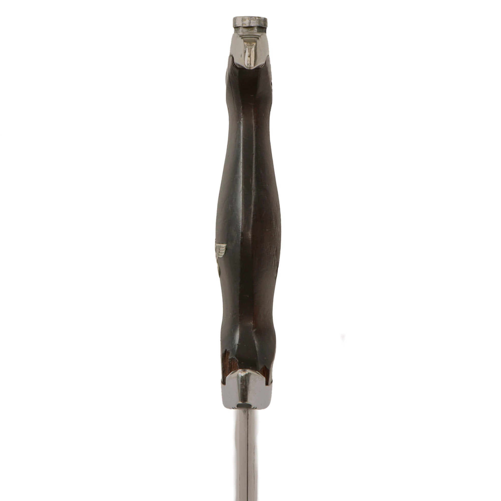 The ebony grip is a good example showing a great color and grain, however like many we see has suffered from chipping and cracking next to the guards. The ebony wood is unfortunately brittle, and the treatment used to give it a uniform look exacerbates this. The front of the grip shows some large chunks missing near the cross guard, and there is some cracking and a small chip underneath the insignia near the pommel guard. The reverse shows cracking near the pommel guard, and more chipping near the cross guard, with an area that looks to have been sanded down. We also noticed what looks to be a runic symbol or initials carved into the back of the grip by the pommel.