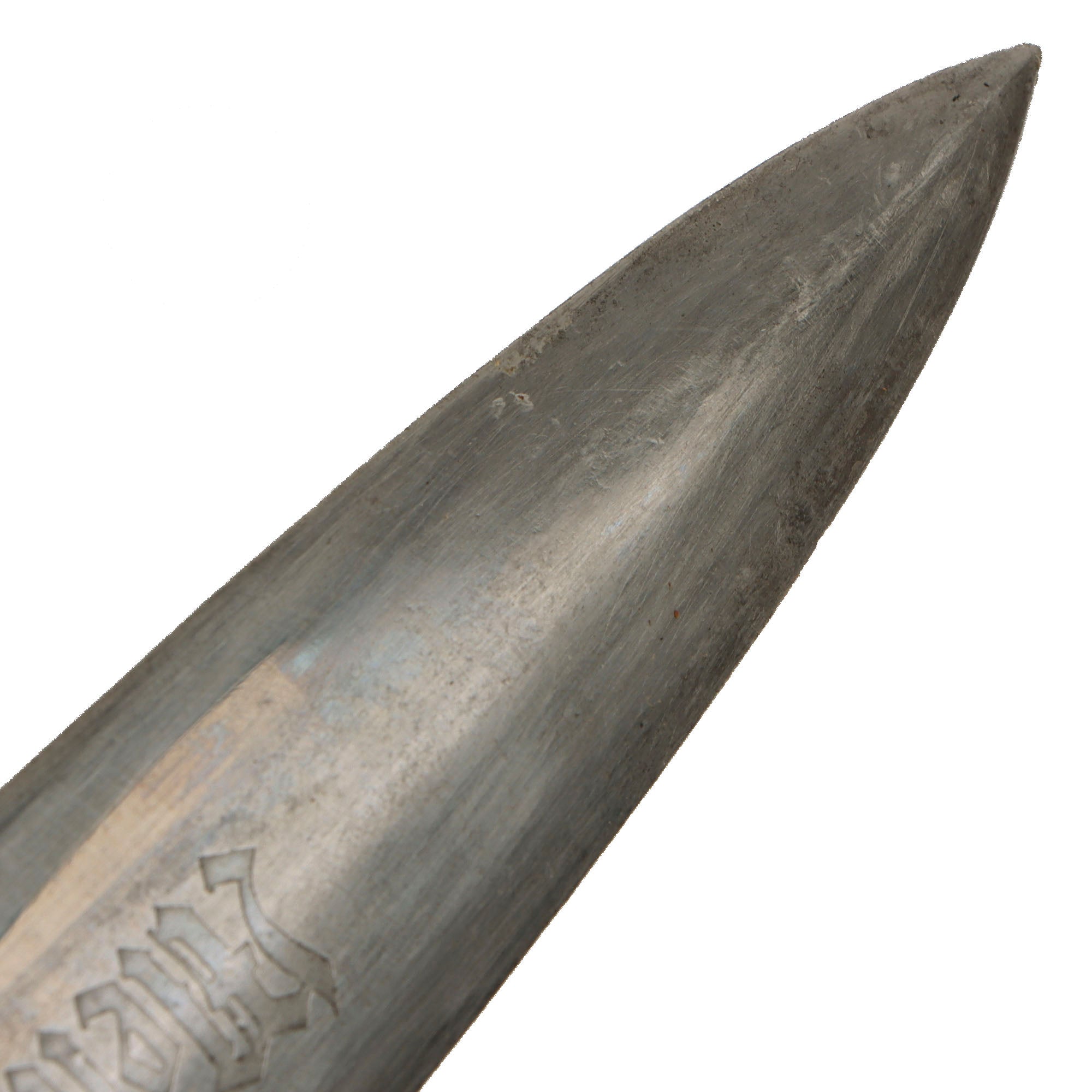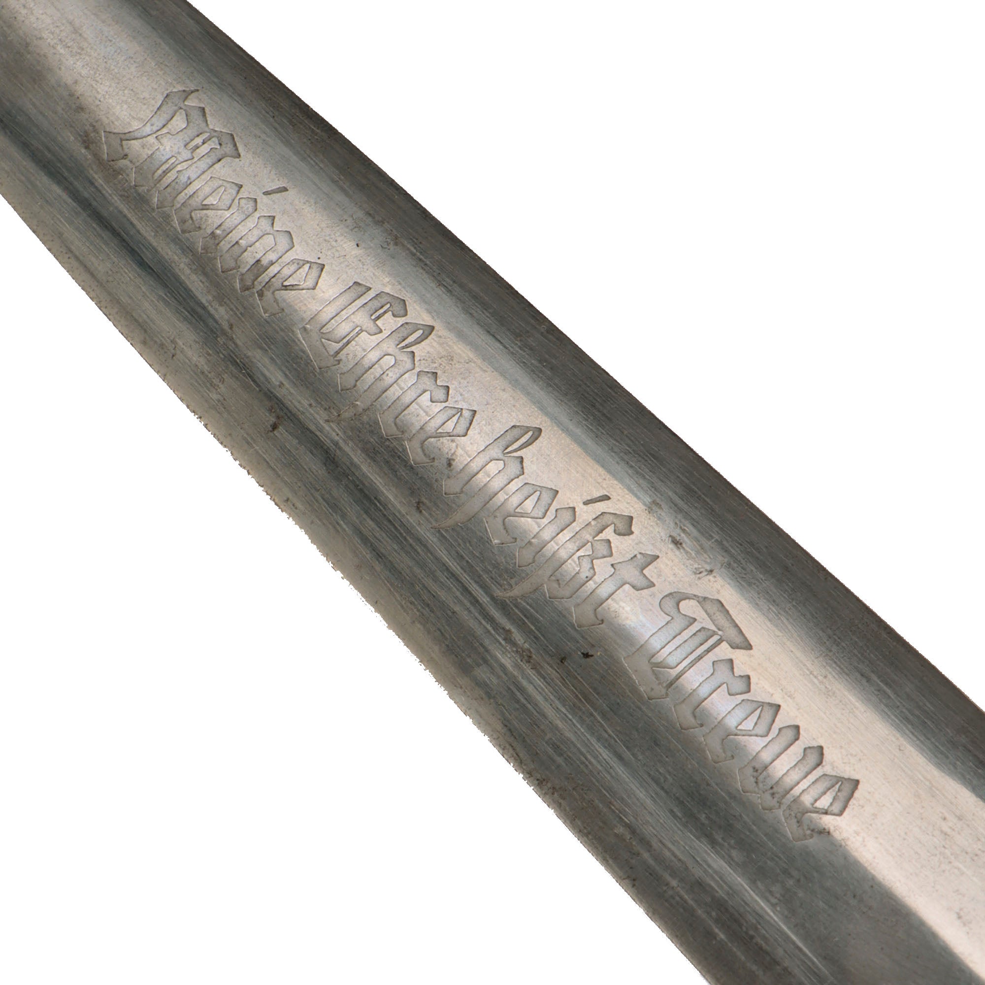 The blade on this example is in very good condition, definitely well above average for what we usually see on early SS daggers such as this. It still retains the original factory final grind cross grain throughout the blade, though it is faint in some areas. This texture is iconic, and is the definitive identifying characteristic for a real WWII German Blade. There is some wear from the runners, present on virtually every German dagger blade, as well as some wear from cleaning. We can also see a water stain on the middle rear from the runners, which has been polished out. The edge is correctly unsharpened, with just a bit of roughness in areas. The etched SS motto, Meine Ehre heißt Treue (Loyalty is my Honor) is still fully visible, but cleaning has removed all of the factory darkening. The blade shoulders perfectly meet the lower crossguard contour, and is solid in the grip.