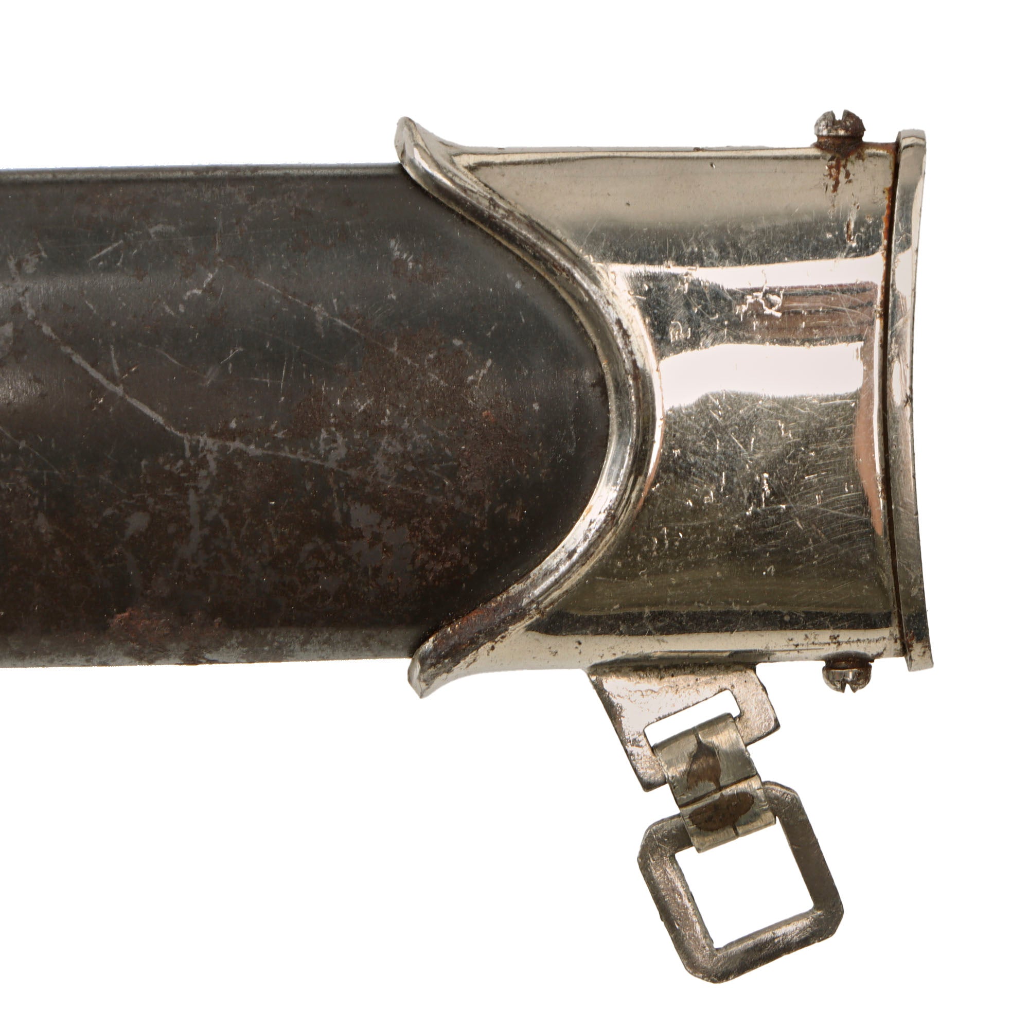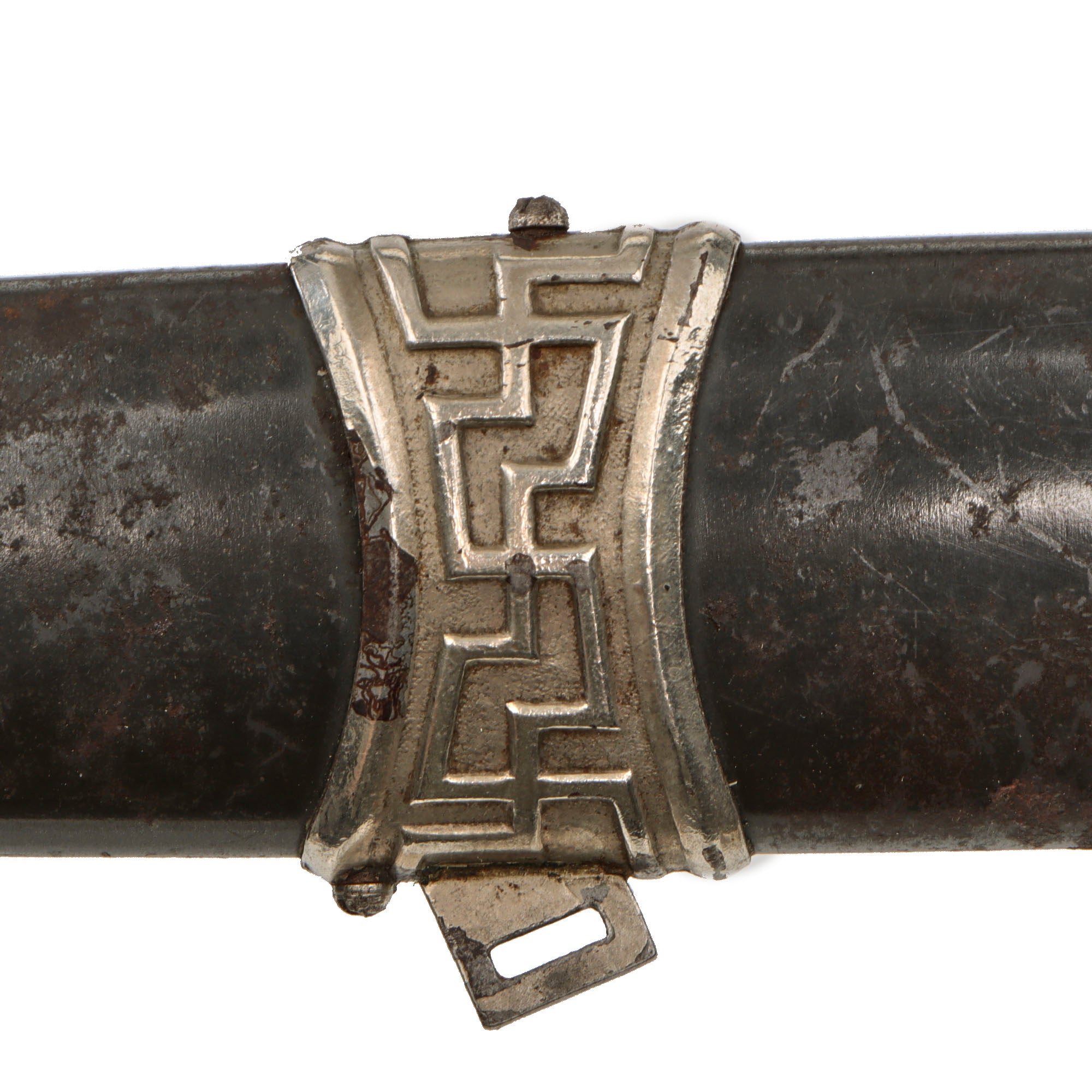 It is fitted with a nickel plated steel center ramp with screws on both sides of the scabbard. This style has the three raised intertwined swas (hook cross) designs on both sides relatively shallow and smoothly executed compared to the single screw type. The chape and locket fittings are both nickel plated steel, and are in good condition, showing wear and plating loss. The chape fitting has some denting on the bottom ball, where the plating has flaked away, allowing the steel to oxidize, but the rest still has the plating present. All six retaining screws are present, and match in design on all three fittings. The fittings for the attachment of a chain are still both present and intact, showing light wear, and the upper fitting still has a single spacer from the chain present. We noticed that scabbard runners are either very worn or were possibly removed at some point, as it does not grip the blade much at all.