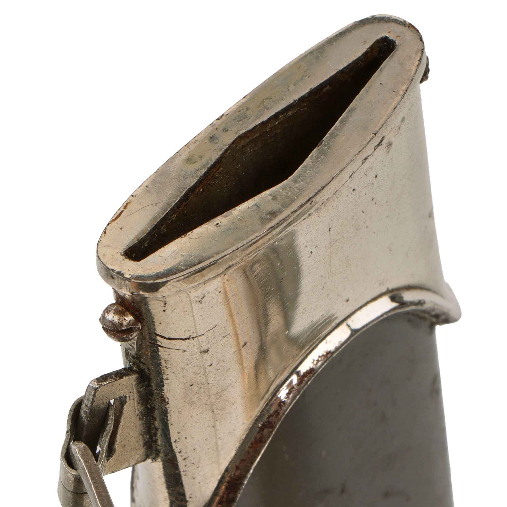 Additionally, the chained center "ramp" and top fittings, chains, and "Wotan's knot" end clips all had several different patterns, and could be combined with either "anodized" or enameled steel shells. The bottom fittings could be solid nickel alloy or plated steel. To further complicate things, the various "Types" were produced concurrently. For more information on this please see Exploring The Dress Daggers and Swords of the German ᛋᛋ by Thomas T. Wittmann.