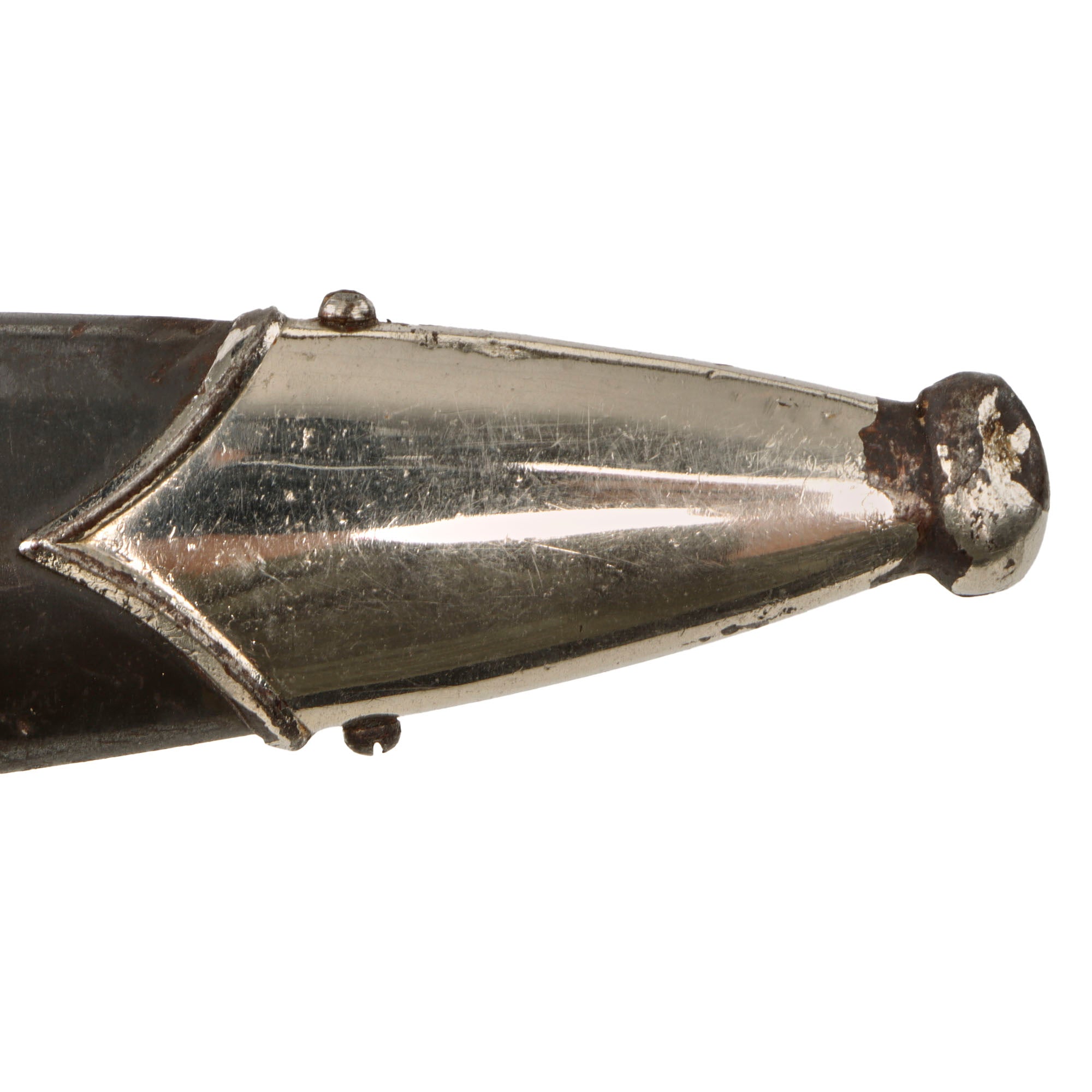 This very nice early SS M33 Dagger was produced by the rare and desirable firm of Heinrich Böker & Co. of Solingen. This is a known producer of SS daggers during the Pre-WWII period and after. The owner was awarded it during the early NSDAP period, and either was an officer at the start, or later was promoted, when they were able to order a scabbard or just the fittings to equip it with a Type II Chain, which was unfortunately then removed.