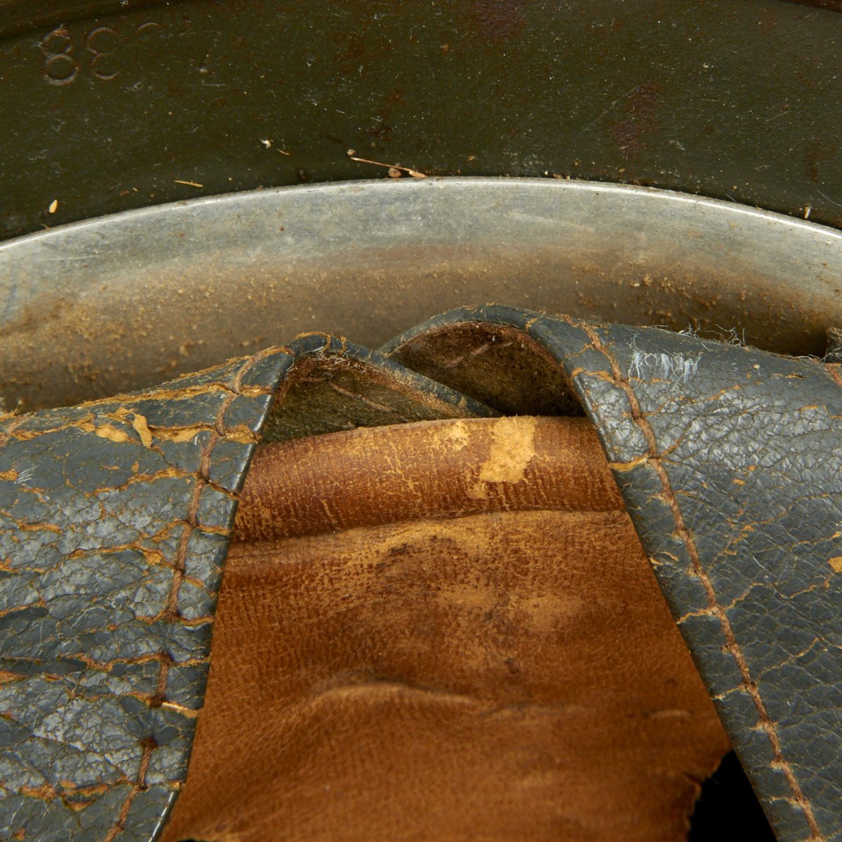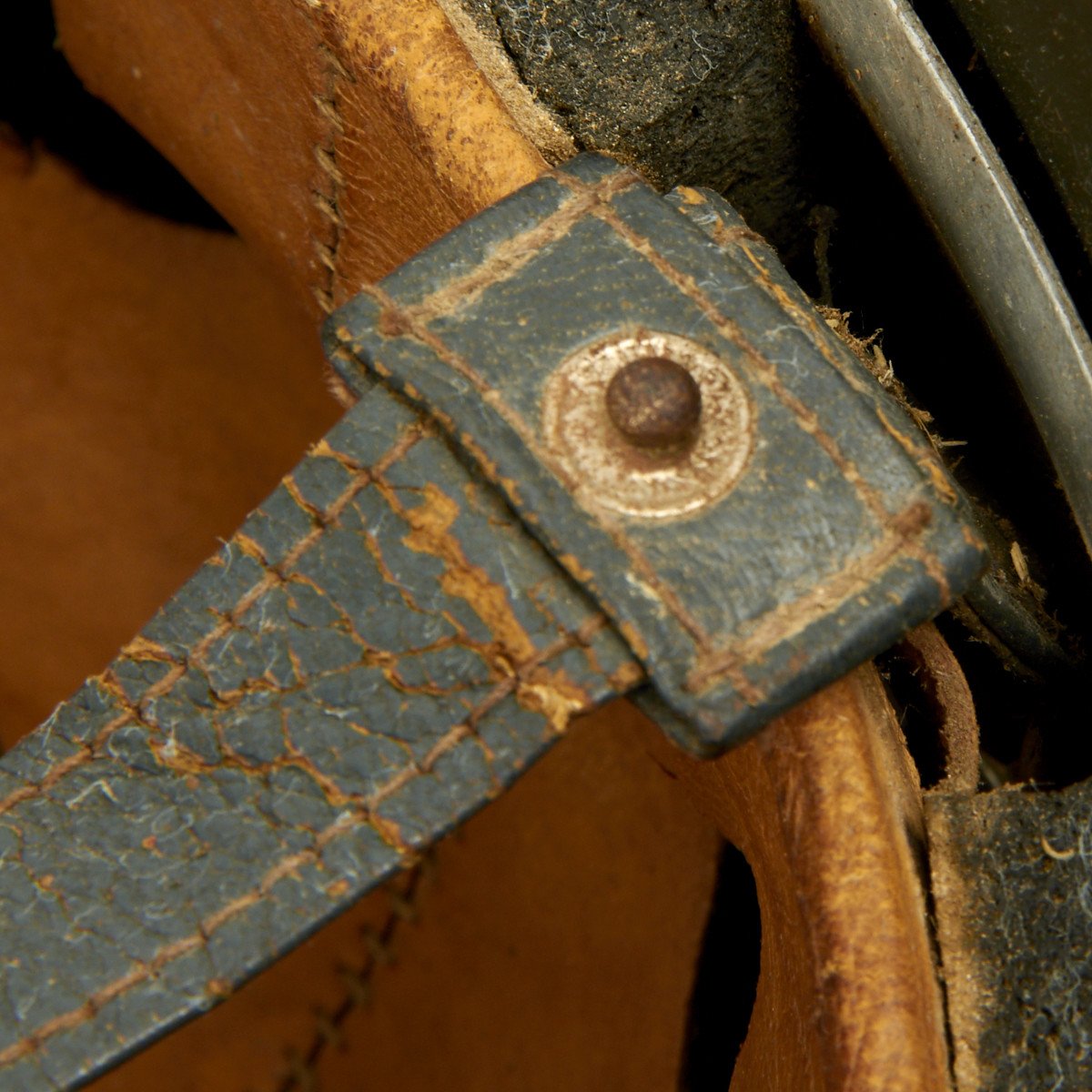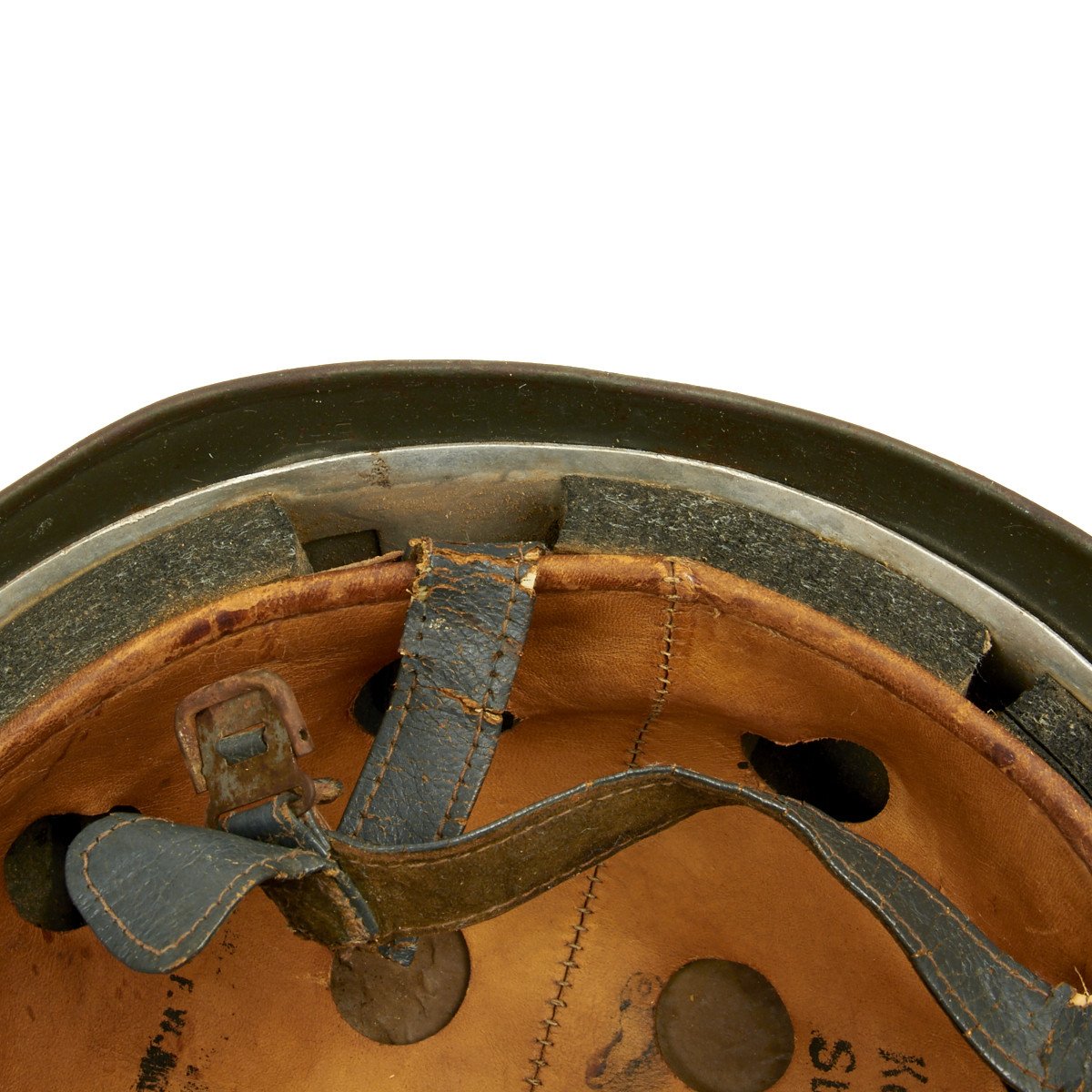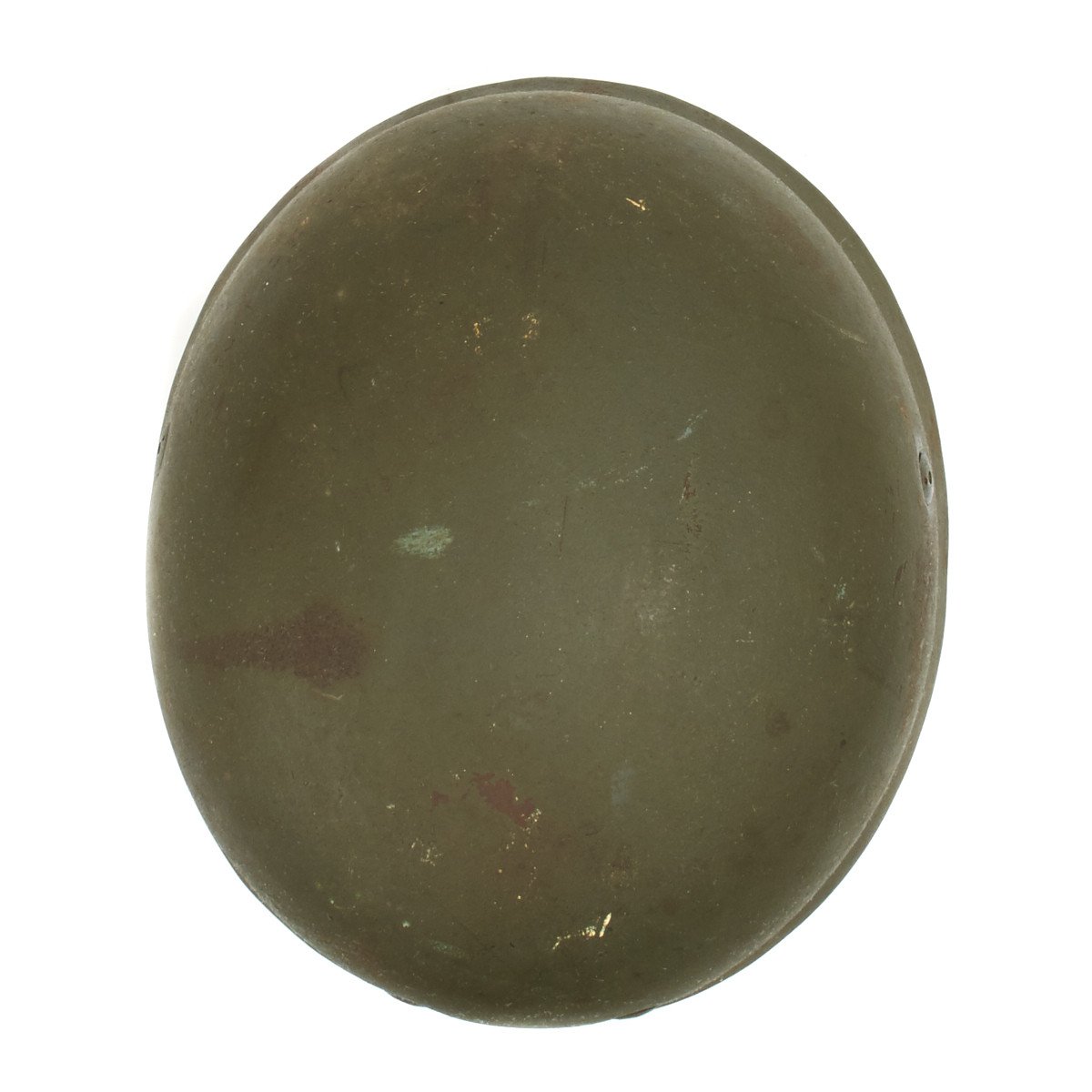 Seen between the liner band the liner itself are the complete seven charcoal foam pads; the entire assembly is attached to the shell via four correct wartime original bolts.