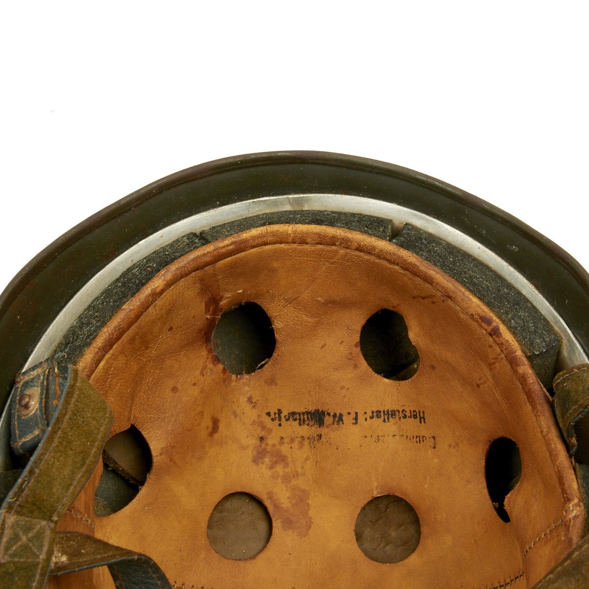 The interior features a soft, brown leather liner is size 58. It is well marked and produced by Heisler. It is nicely ink stamped with maker and size markings of the liner (58) and the shell (71) as follows: